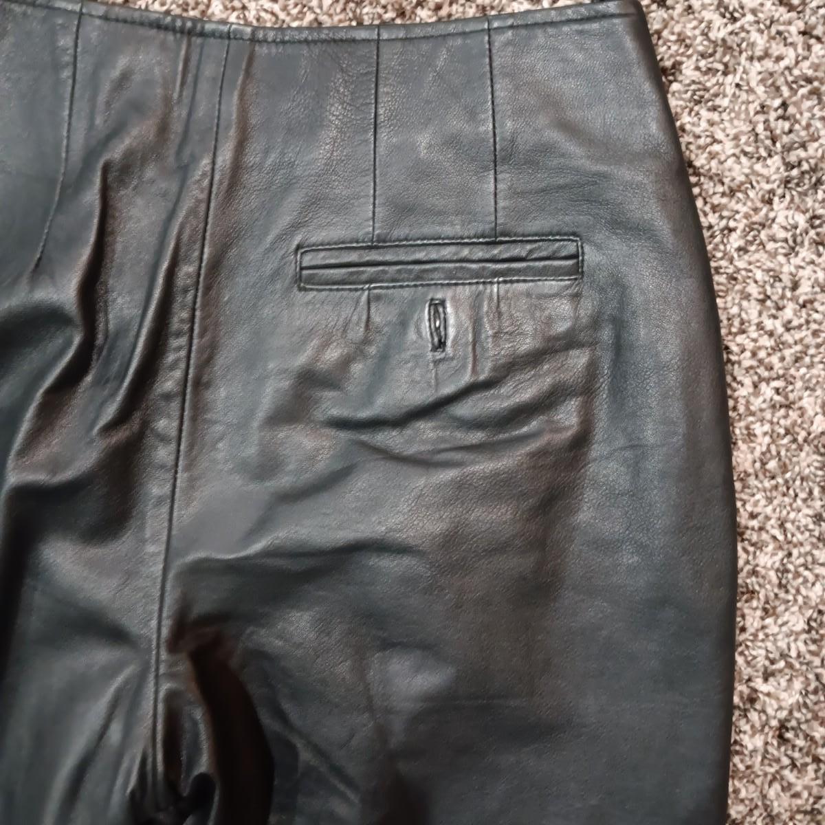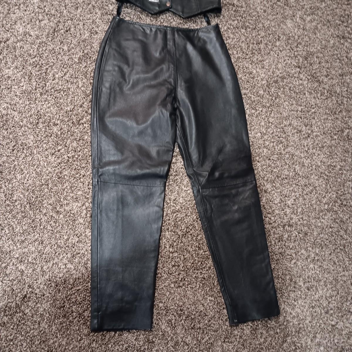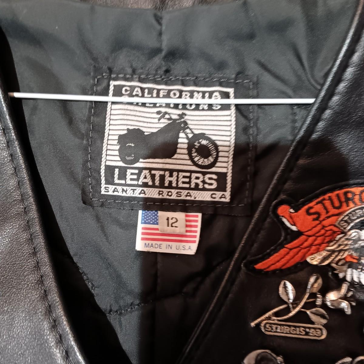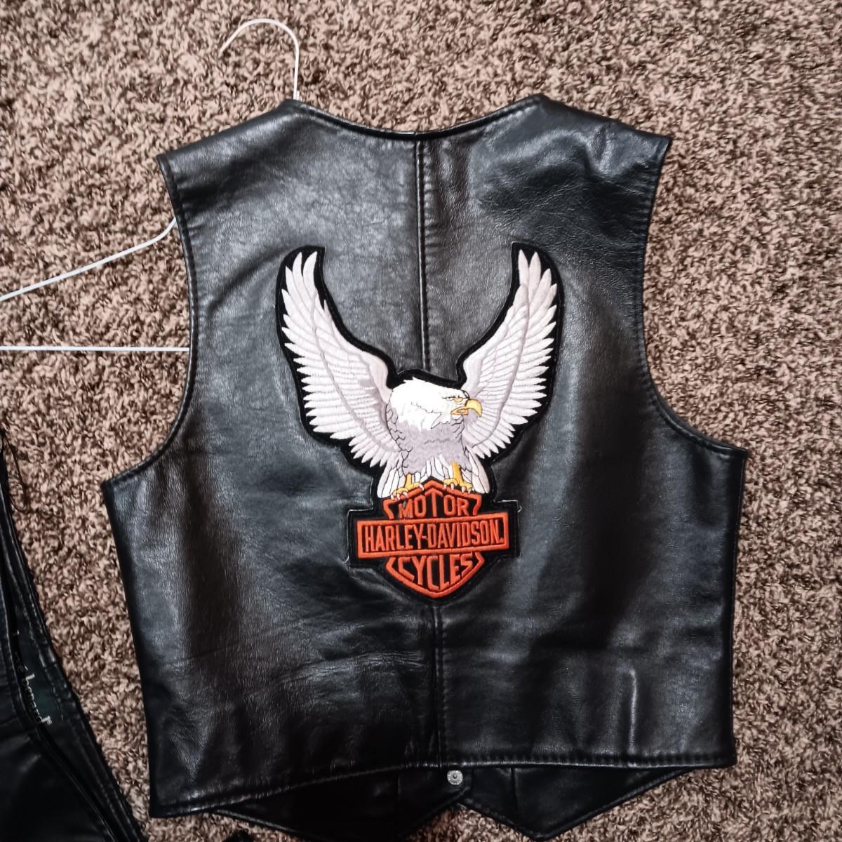 LADIES LEATHER VEST W/STURGIS PEWTER PINS AND HARLEY DAVIDSON PATCH PLUS LEATHER PANTS