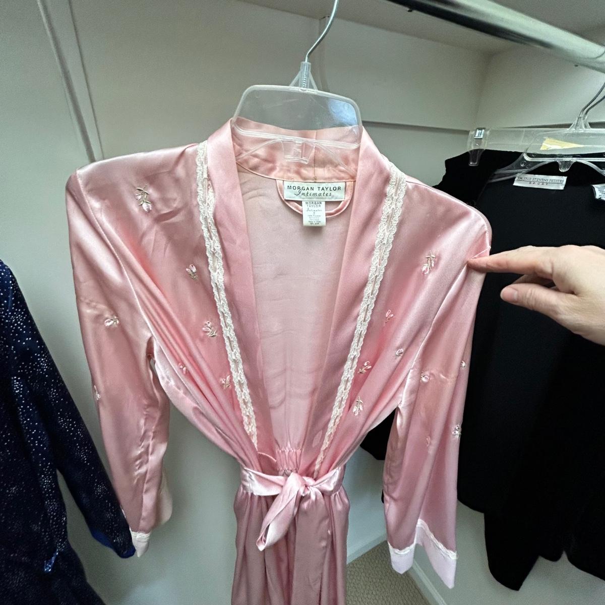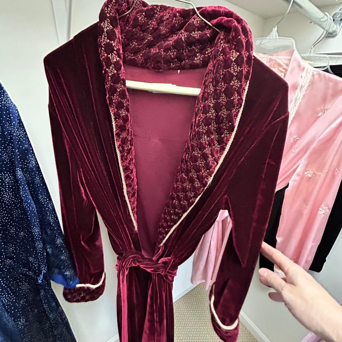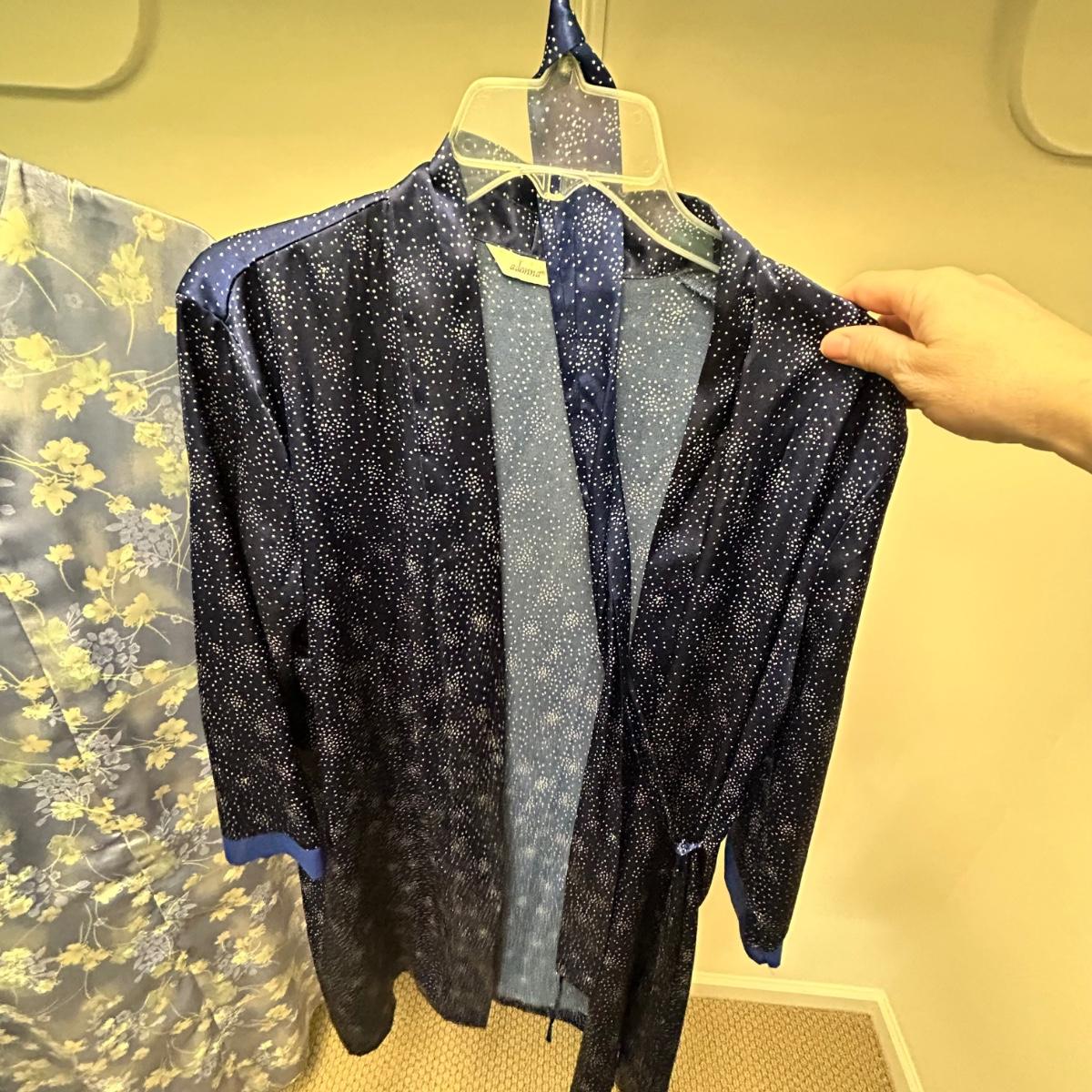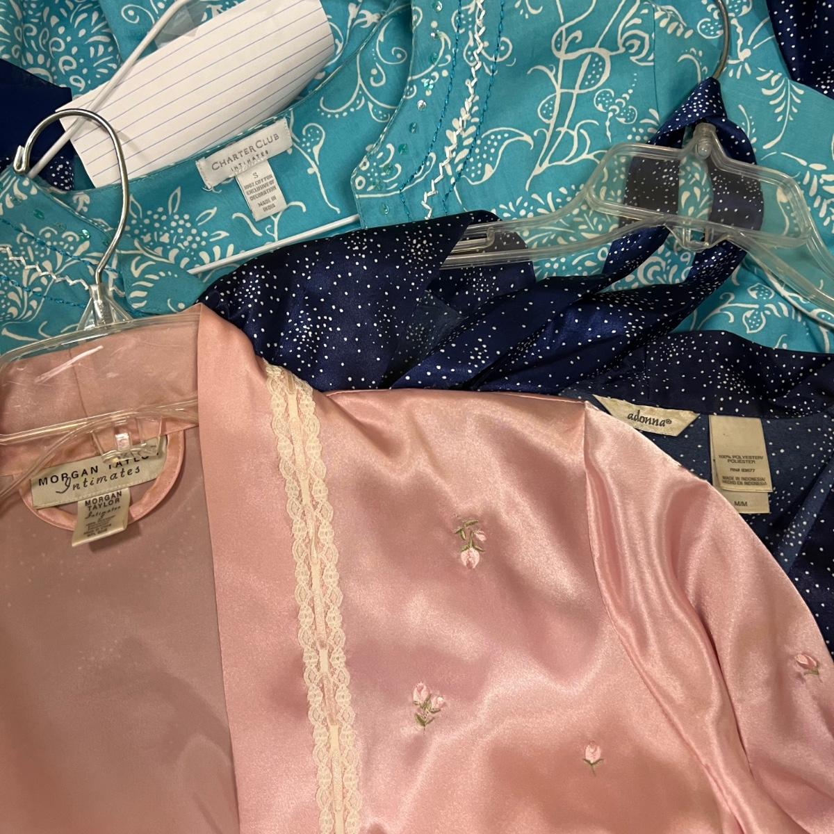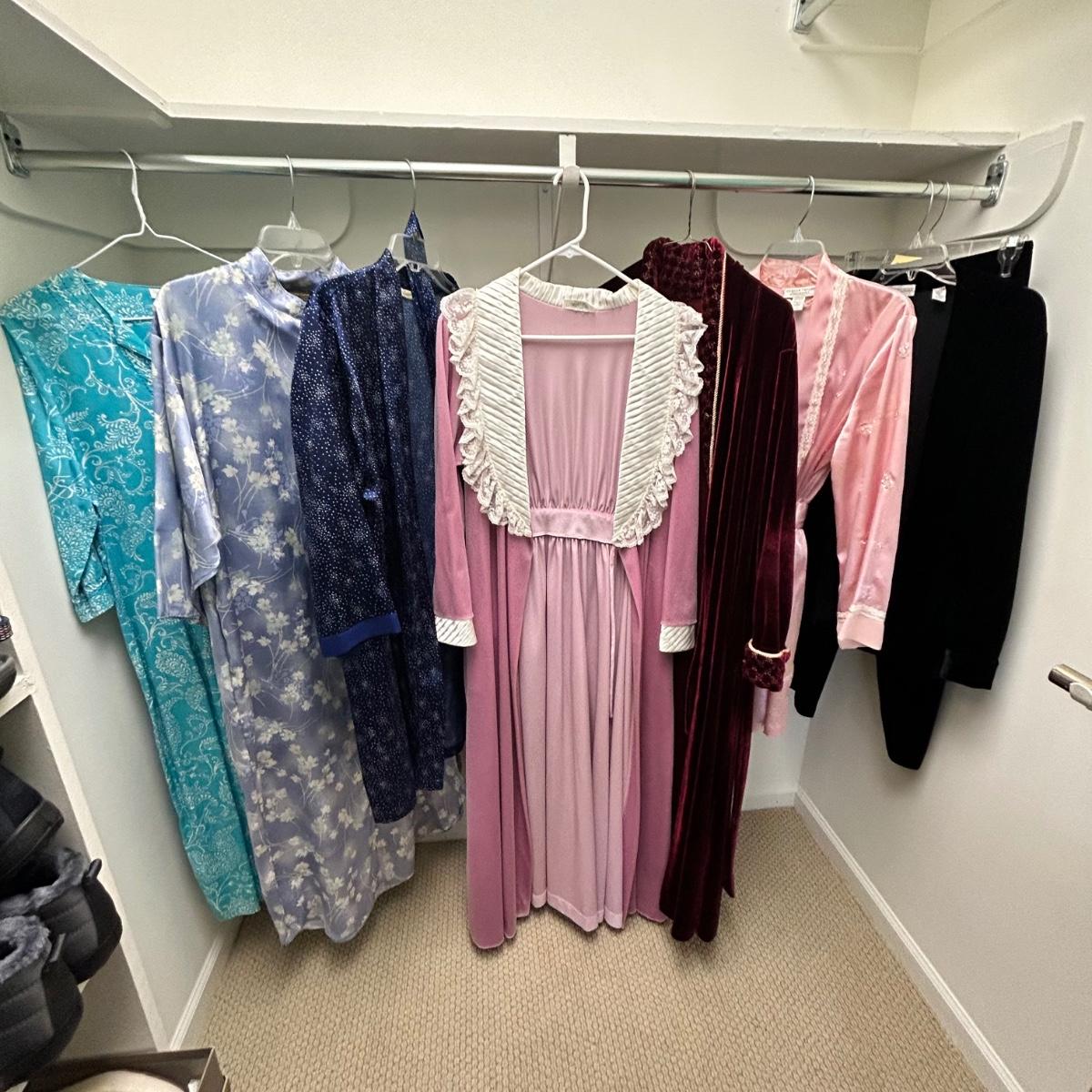 Seven pieces of ladies’ comfortable lounge wear in silk to velour to cotton. All are in nice condition and some quite vintage in style. There are two nightgowns, four robes, and a velvet pant and shirt set. A small hole is shown on collar edge of red robe. Please see photos for brand names and size details. Many items do not have sizes at all, if available it is shown. Shipping available. Shipping can be costly. We suggest contacting our preferred local shipping provider, Postage Express, with dimensions and getting an estimate before bidding: (828) 670-5501 or postageexpress@yahoo.com.