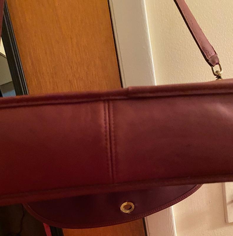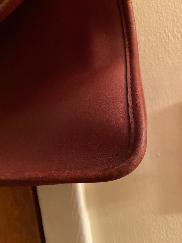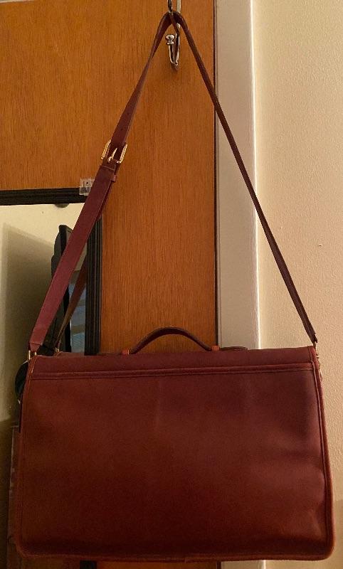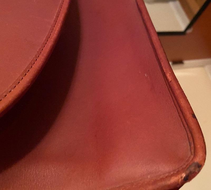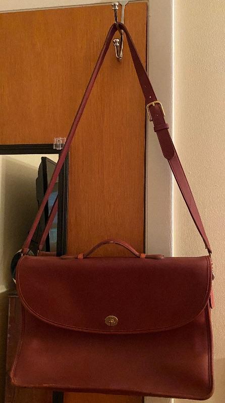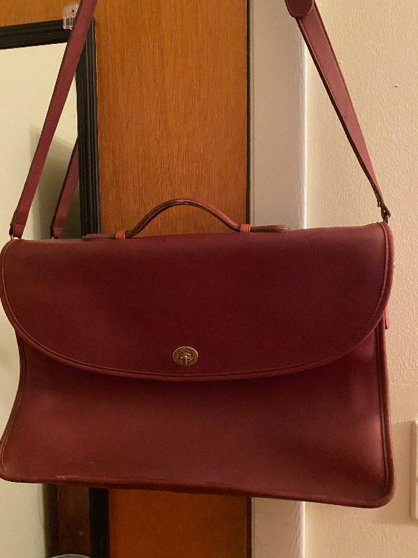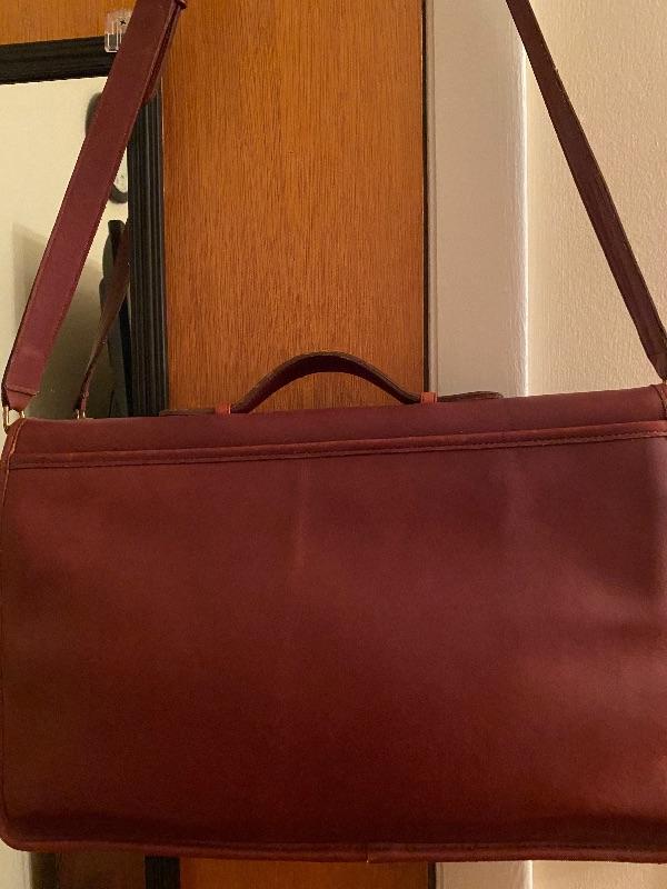 Sturdy leather Messenger bag in deep red. Brass closure. Two inner compartment for laptop and paper work and deep zippered pouch for small items. Suede leather interior. Long strap 44" long. Can be shorten by buckle. Wear consistent with age.