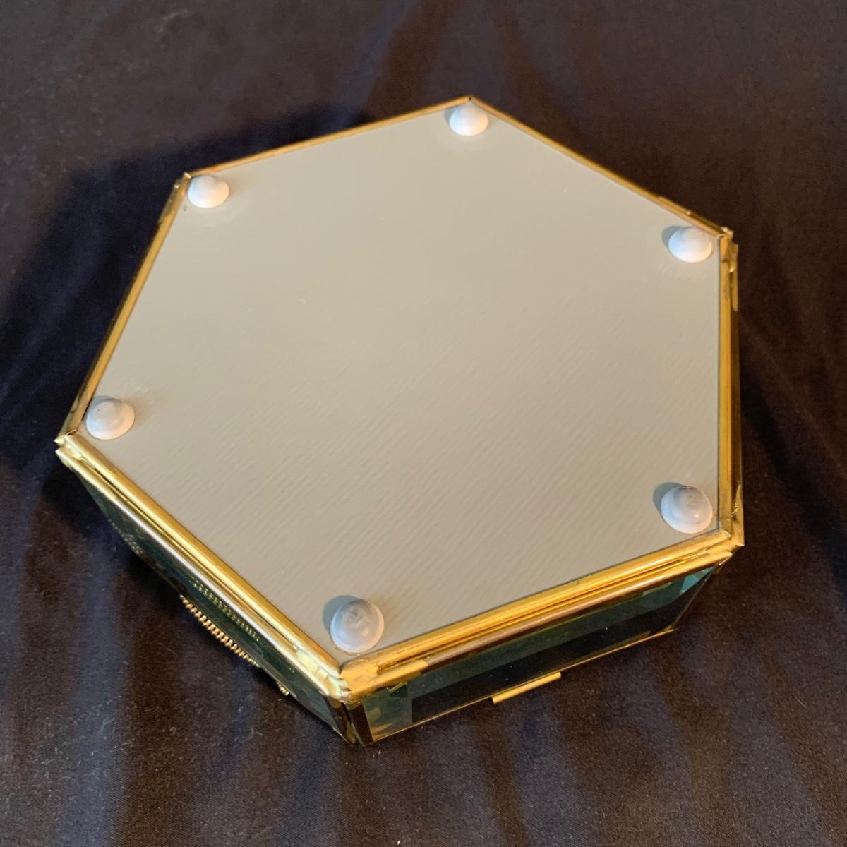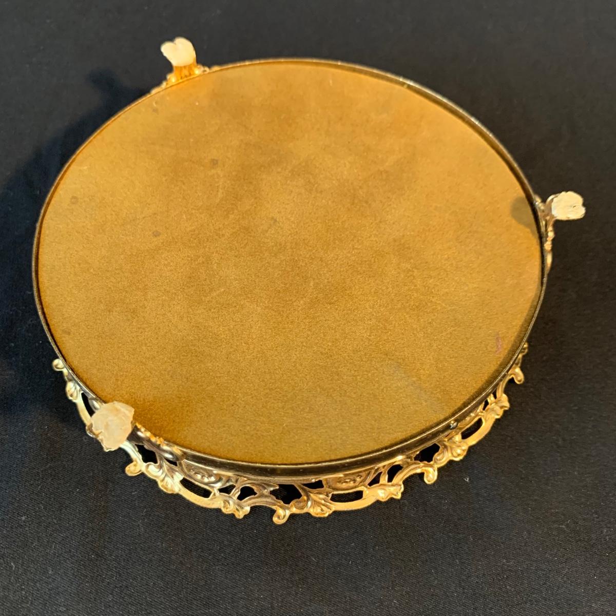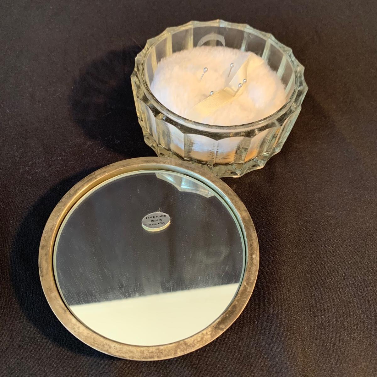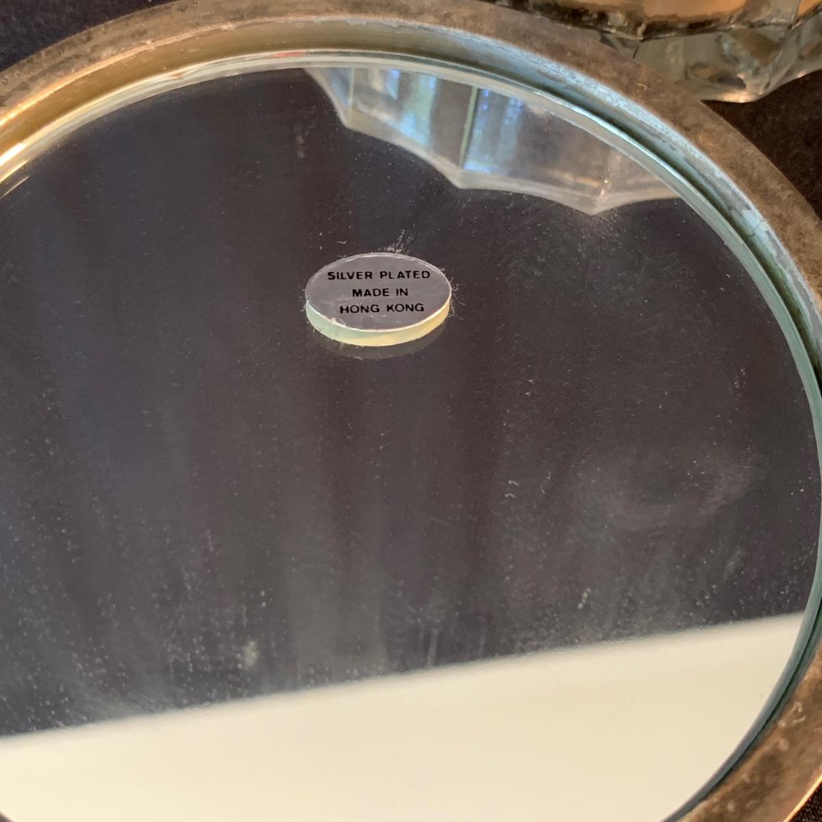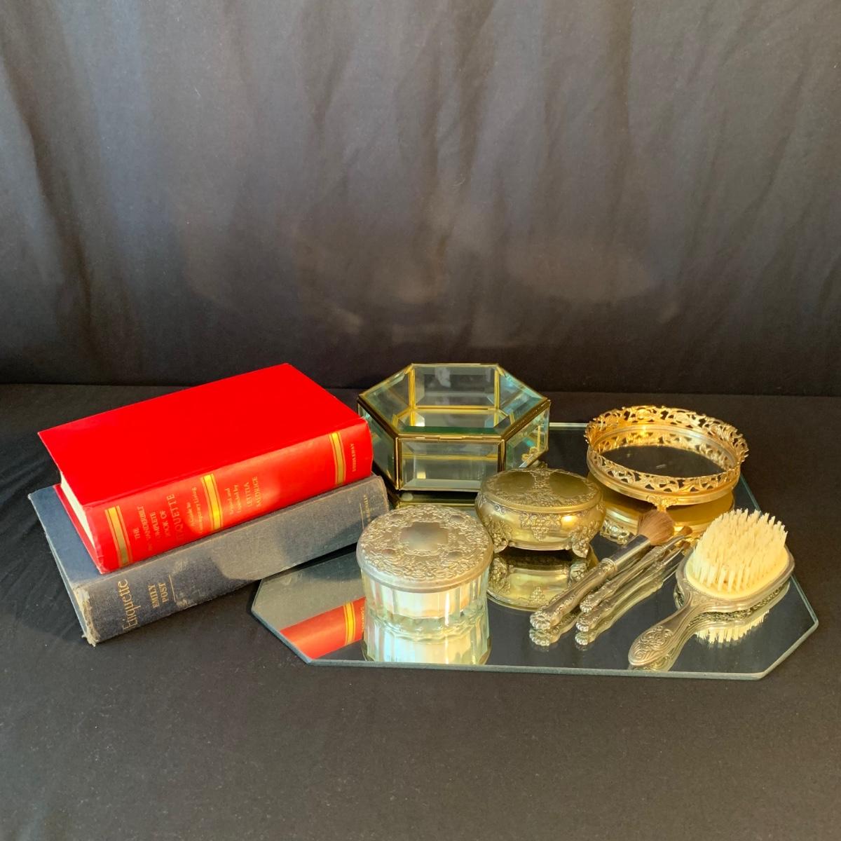 This lovely collection of items includes an octagonal tabletop display mirror from the Carolina Mirror Corporation, as well as a set of silver-toned metal accessories, a smaller round ornate table mirror, a golden trinket box, a hexagonal glass box, and two vintage etiquette books. The tabletop mirror measures 16” x 14” and has a flat, non-beveled edge. It is in good condition with just a small amount of wear on a corner. The glass powder jar has a sticker inside that says the lid is silver-plated. The small round golden-framed tabletop mirror is 5.5”D. It has some cleanable marks on the mirror surface. The hexagonal glass box has beveled glass panels and metal joints. There’s a small chip in the glass near the hinge. The books are a bit used, and their vintage feel fits in nicely with the theme. Shipping available.