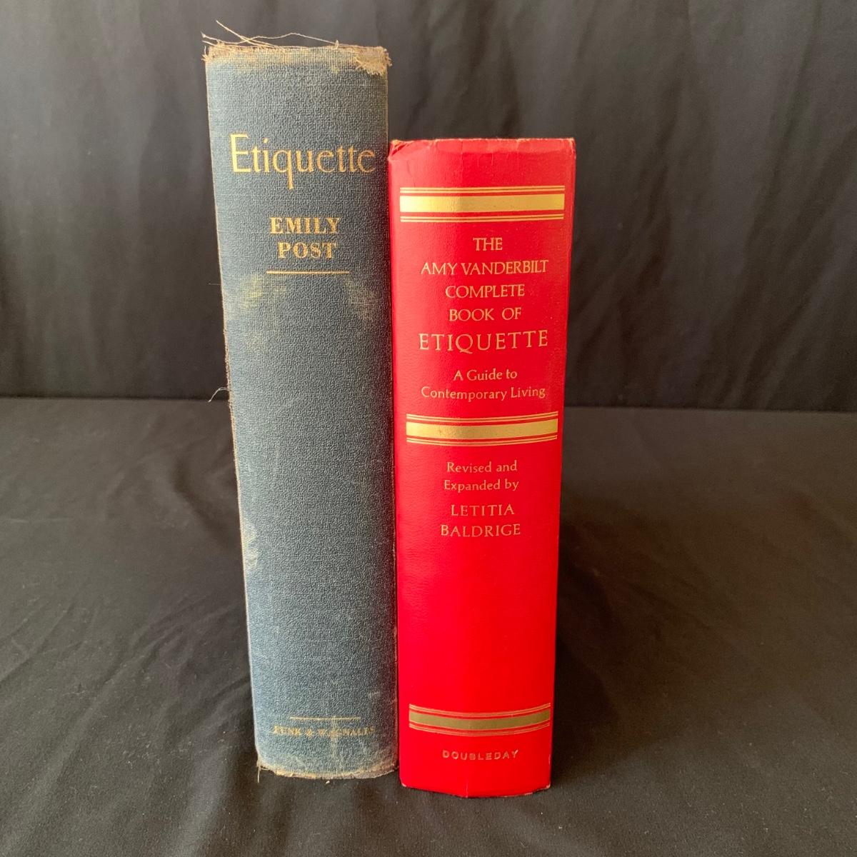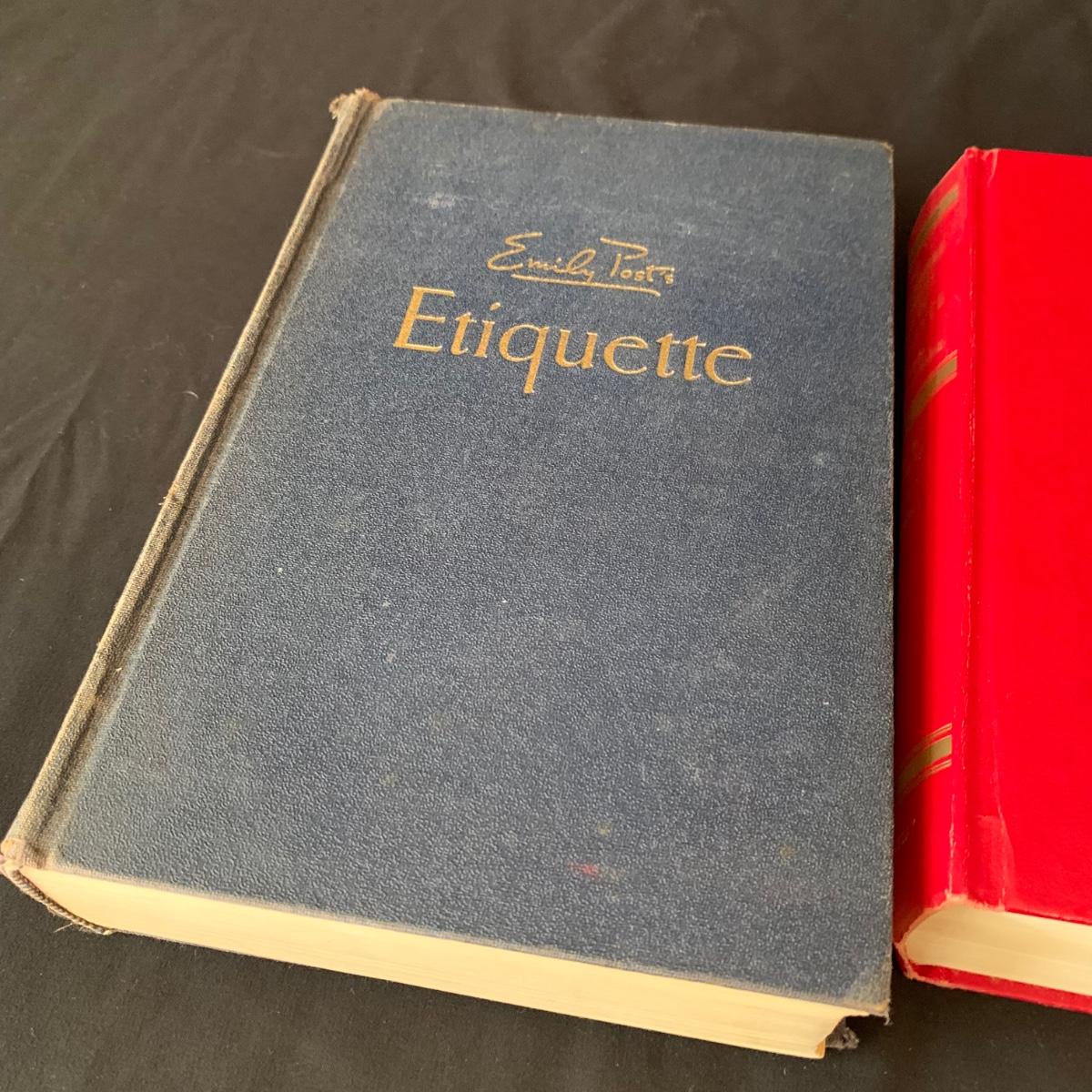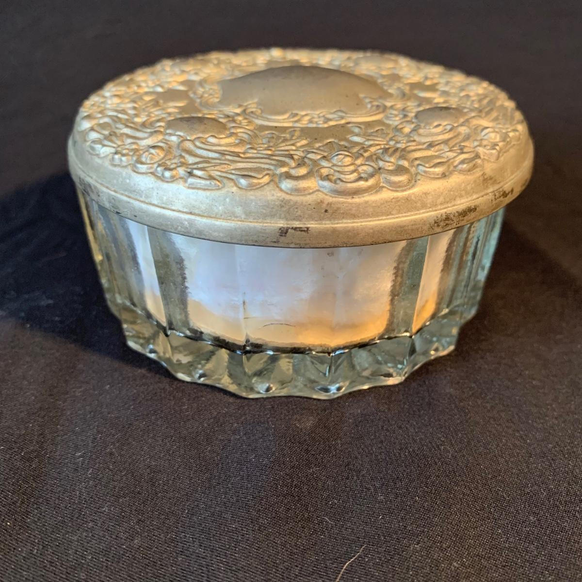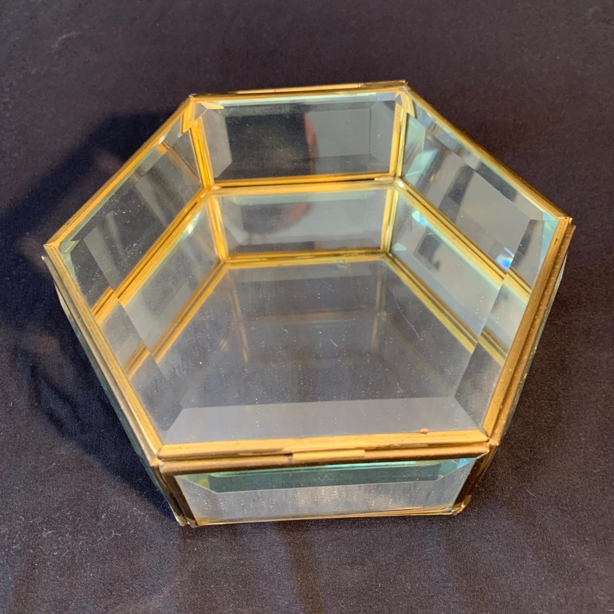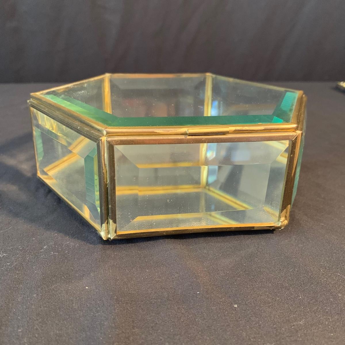 This lovely collection of items includes an octagonal tabletop display mirror from the Carolina Mirror Corporation, as well as a set of silver-toned metal accessories, a smaller round ornate table mirror, a golden trinket box, a hexagonal glass box, and two vintage etiquette books. The tabletop mirror measures 16” x 14” and has a flat, non-beveled edge. It is in good condition with just a small amount of wear on a corner. The glass powder jar has a sticker inside that says the lid is silver-plated. The small round golden-framed tabletop mirror is 5.5”D. It has some cleanable marks on the mirror surface. The hexagonal glass box has beveled glass panels and metal joints. There’s a small chip in the glass near the hinge. The books are a bit used, and their vintage feel fits in nicely with the theme. Shipping available.