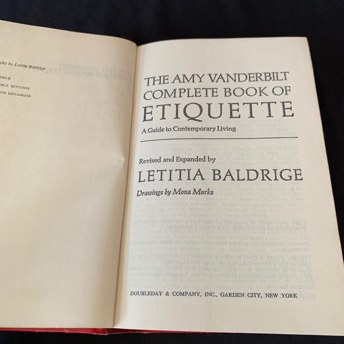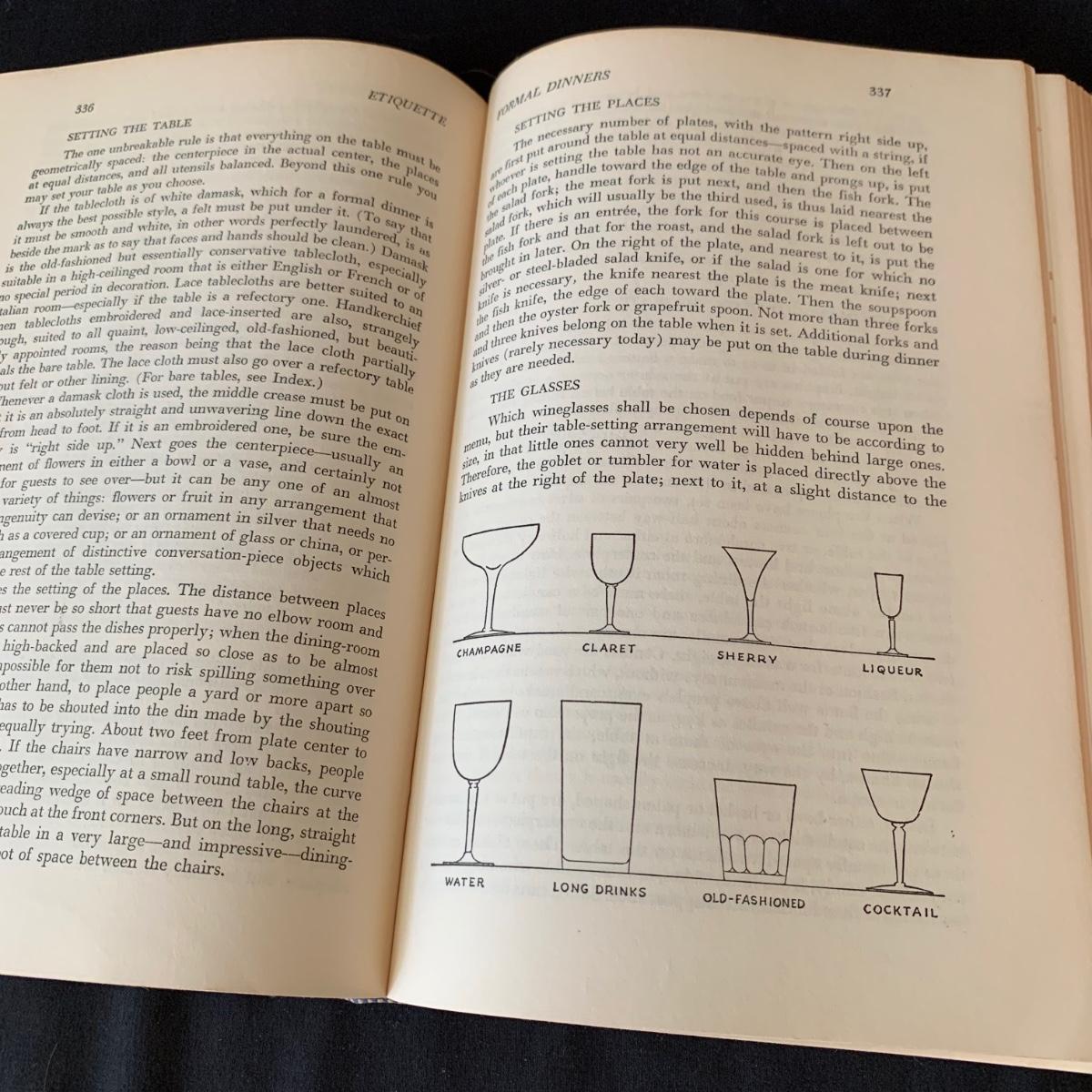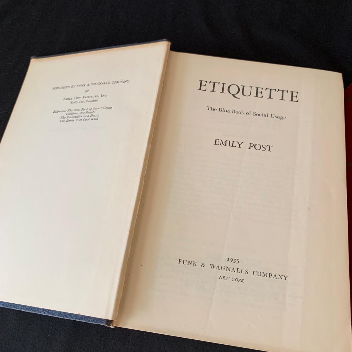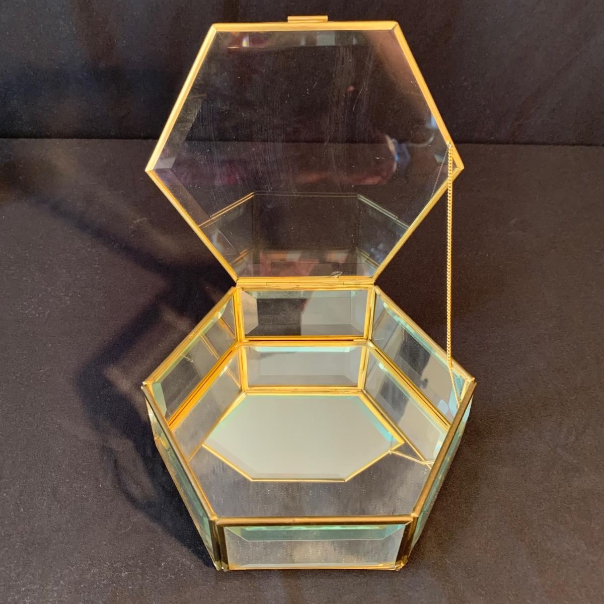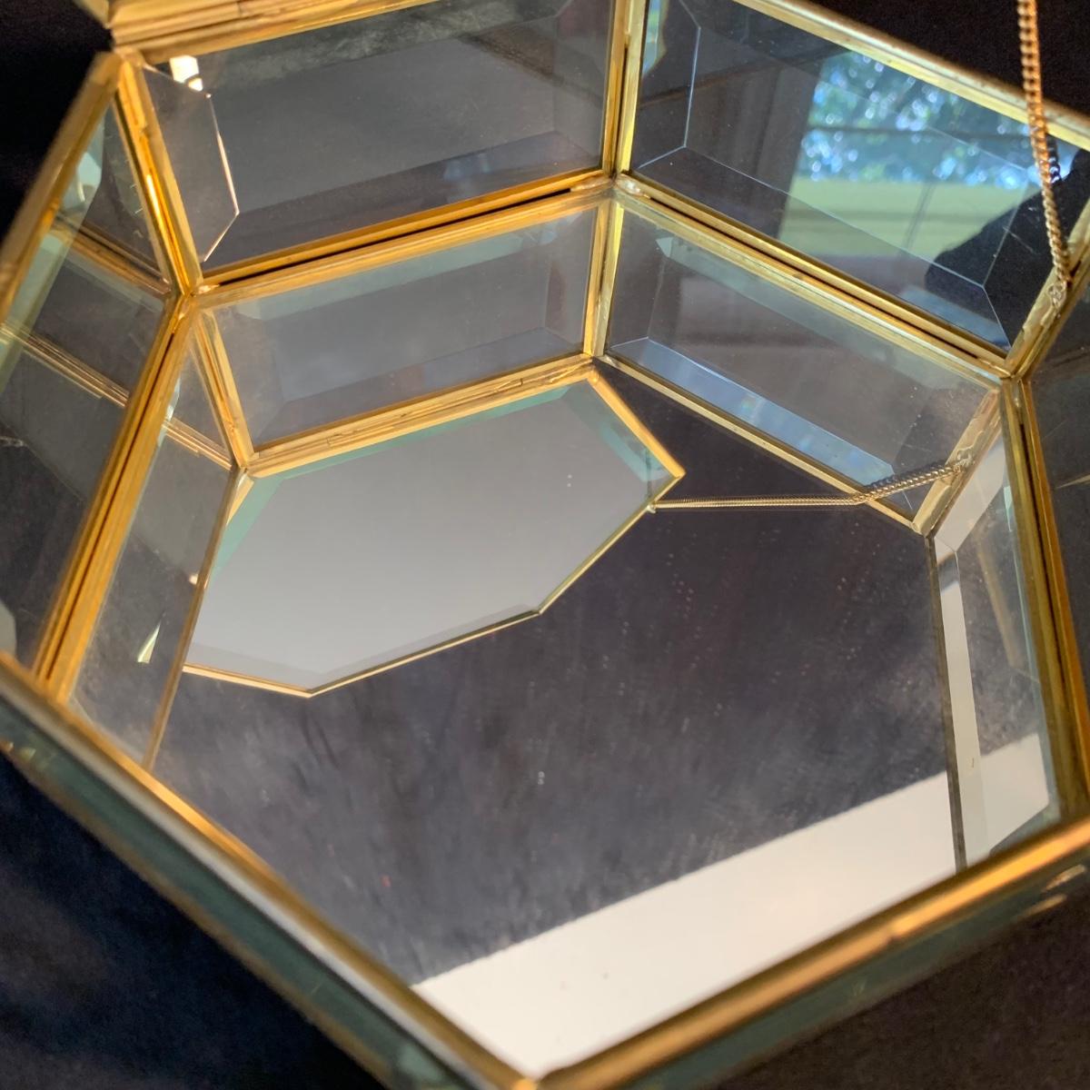 This lovely collection of items includes an octagonal tabletop display mirror from the Carolina Mirror Corporation, as well as a set of silver-toned metal accessories, a smaller round ornate table mirror, a golden trinket box, a hexagonal glass box, and two vintage etiquette books. The tabletop mirror measures 16” x 14” and has a flat, non-beveled edge. It is in good condition with just a small amount of wear on a corner. The glass powder jar has a sticker inside that says the lid is silver-plated. The small round golden-framed tabletop mirror is 5.5”D. It has some cleanable marks on the mirror surface. The hexagonal glass box has beveled glass panels and metal joints. There’s a small chip in the glass near the hinge. The books are a bit used, and their vintage feel fits in nicely with the theme. Shipping available.