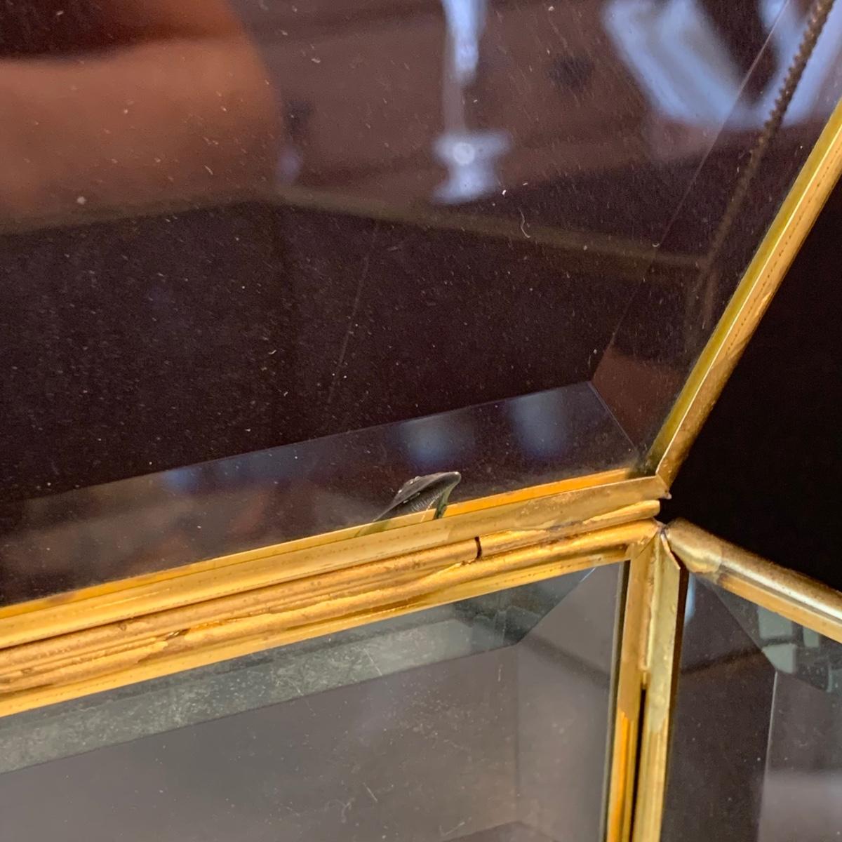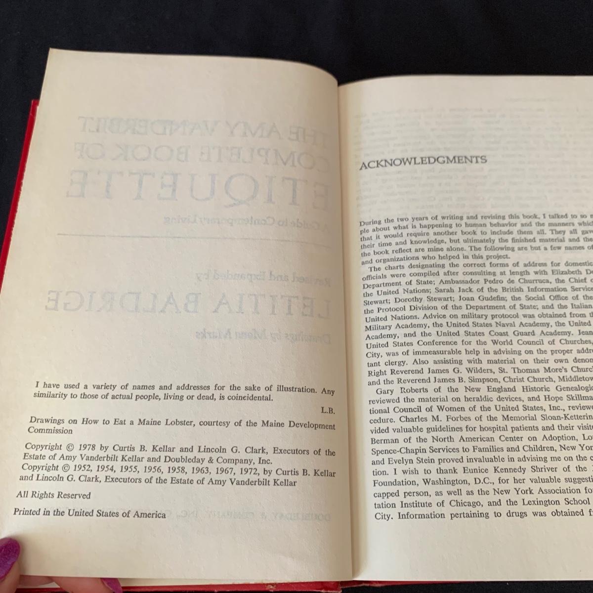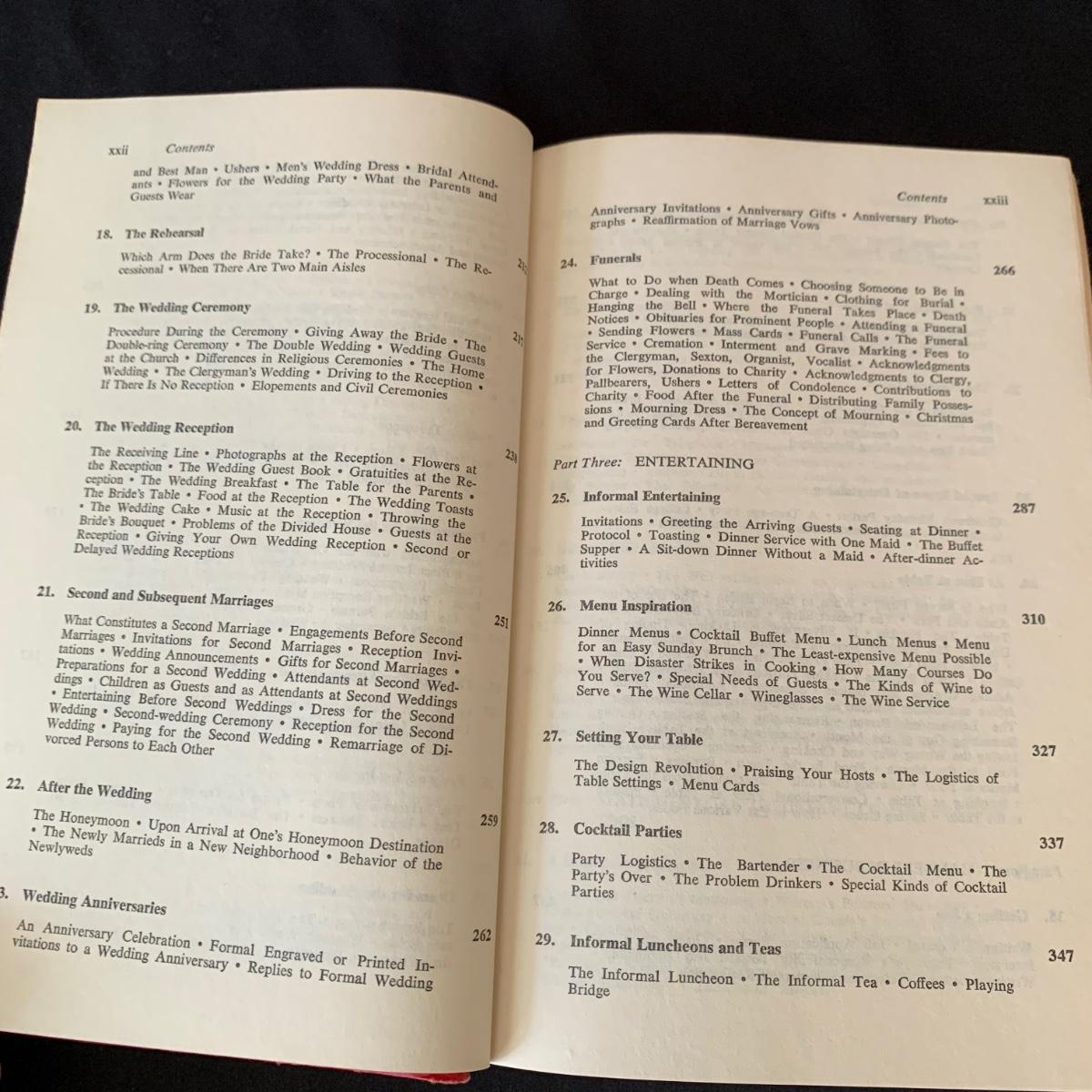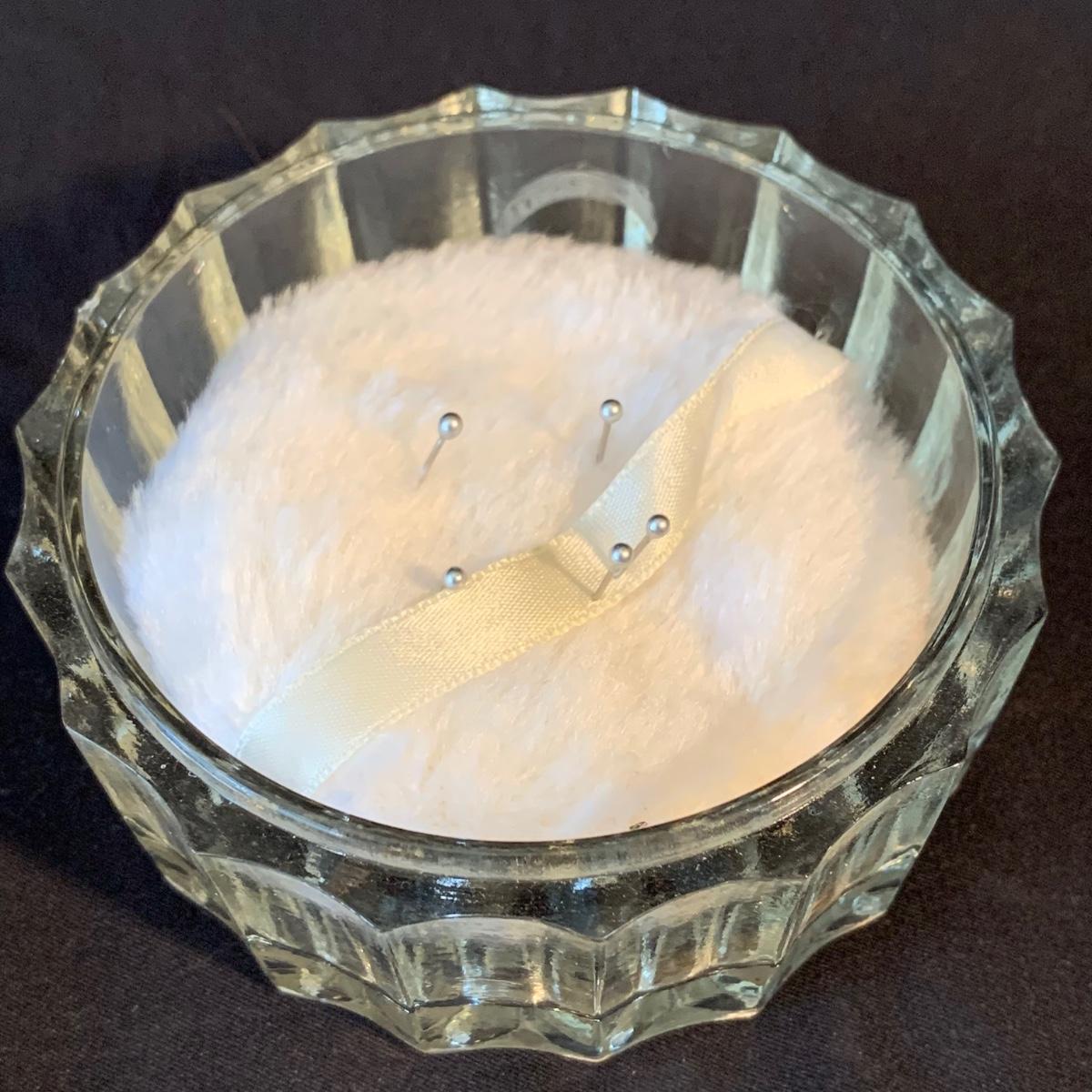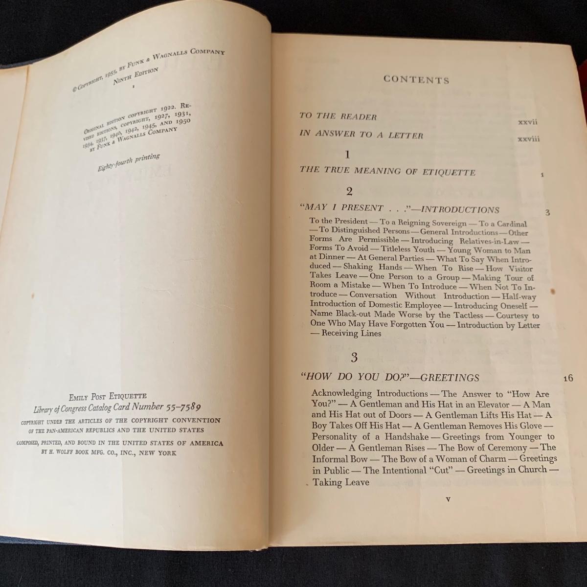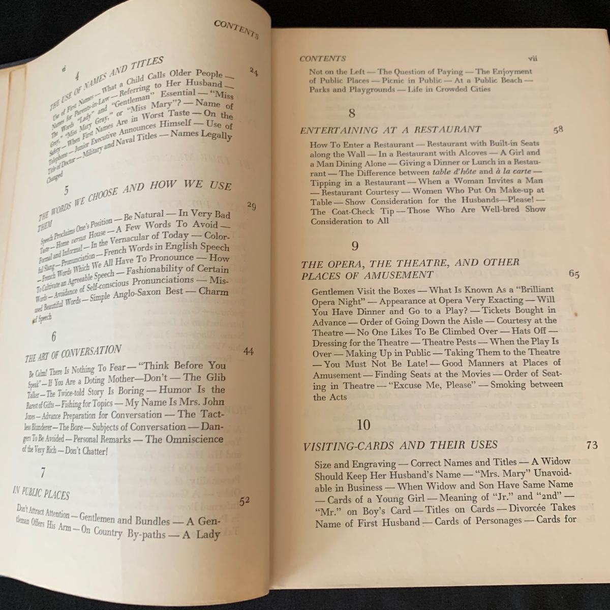 This lovely collection of items includes an octagonal tabletop display mirror from the Carolina Mirror Corporation, as well as a set of silver-toned metal accessories, a smaller round ornate table mirror, a golden trinket box, a hexagonal glass box, and two vintage etiquette books. The tabletop mirror measures 16” x 14” and has a flat, non-beveled edge. It is in good condition with just a small amount of wear on a corner. The glass powder jar has a sticker inside that says the lid is silver-plated. The small round golden-framed tabletop mirror is 5.5”D. It has some cleanable marks on the mirror surface. The hexagonal glass box has beveled glass panels and metal joints. There’s a small chip in the glass near the hinge. The books are a bit used, and their vintage feel fits in nicely with the theme. Shipping available.