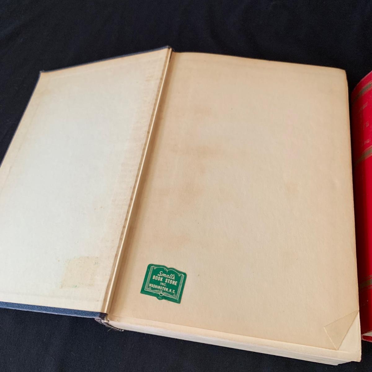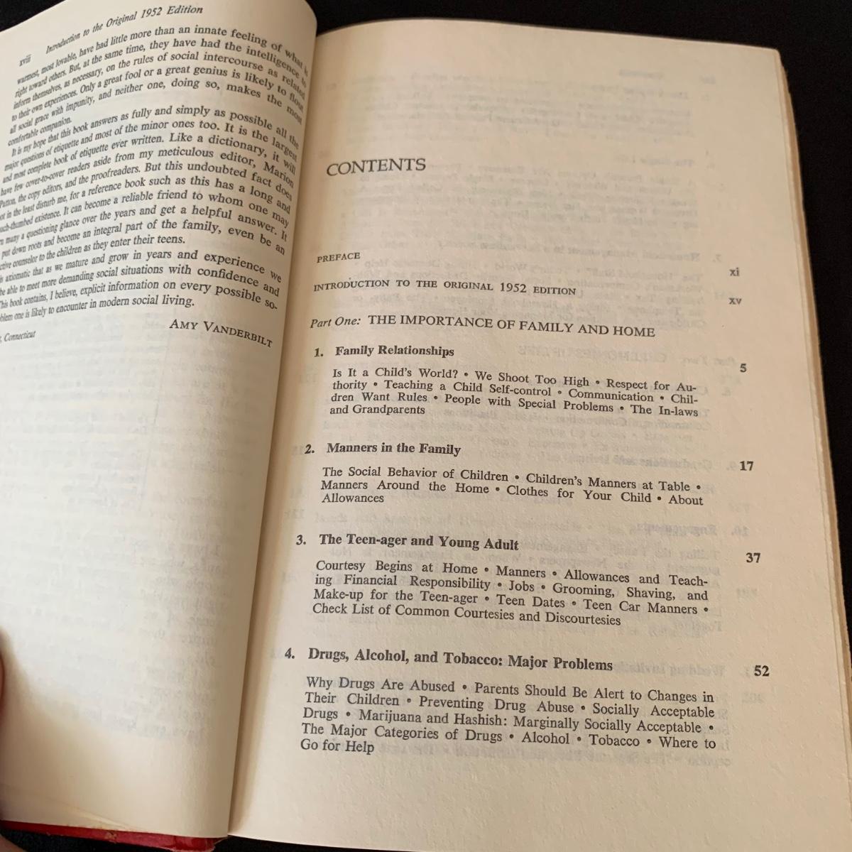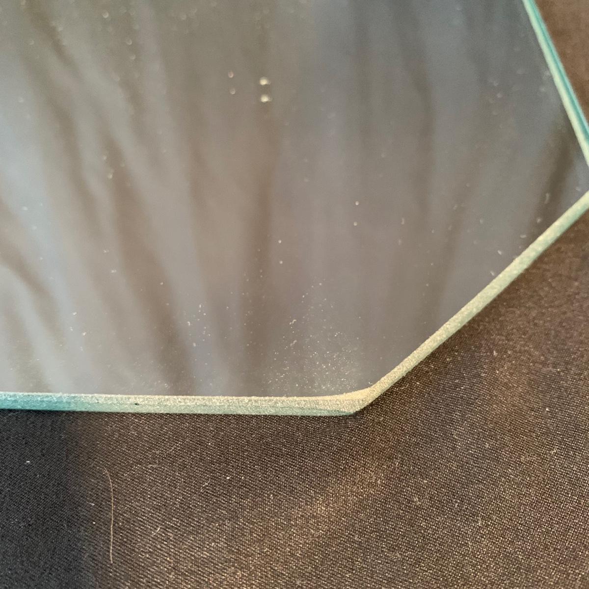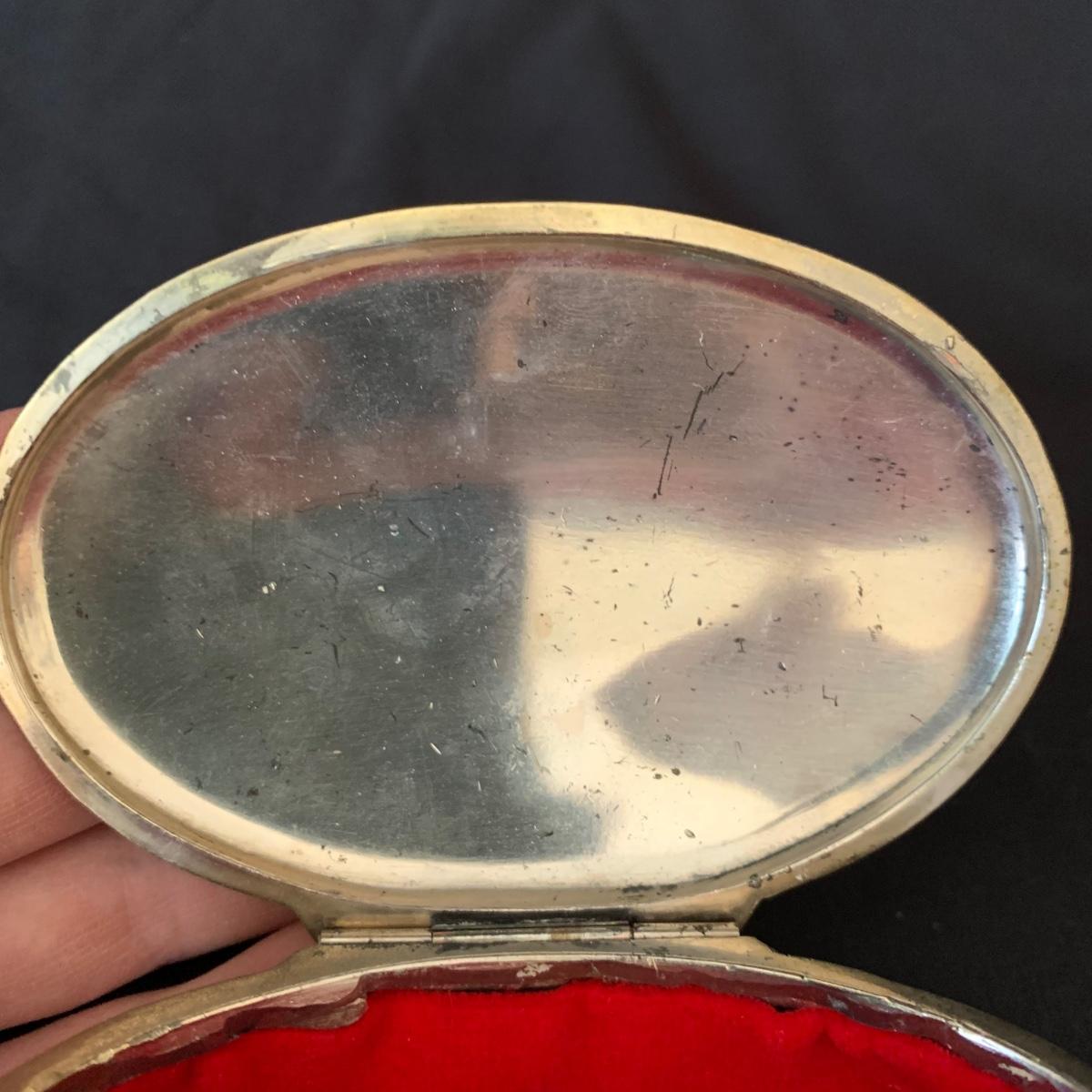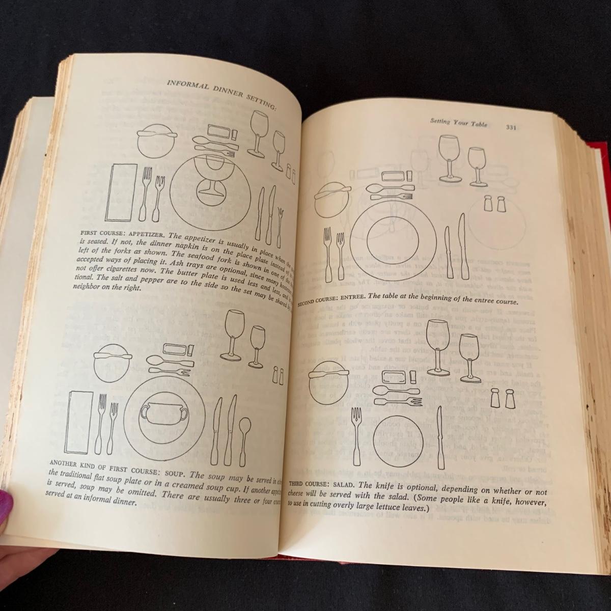 This lovely collection of items includes an octagonal tabletop display mirror from the Carolina Mirror Corporation, as well as a set of silver-toned metal accessories, a smaller round ornate table mirror, a golden trinket box, a hexagonal glass box, and two vintage etiquette books. The tabletop mirror measures 16” x 14” and has a flat, non-beveled edge. It is in good condition with just a small amount of wear on a corner. The glass powder jar has a sticker inside that says the lid is silver-plated. The small round golden-framed tabletop mirror is 5.5”D. It has some cleanable marks on the mirror surface. The hexagonal glass box has beveled glass panels and metal joints. There’s a small chip in the glass near the hinge. The books are a bit used, and their vintage feel fits in nicely with the theme. Shipping available.
