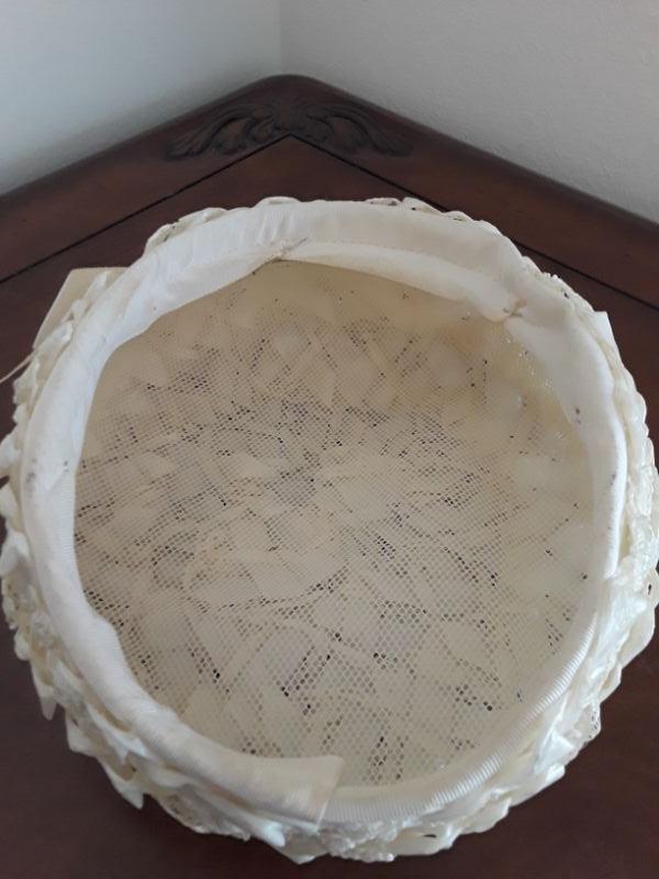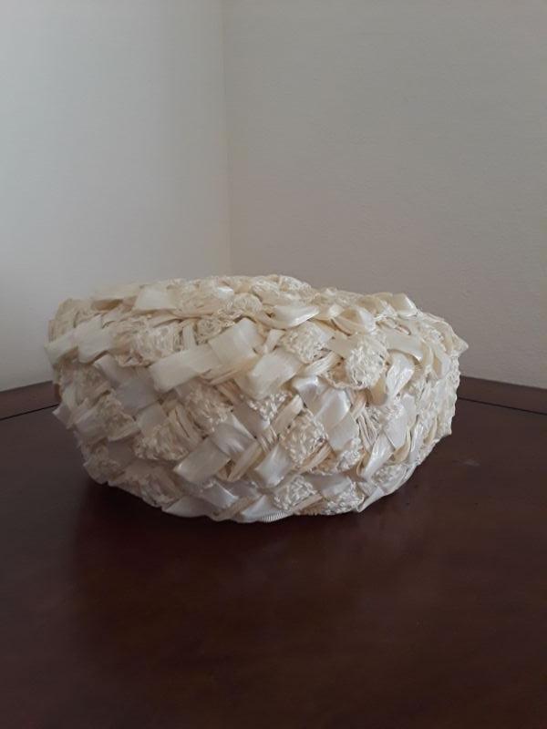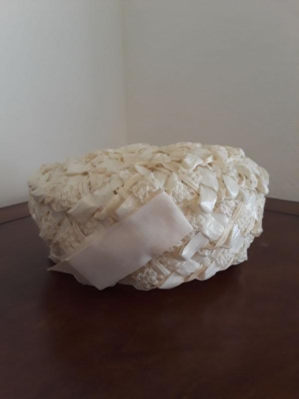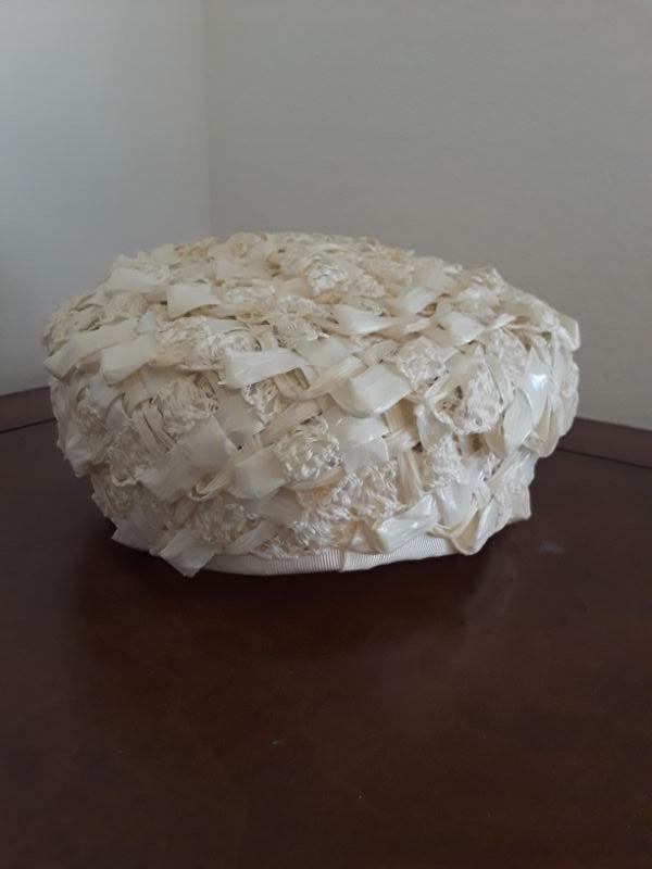 Off white Raffia ribbon hat. Has a ribbon bow attached, unsure if it is original to the hat. Nice Condition