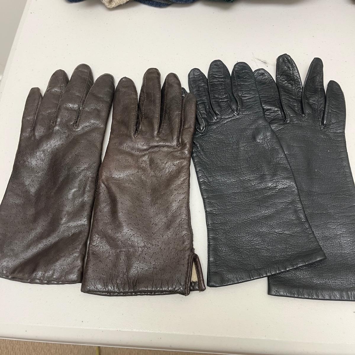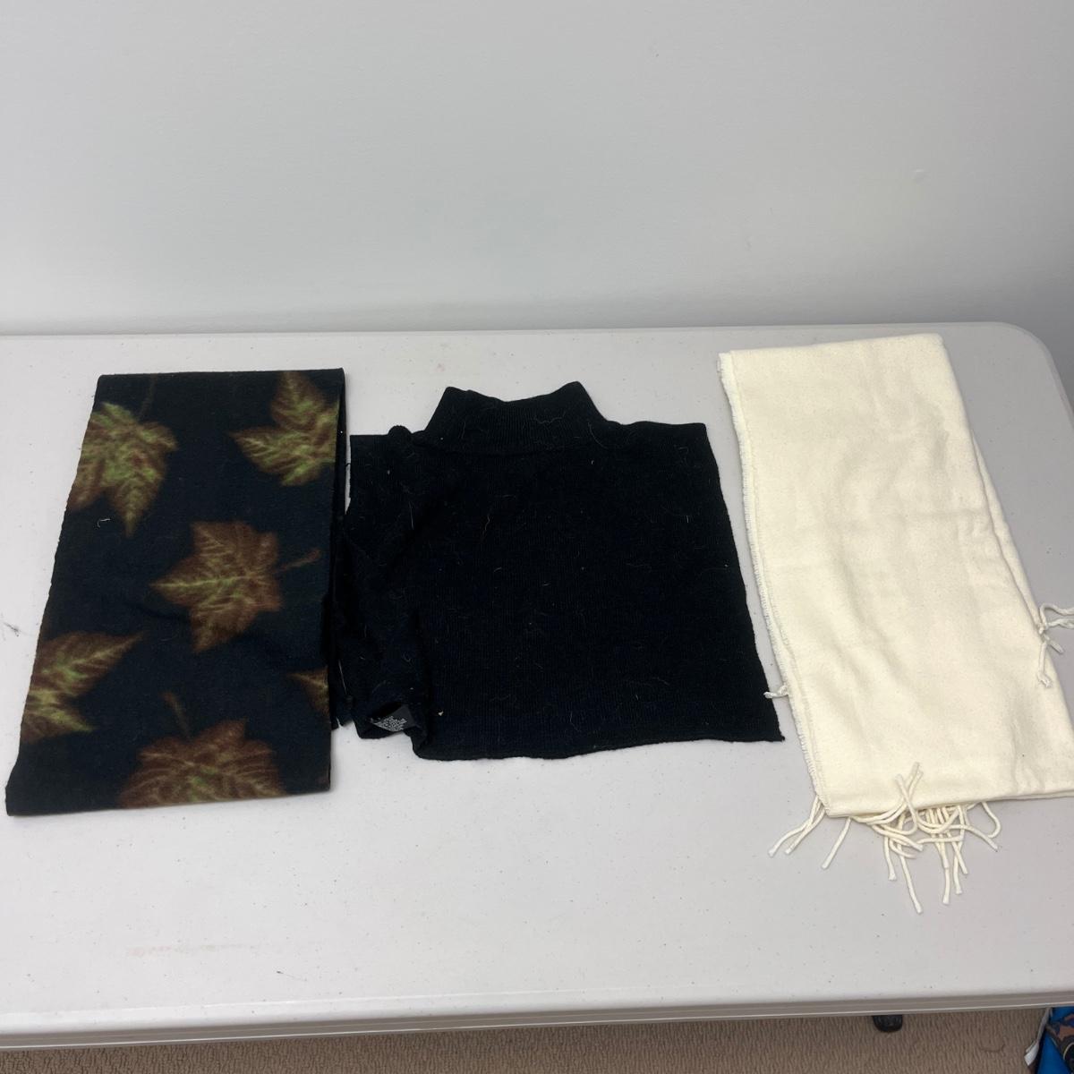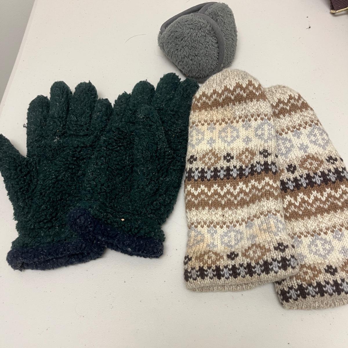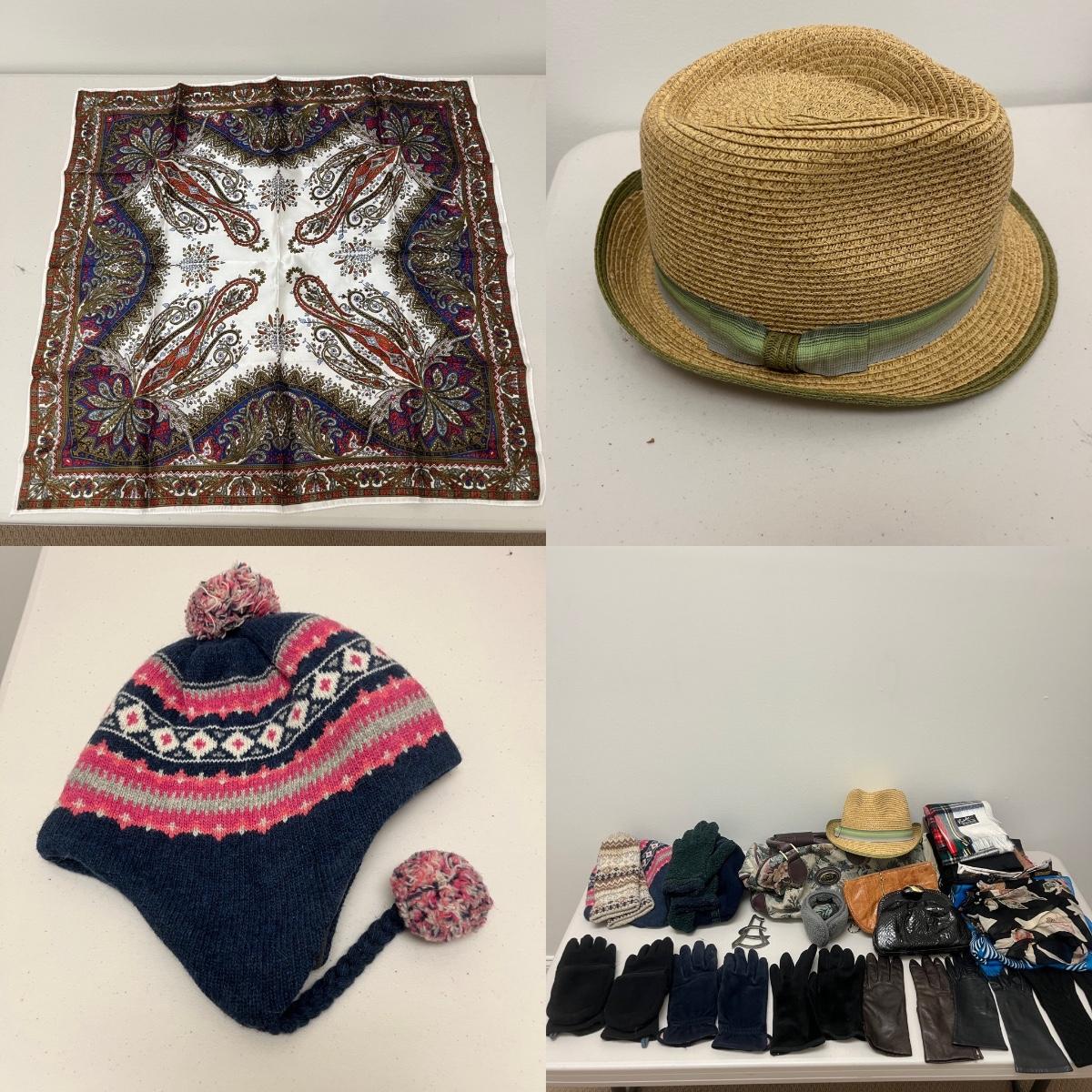 Lot includes ladies leather gloves, fabric gloves, mittens, woven hat size large, small duffel bag, two winter hats, two purses and over 10 scarves. Largest scarf measures 38” x 72”.