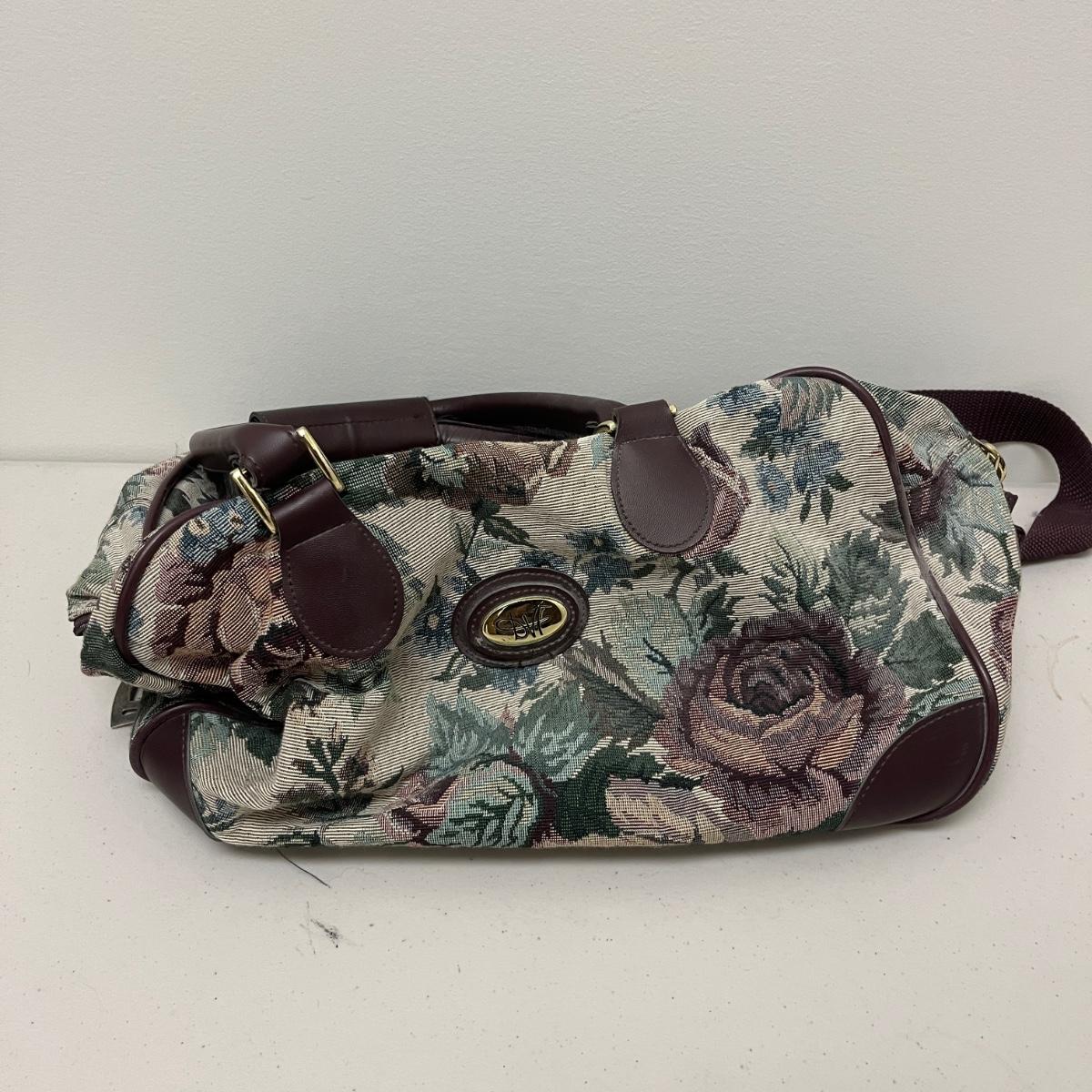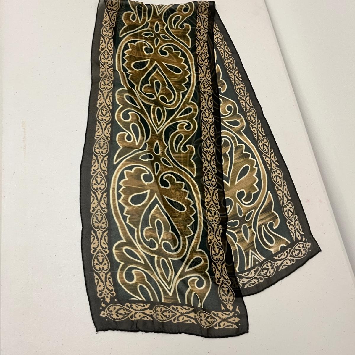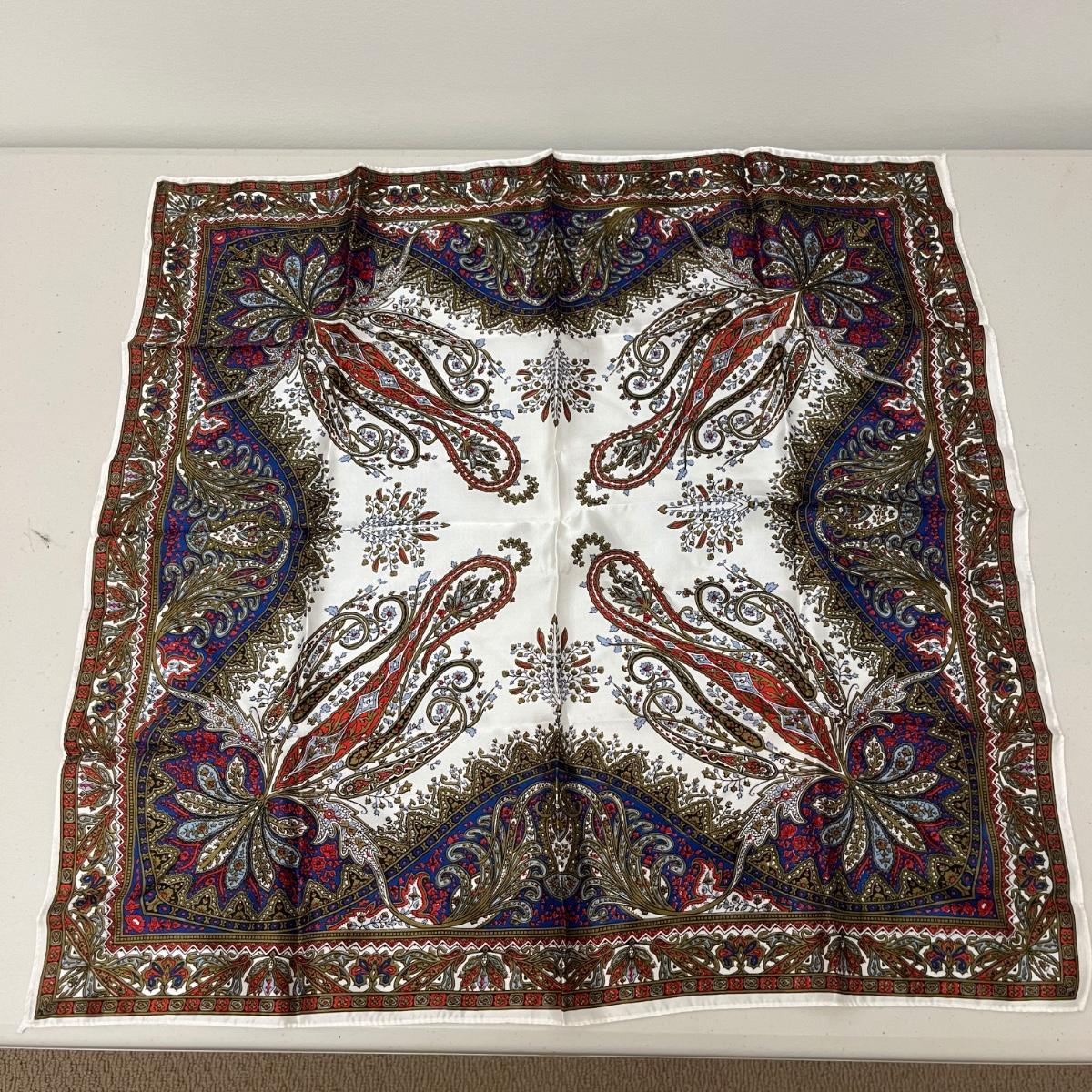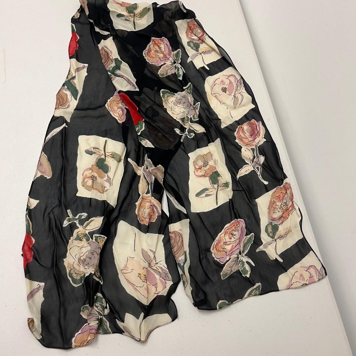 Lot includes ladies leather gloves, fabric gloves, mittens, woven hat size large, small duffel bag, two winter hats, two purses and over 10 scarves. Largest scarf measures 38” x 72”.