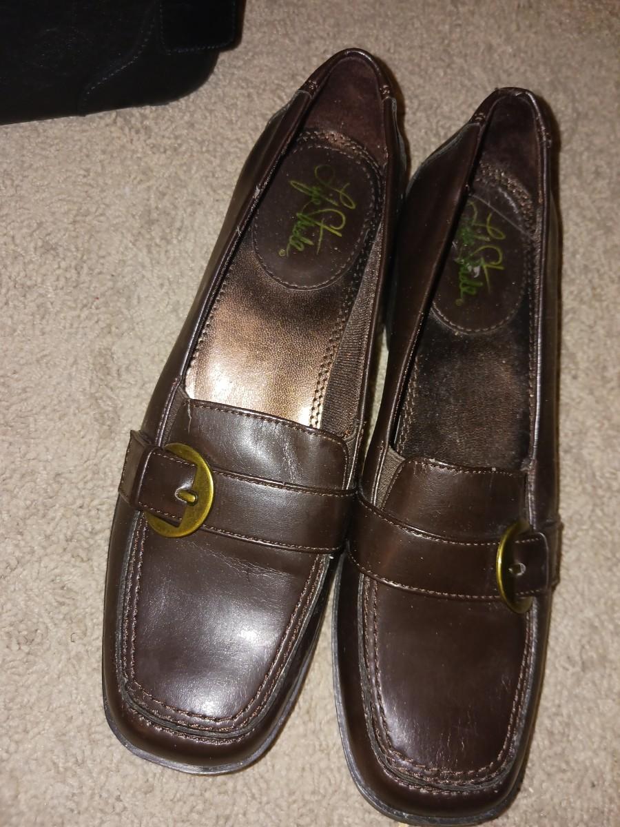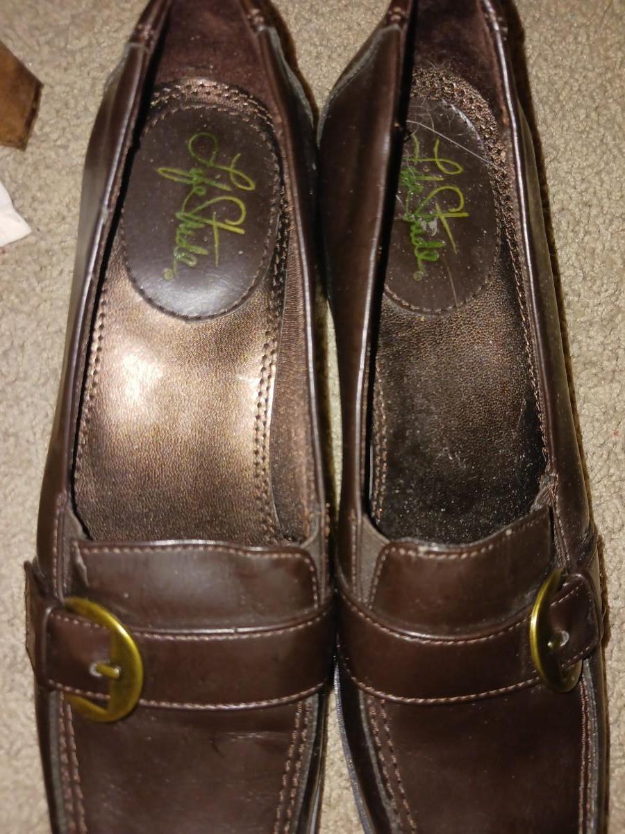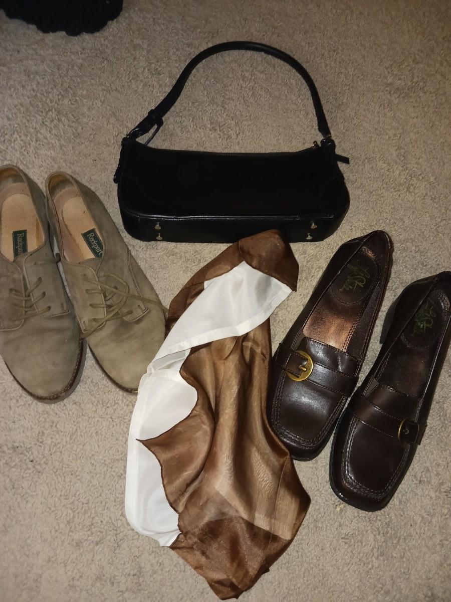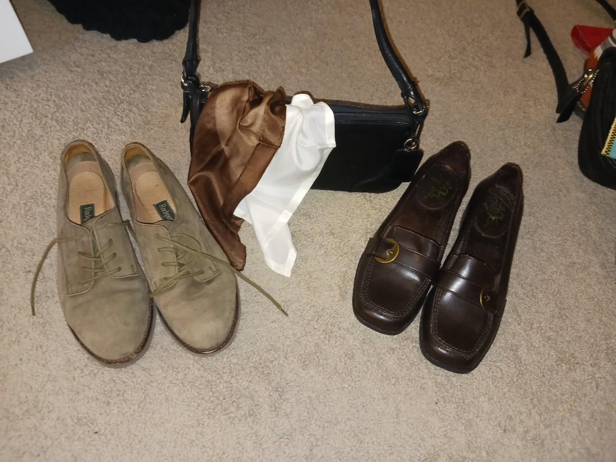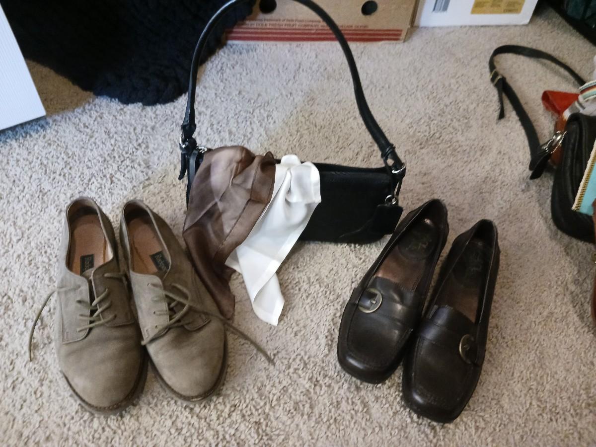 LADIES SHOES (7 1/2), SCARVES AND PURSE