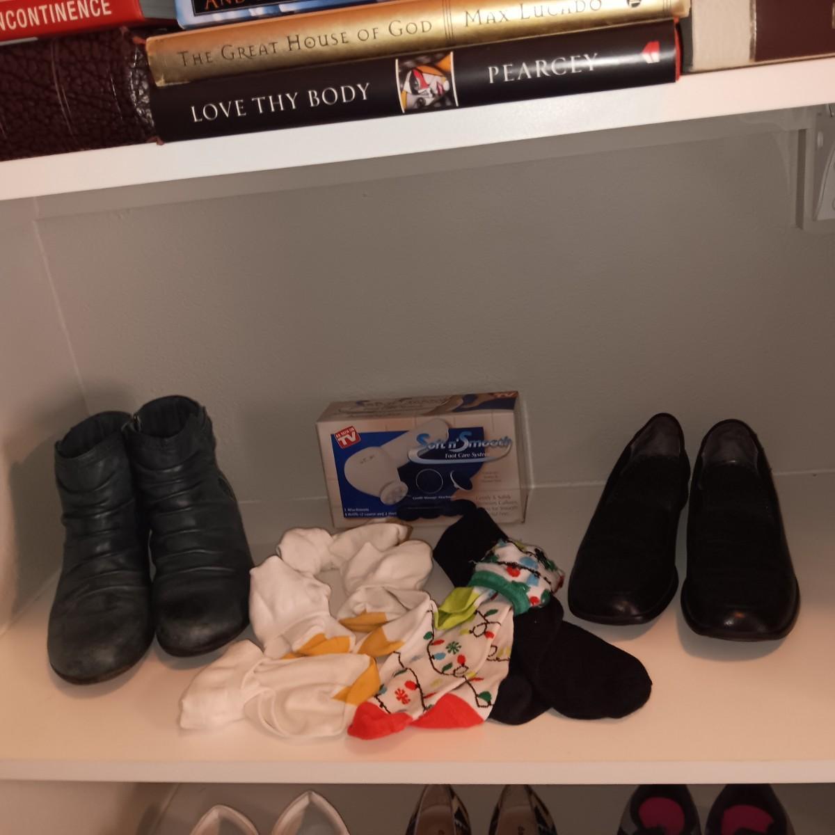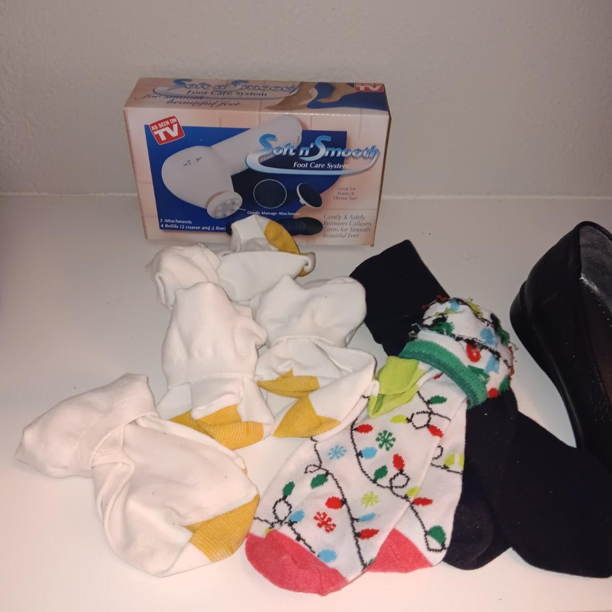 LADIES SHORT BOOTS AND CASUAL SHOES (SIZES 8 - 8.5) PLUS A FOOT CARE SYSTEM & SOCKS