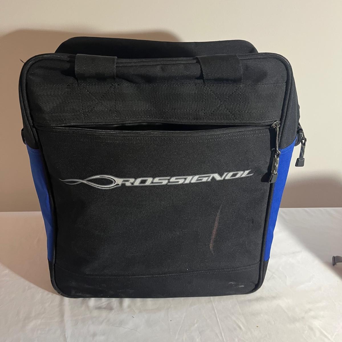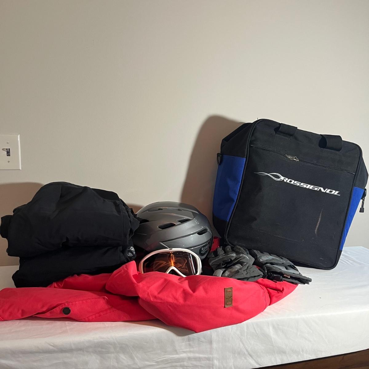 Lot includes a Rossignol bag and Rossignol ski pants size medium, Smith goggles, Obermeyer ski pants size 10, Dakine Gore Tex gloves, Karrimor Fanny pack, Giro helmet size large and a Roxy size large hooded jacket.