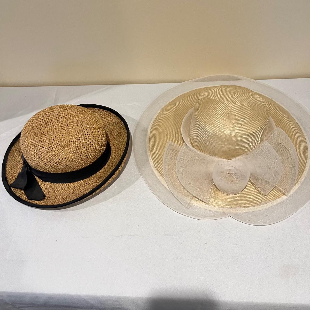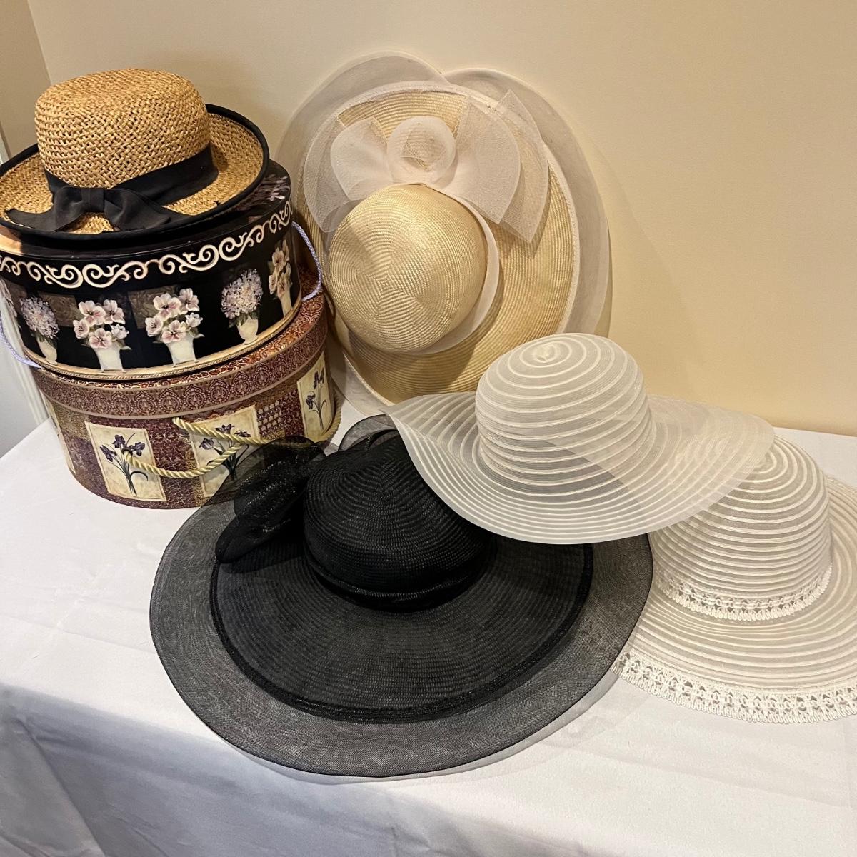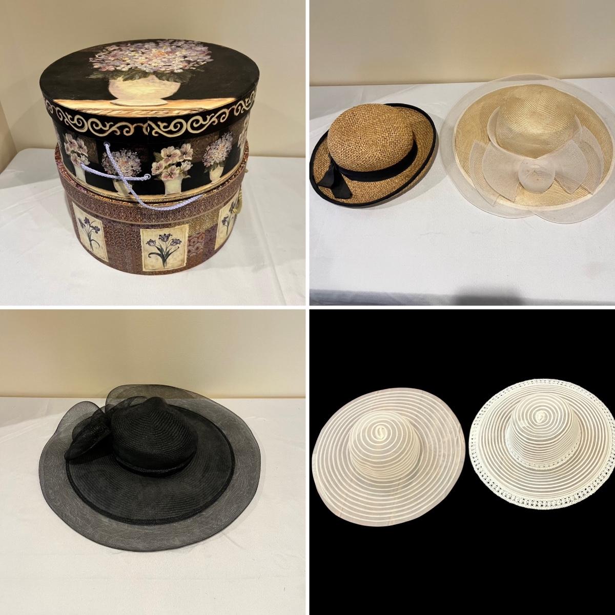 Five summer hats all appear to be size 7.5. Also included are two hatboxes.