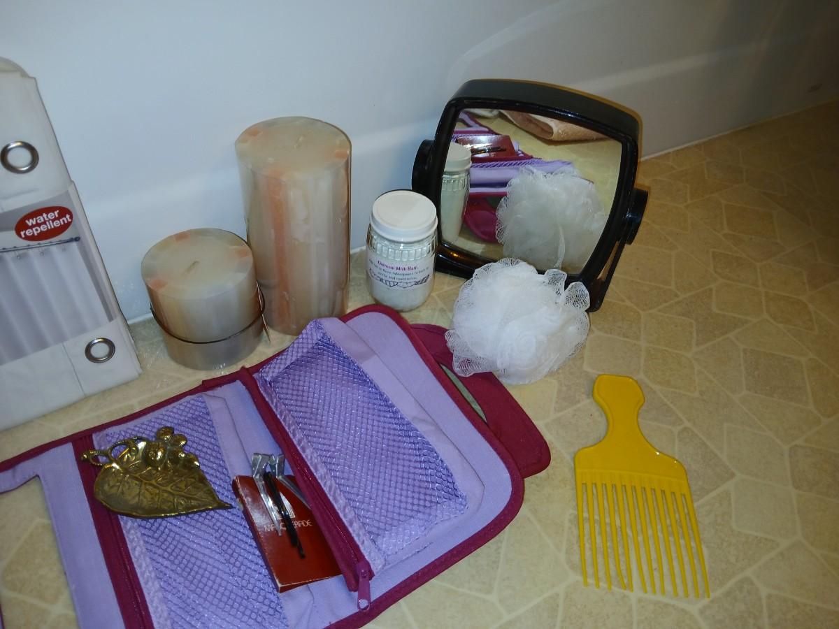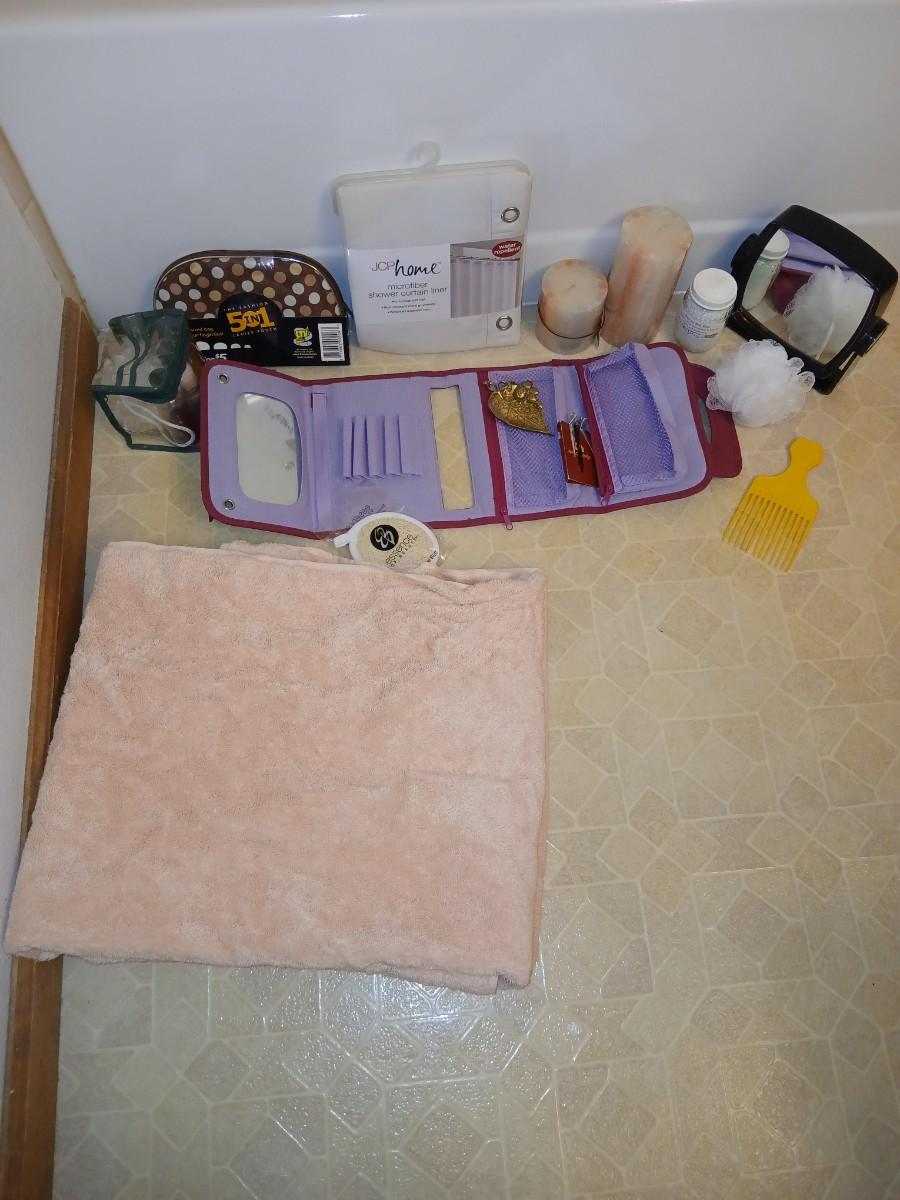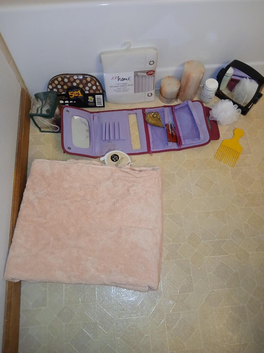 Ladies' spa day! Candles, makeup storage bags, new shower liner, bath towel, small mirror, and more