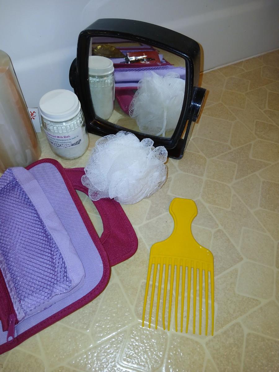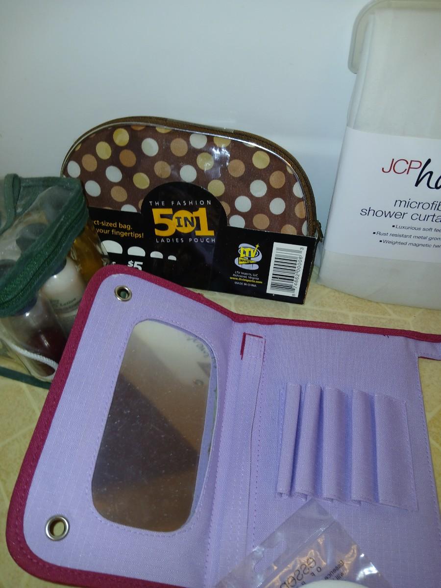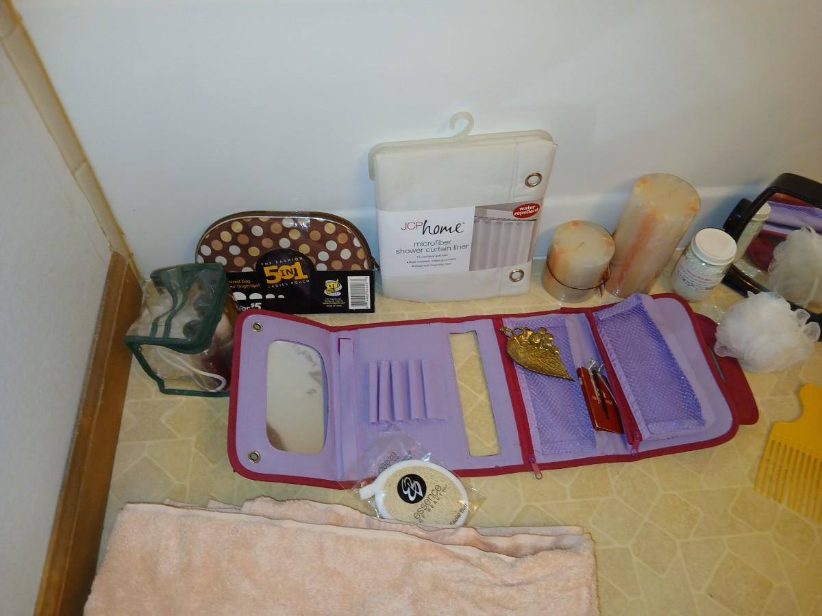 Ladies' spa day! Candles, makeup storage bags, new shower liner, bath towel, small mirror, and more