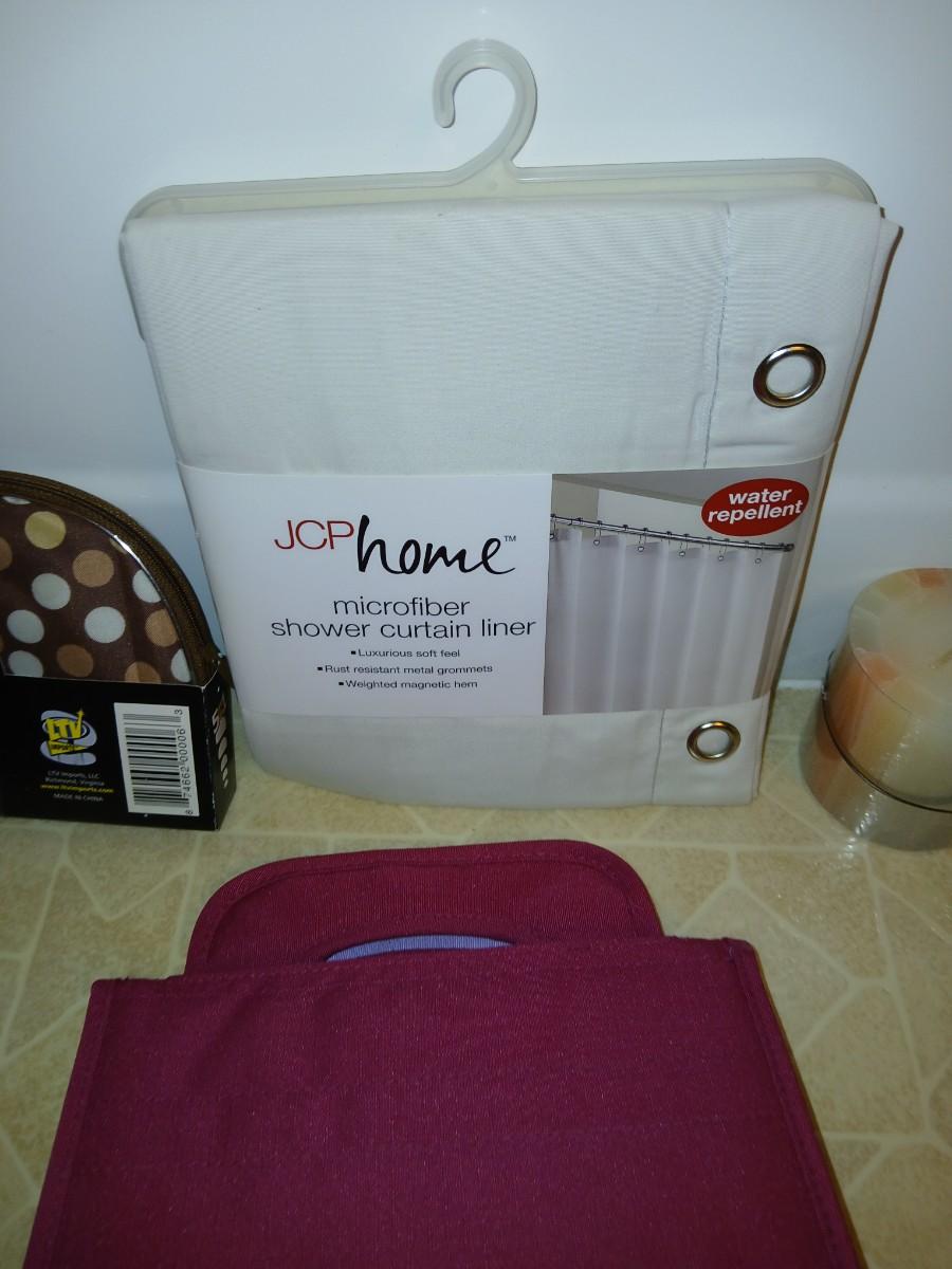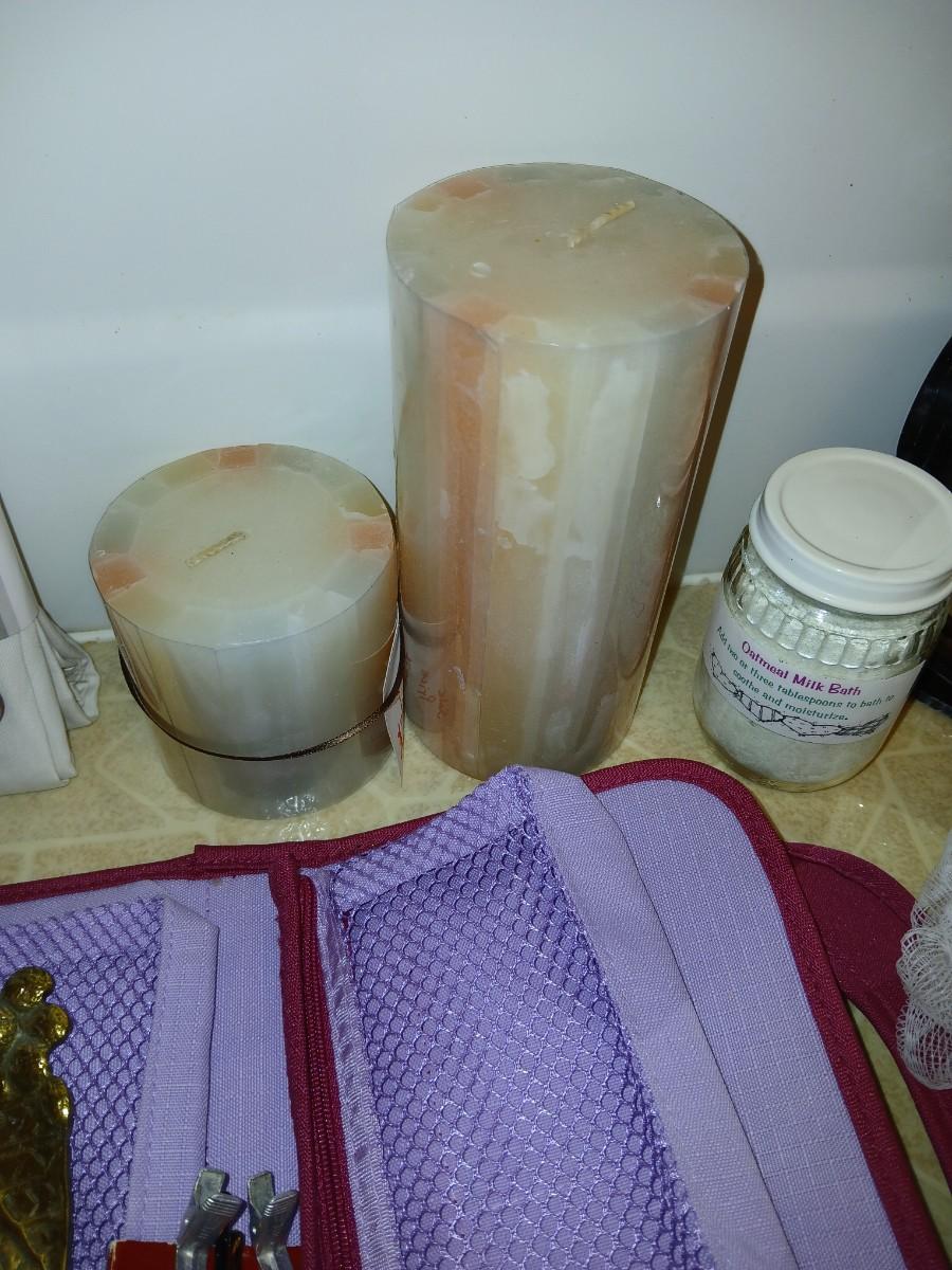 Ladies' spa day! Candles, makeup stoage bags, new shower liner, bath towel, and more