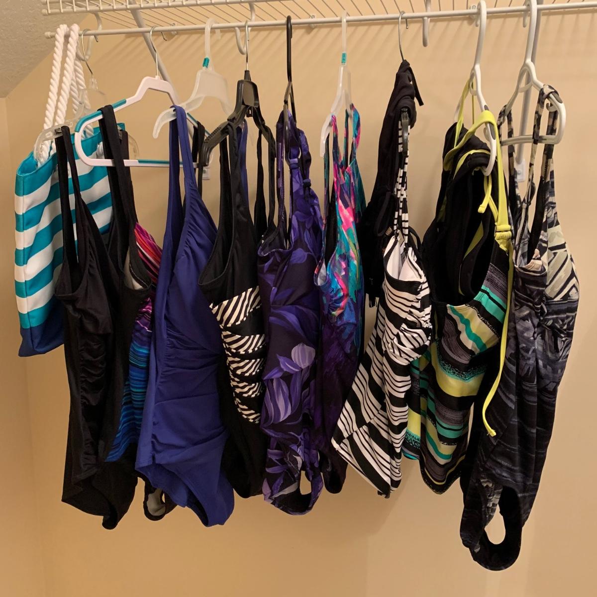 Nine ladies swimsuits and one beach tote. Two of the swimsuit are two-piece and the rest are one piece. Please see photos for details.