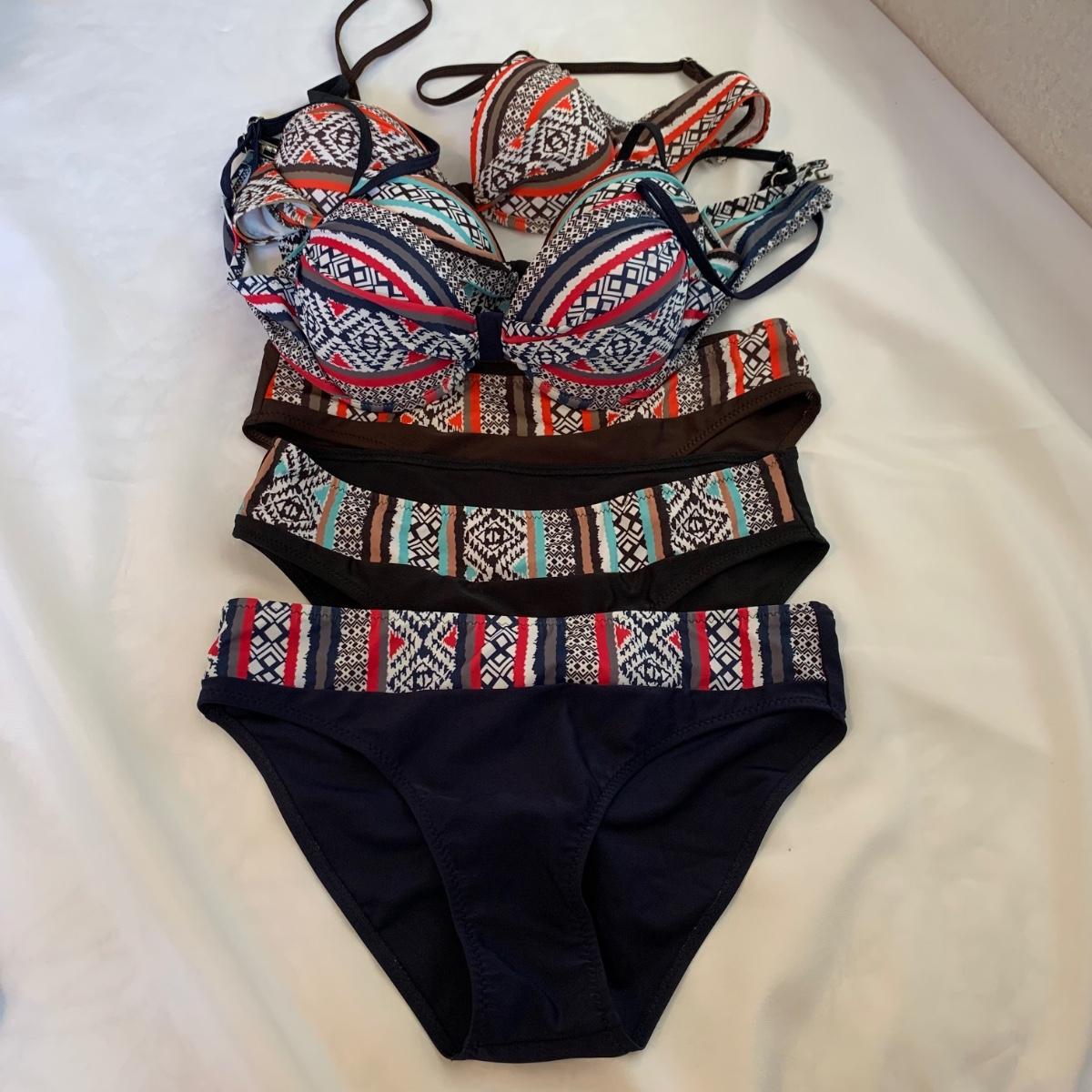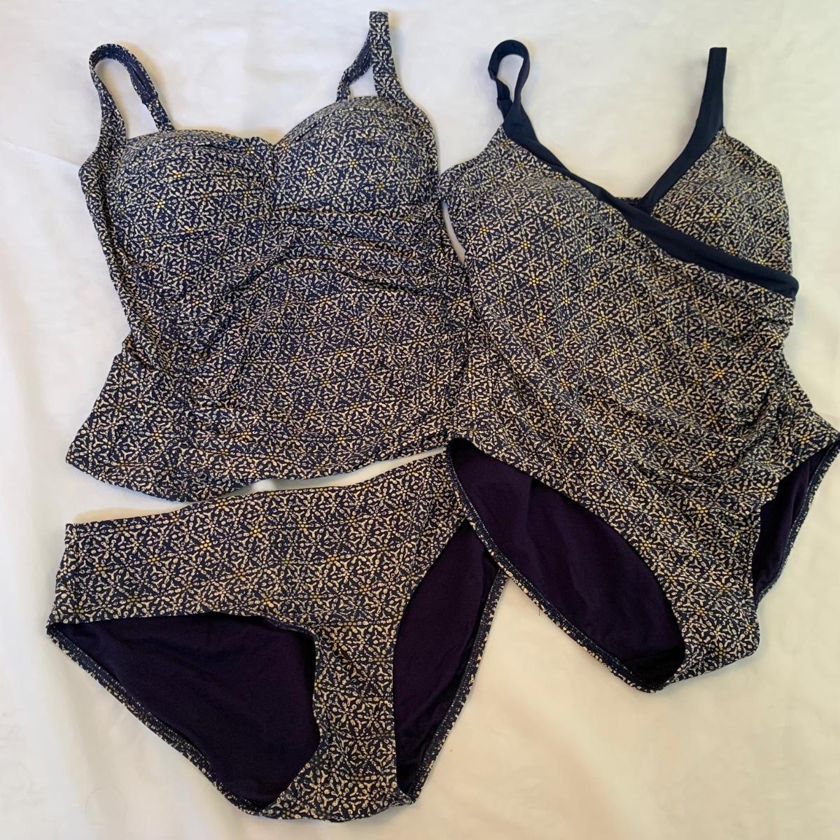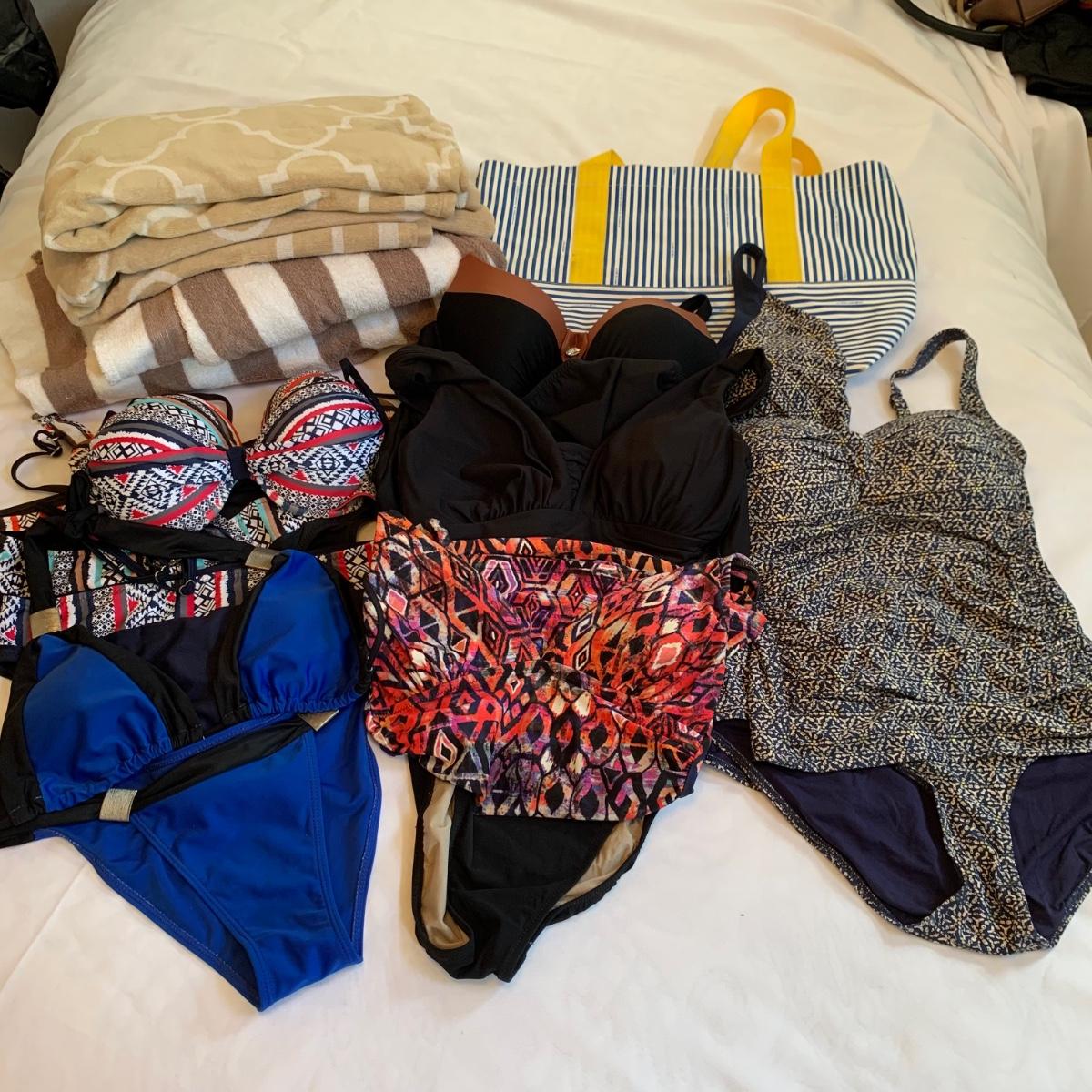 Nine ladies swimsuits, mostly size S or M. There are four bikinis, two tankinis, and three one piece suits. Any tags found were photographed. Also included is a Lancôme bag and four beach towels. The striped towels are designed to hang over a beach chair. Shipping available. Shipping can be costly. We suggest contacting our preferred local shipping provider, Postage Express, with dimensions and getting an estimate before bidding: (828) 670-5501 or postageexpress@yahoo.com.