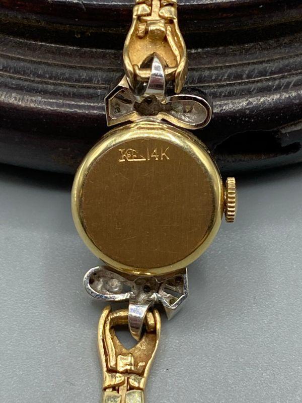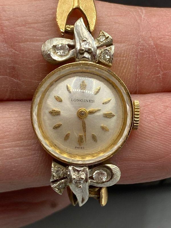Vintage ladies Longines watch. 14k yellow gold, stamped on the latch and watch back. 6.5" length. Currently not running but in otherwise good condition. Does need the hook on the latch straightened so it will close completely.