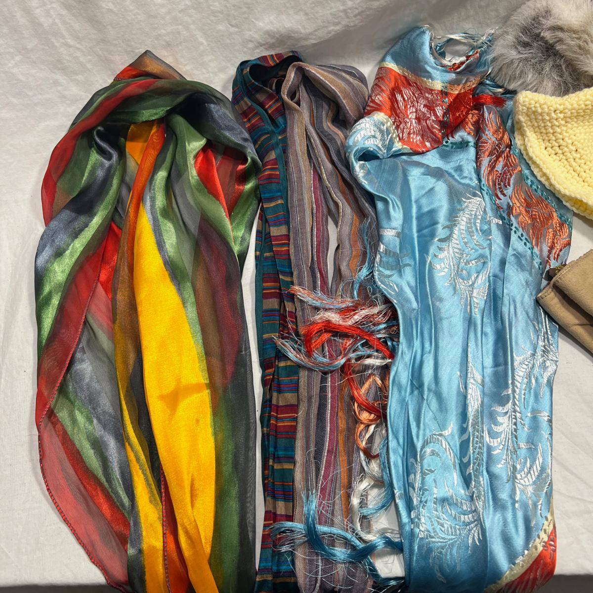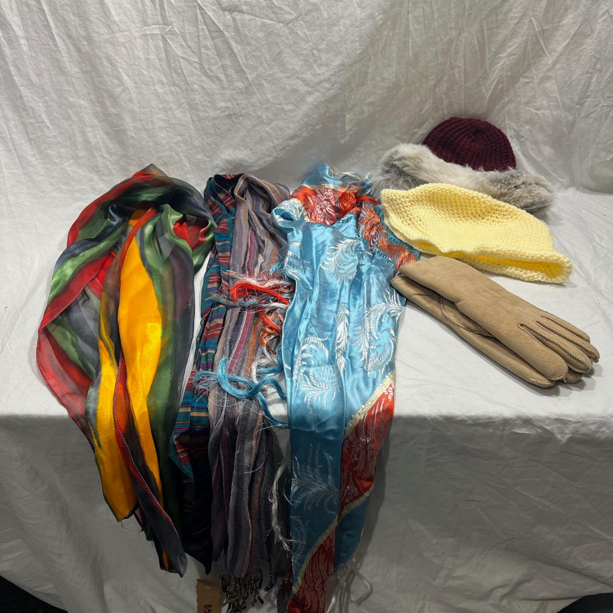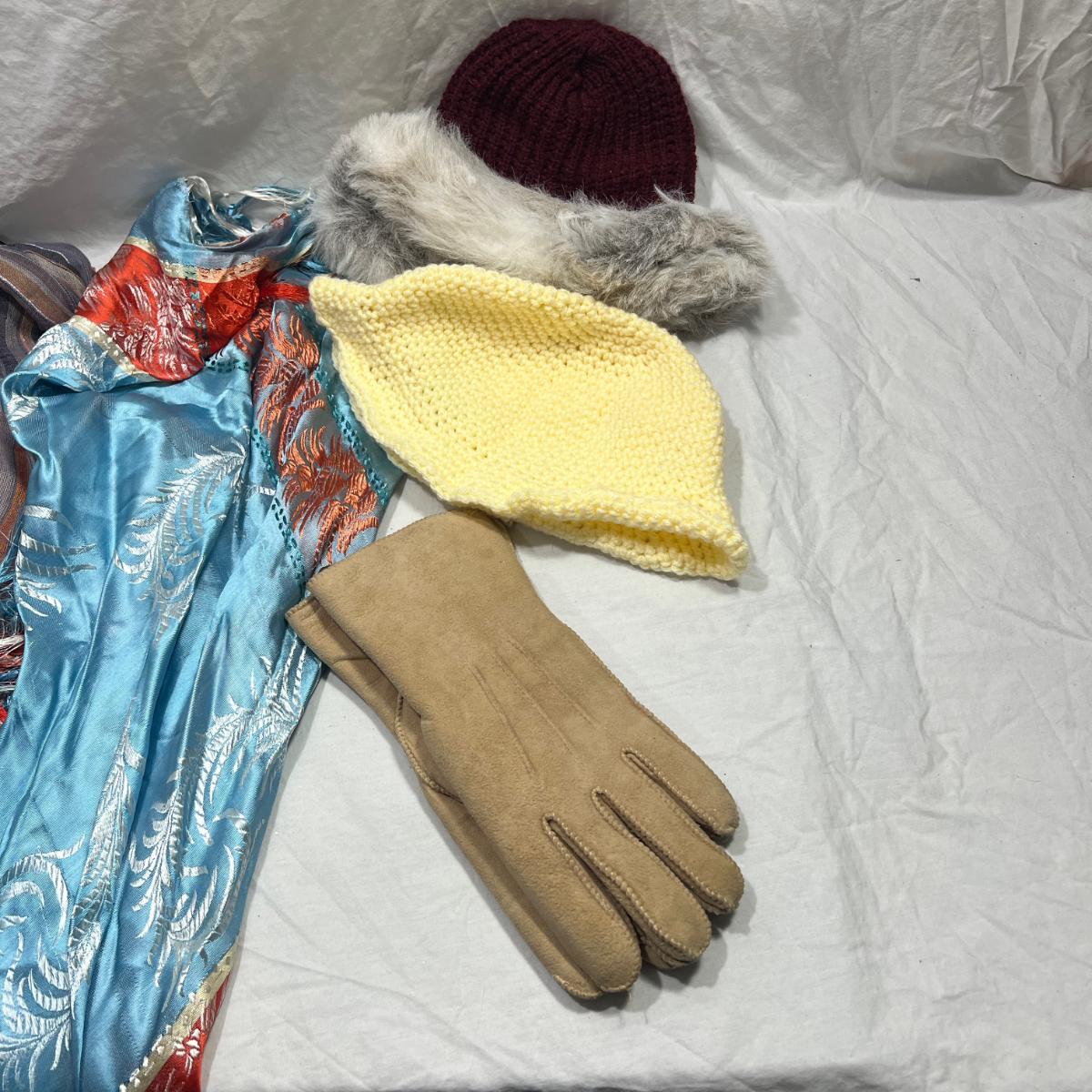 4 scarfs, two knit beanies and one pair of gloves