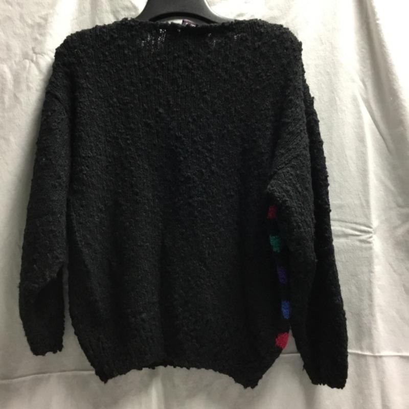 Here we have a Pink, teal, purple, blue and black sweater. Elastic in the sleeve cuffs are shot from age but aside from that the sweater has no tears or snags. See pictures.