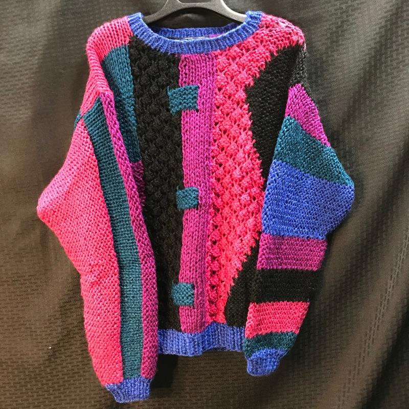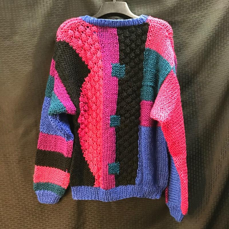 Up for auction is a black, purple, pink, and teal knitted sweater. It is in excellent condition with no rips, or holes; see pictures.