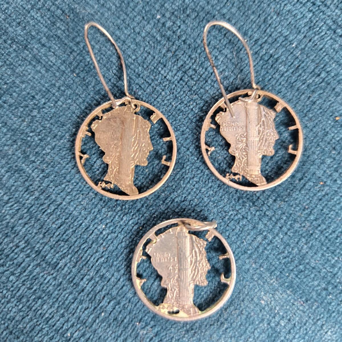 This lot is for a grouping of Lady Liberty Earrings and a Pendant. Cut from silver dimes these are a fun vintage jewelry item. Nice find.