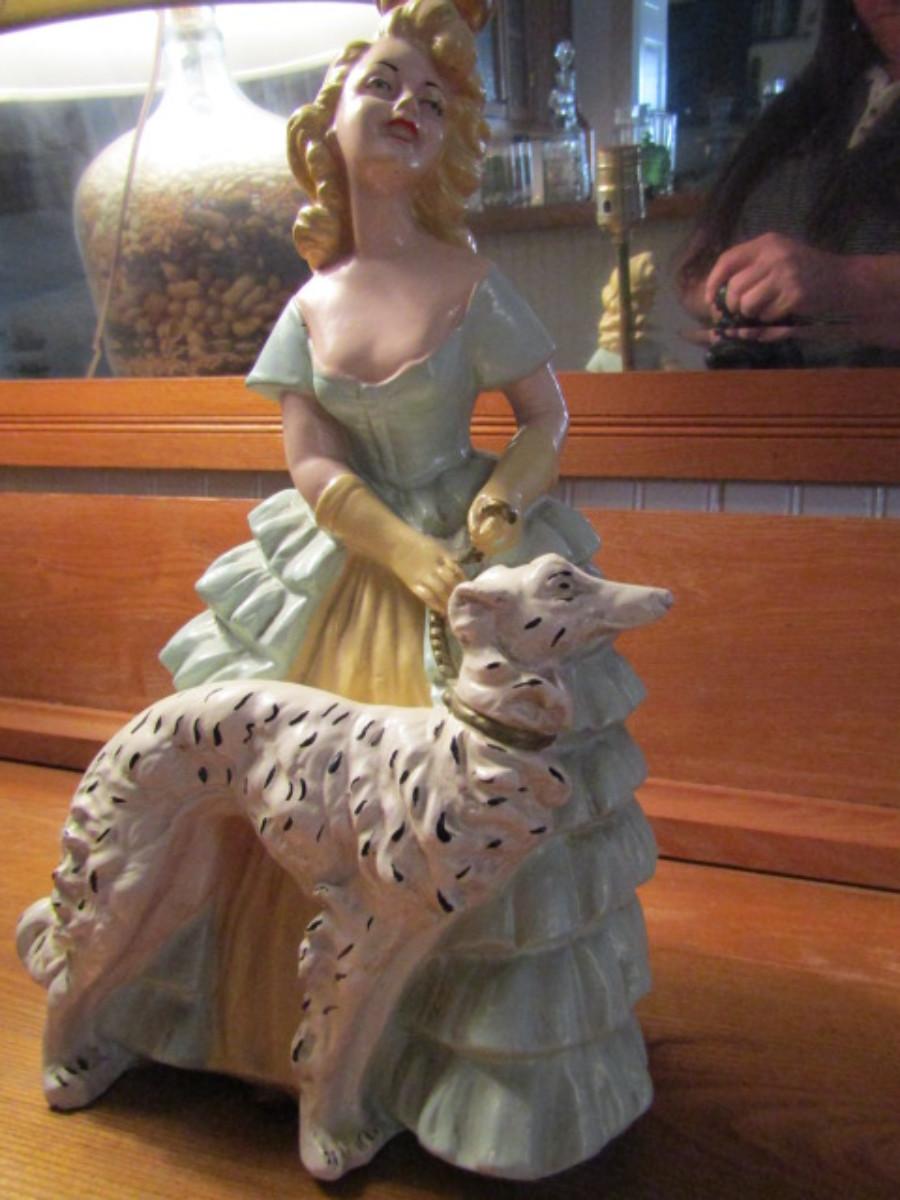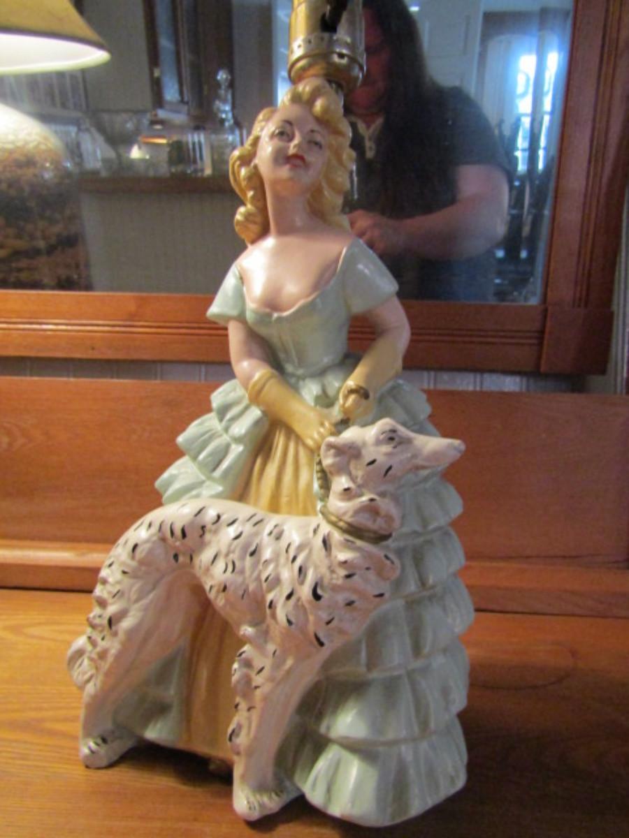 Lady with Dog Vintage Lamp Base- Needs to be Rewired and Shade. Probably made of either ceramic or chalkware.