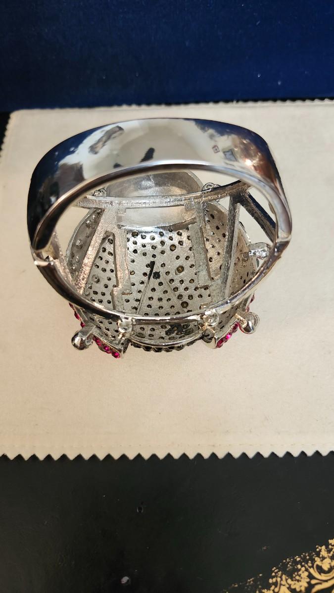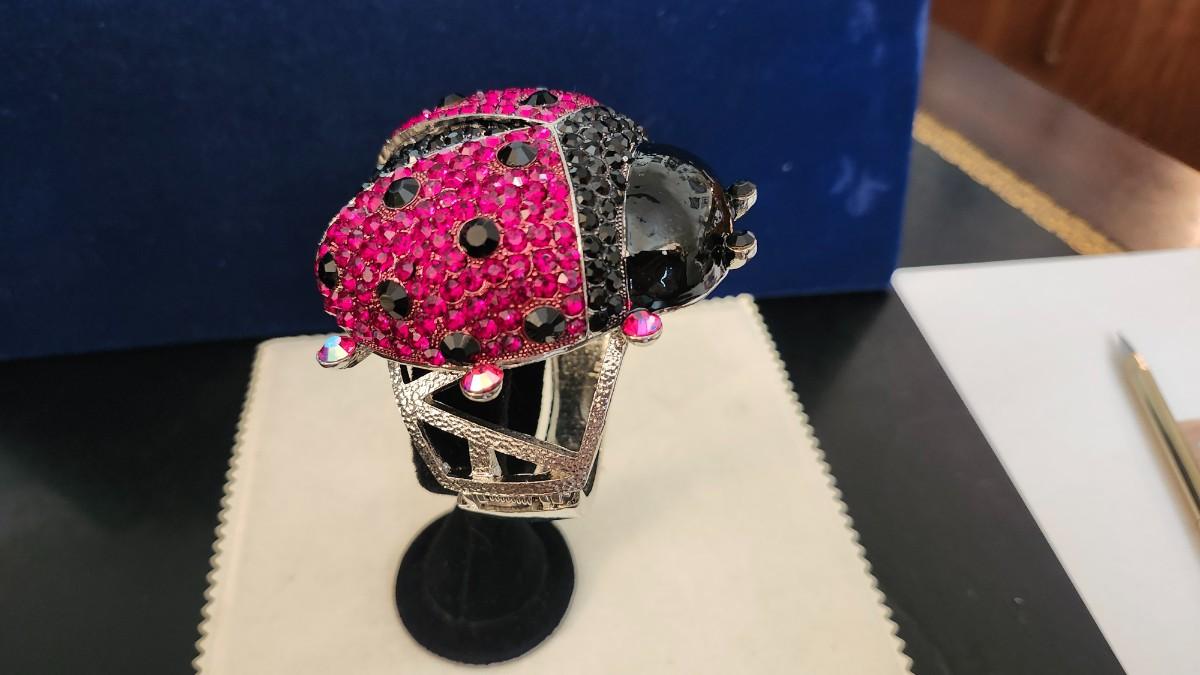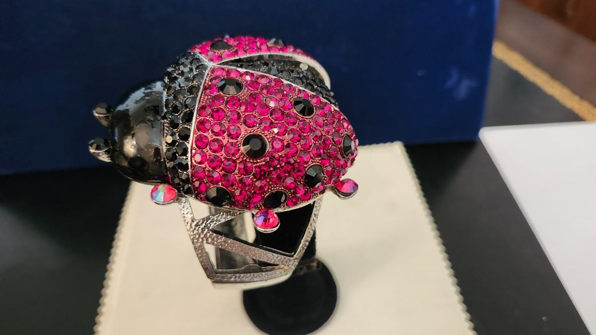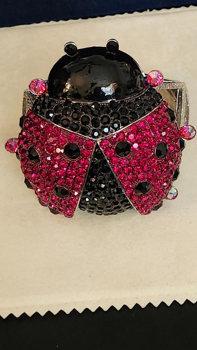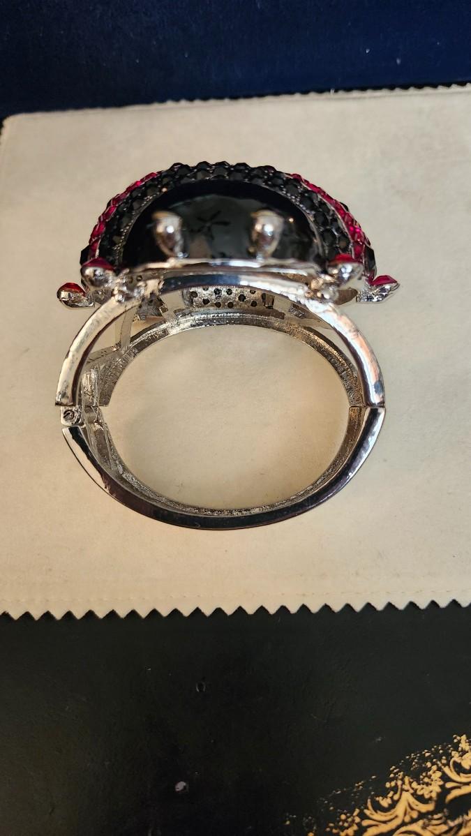 This very large clamper bracelet has silver-toned metal as the base, set with faceted Czech crystals. The clamp and hinge are secure. It is listed online at $325, and yes, they are calling it a Ladybird. In Ireland, a Ladybird is a symbol of protection, in very nice condition.