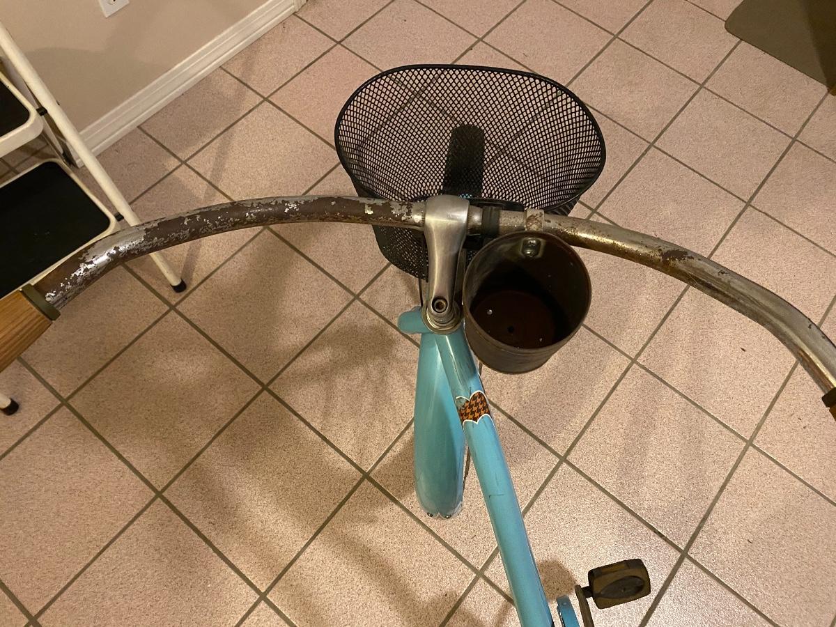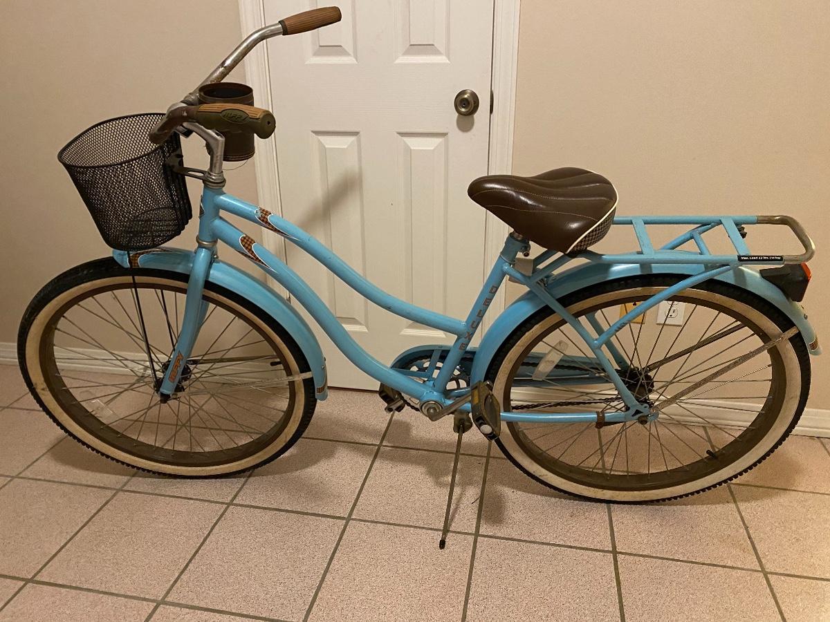 Lady’s Huffy Deluxe Bicycle 26”, vintage-style, aqua color with basket, cup holder & bookrack. Has some rust on the handlebars, but otherwise in great condition.
