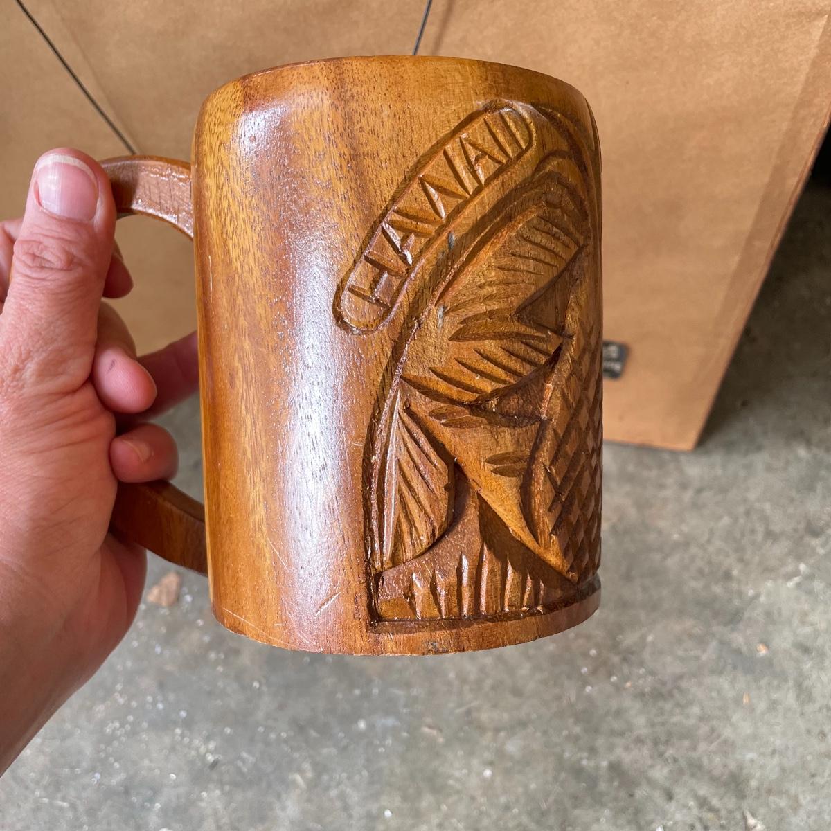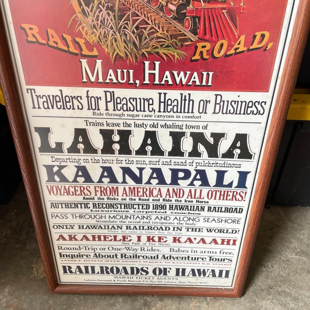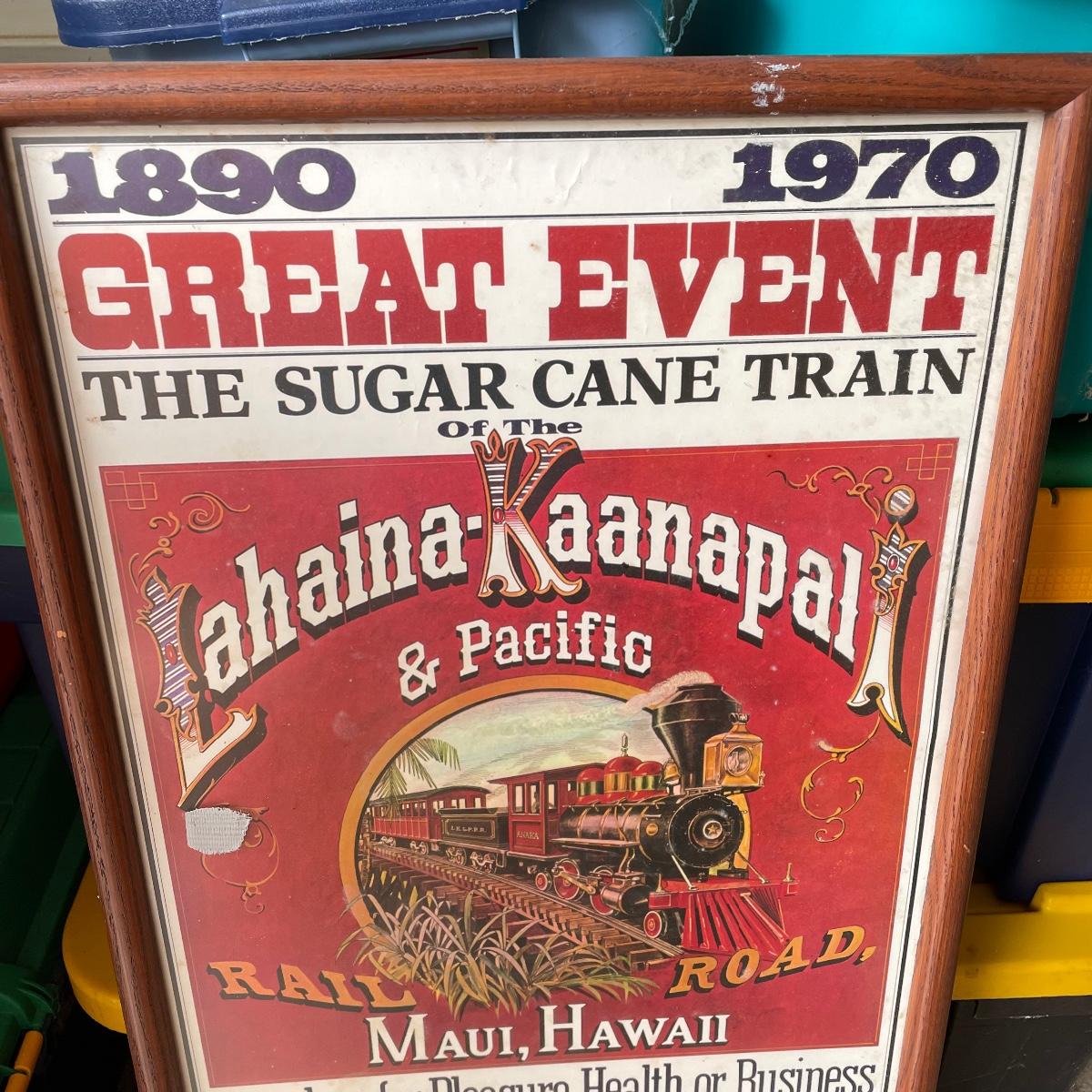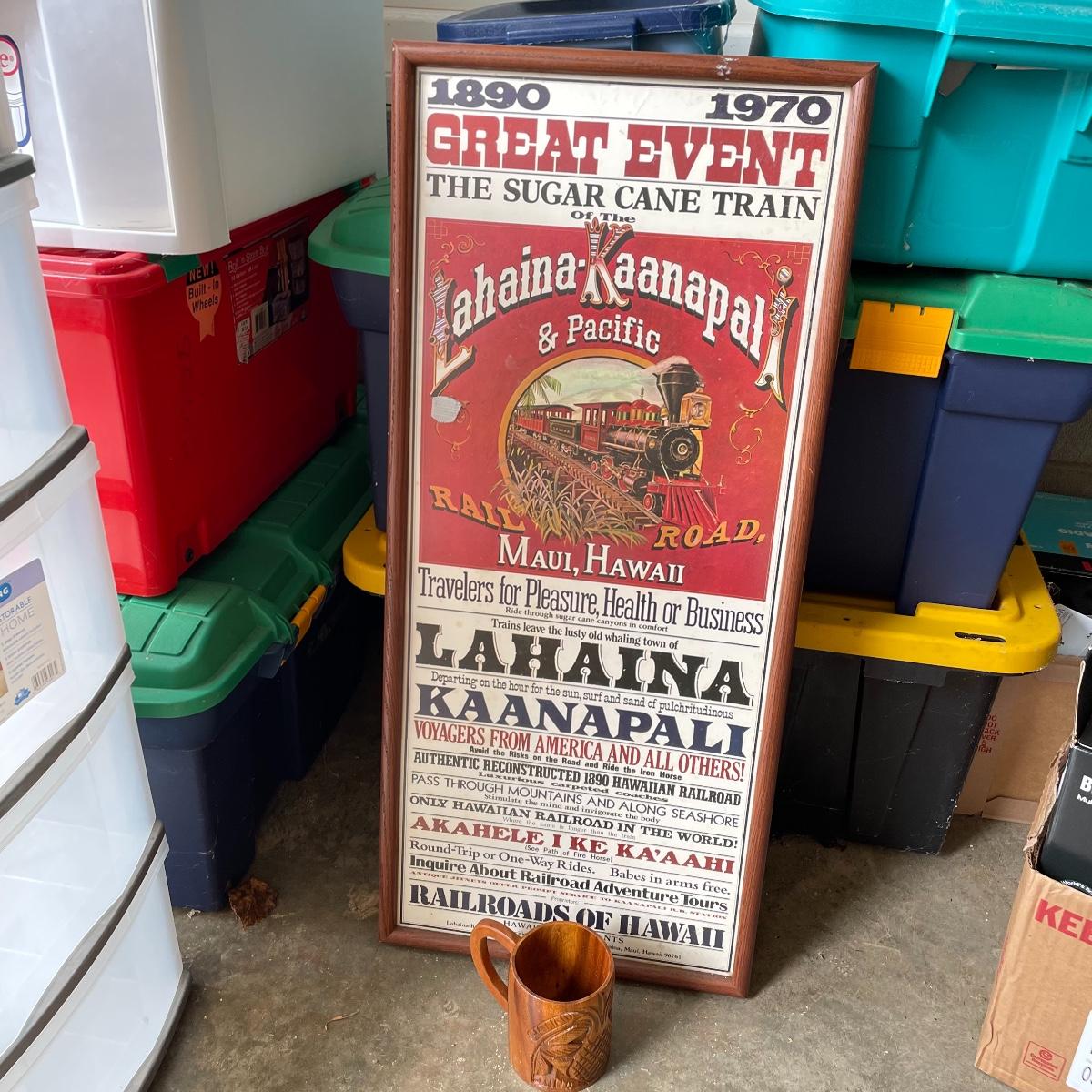 Great Event framed art featuring the Sugar Cane Train of the Lahaina-Kaanapal & Pacific Rail Road. Frame and glass have some duct tape residue. It measures 15” x 35.25”. Lot also includes a carved wooden Hawaiian mug. Local pick up only.