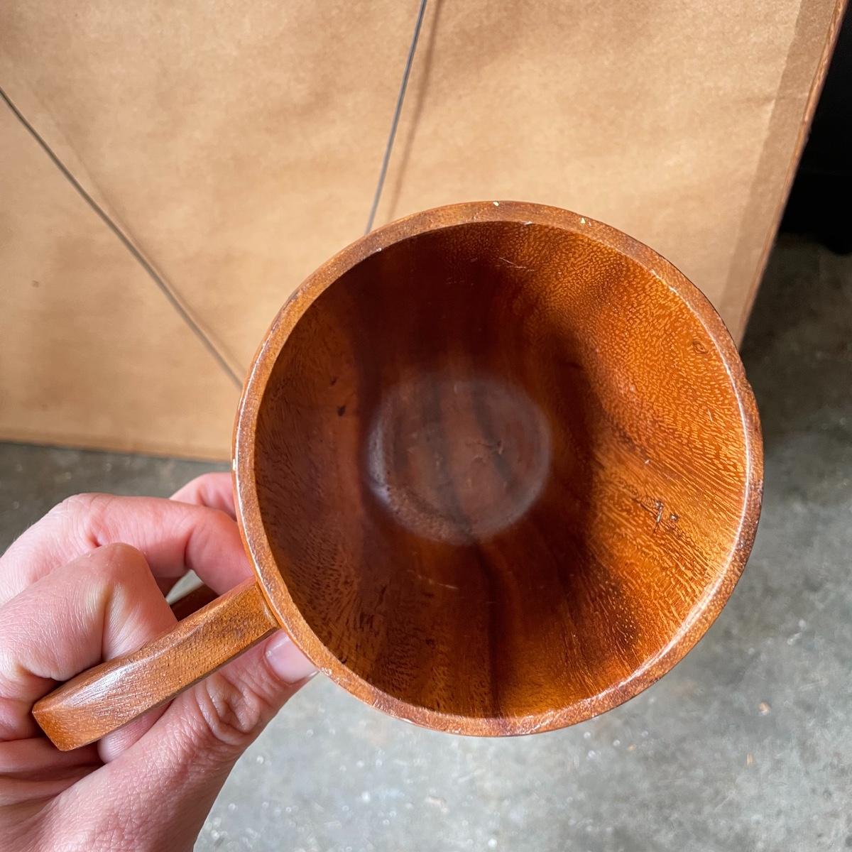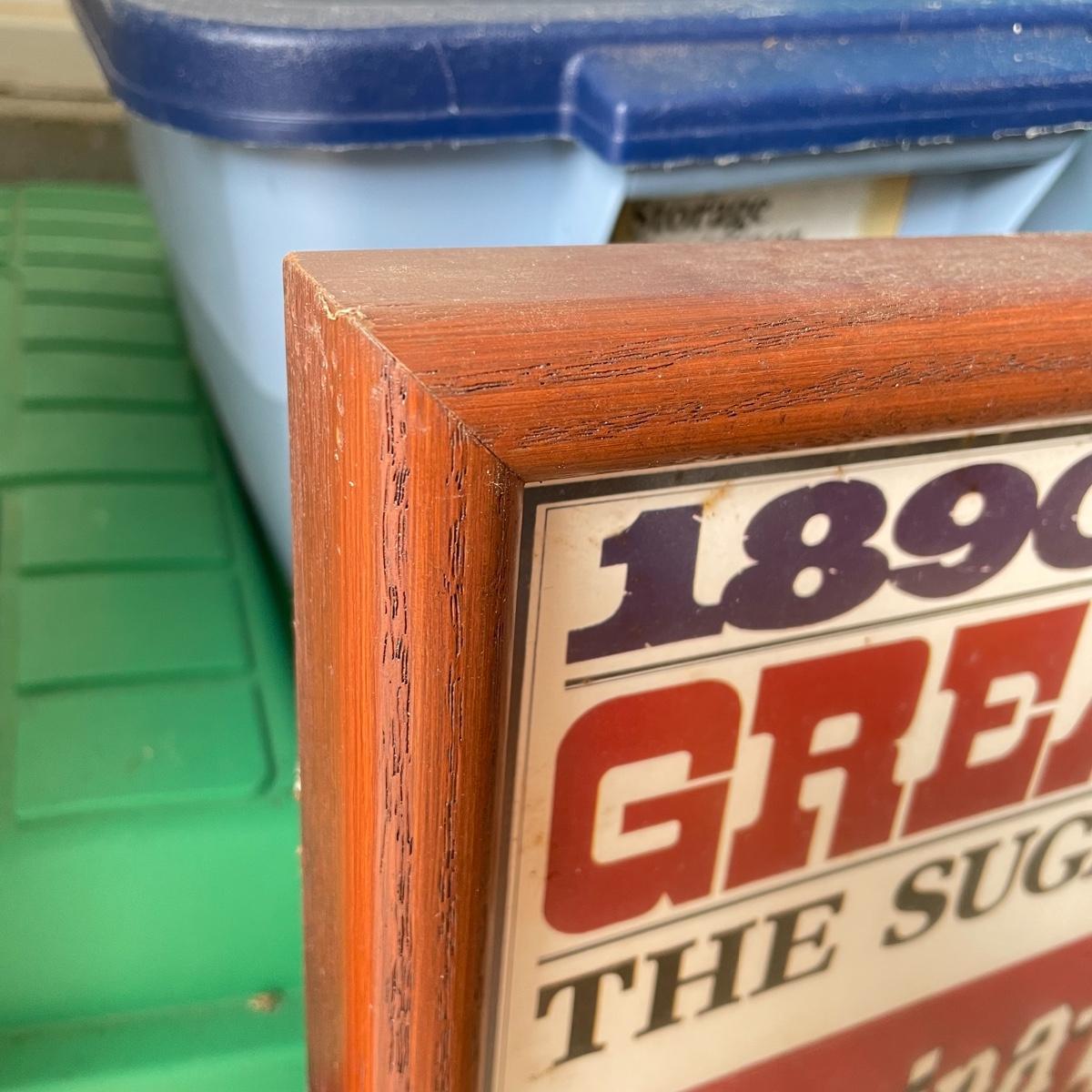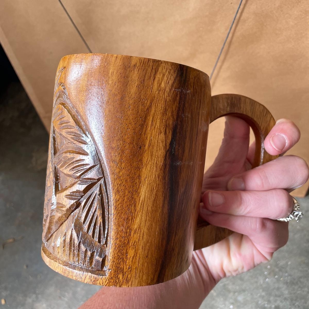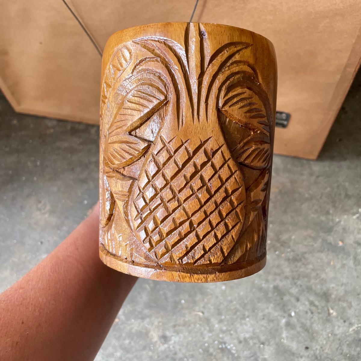 Great Event framed art featuring the Sugar Cane Train of the Lahaina-Kaanapal & Pacific Rail Road. Frame and glass have some duct tape residue. It measures 15” x 35.25”. Lot also includes a carved wooden Hawaiian mug. Local pick up only.