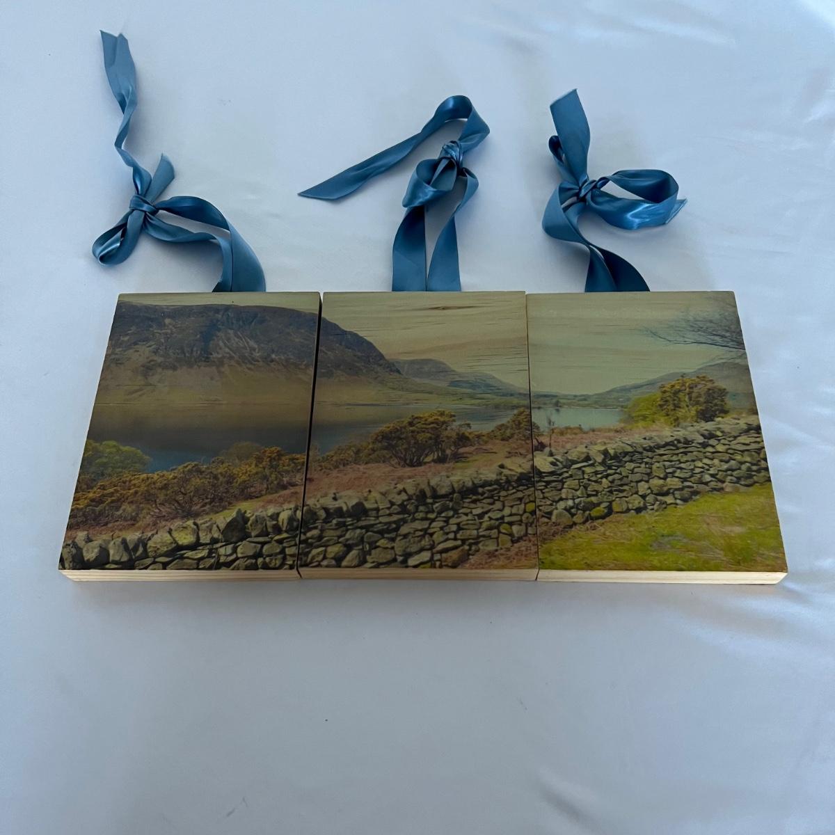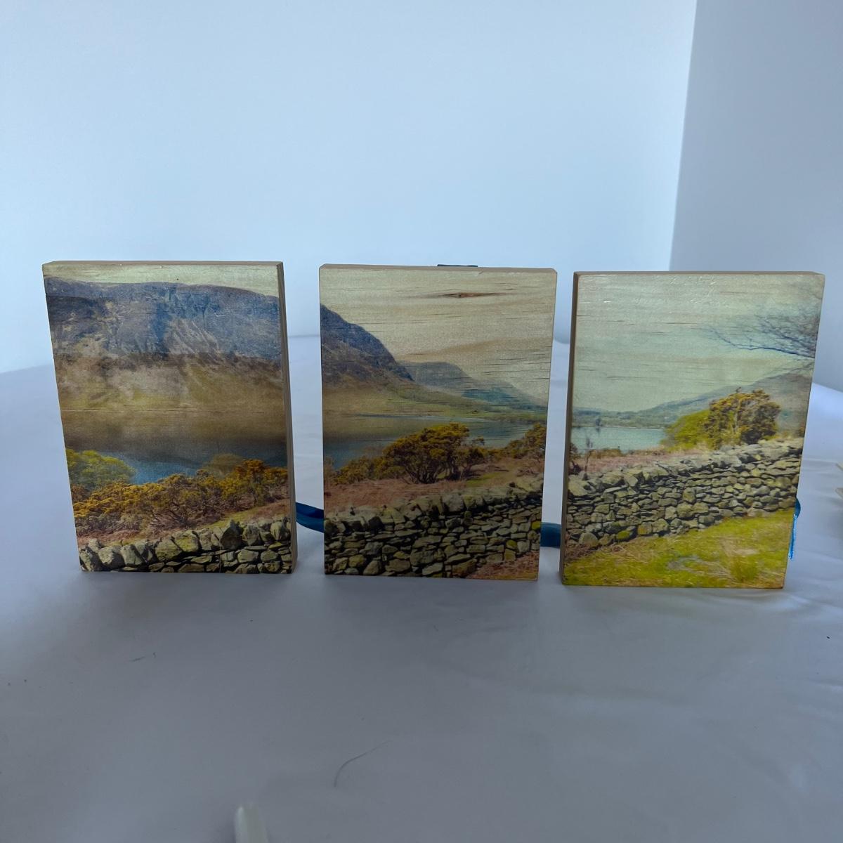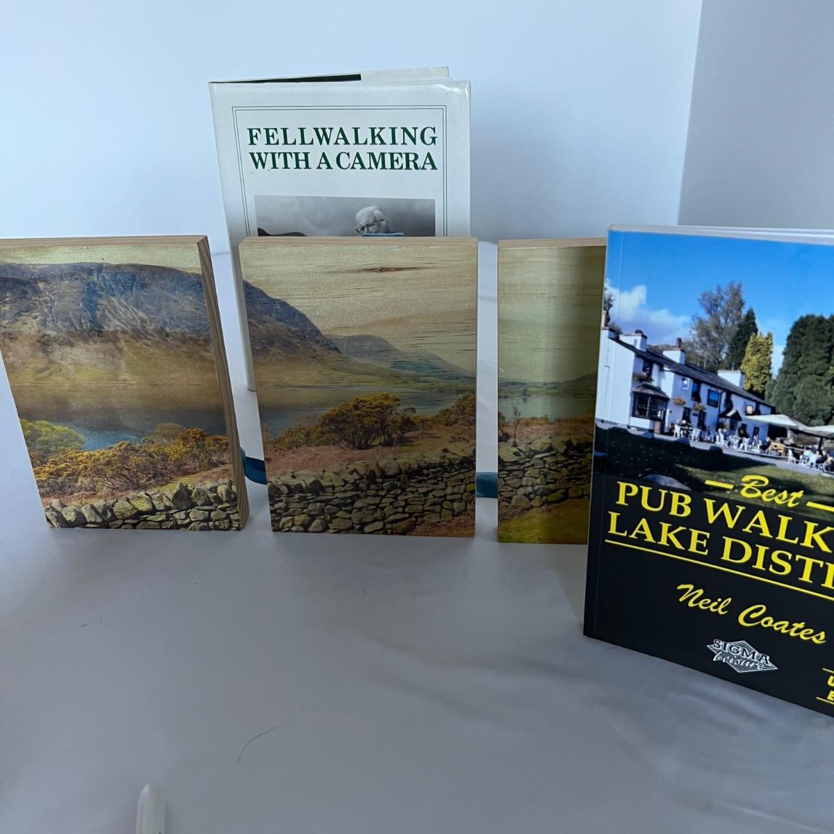 One of the most beautiful scenic places on Earth, the Lake District and this lot celebrates it! Two books include Best Pub Walks in the Lake District and A Wainwright’s Fell Walking With A Camera. The art work is a 3 piece of a “˜fell scene’ printed onto matching wood blocks that hang from blue ribbons. Each block measures 5” x 7”.
