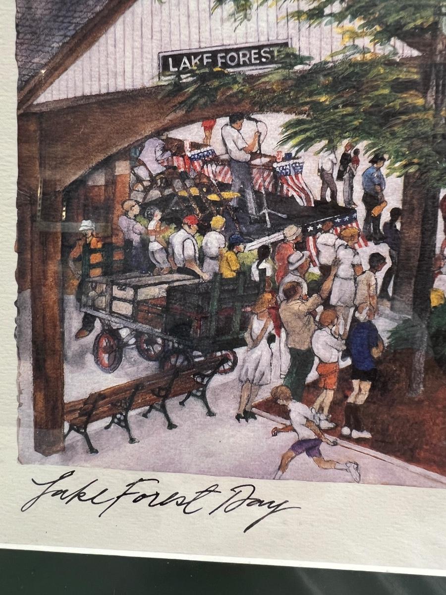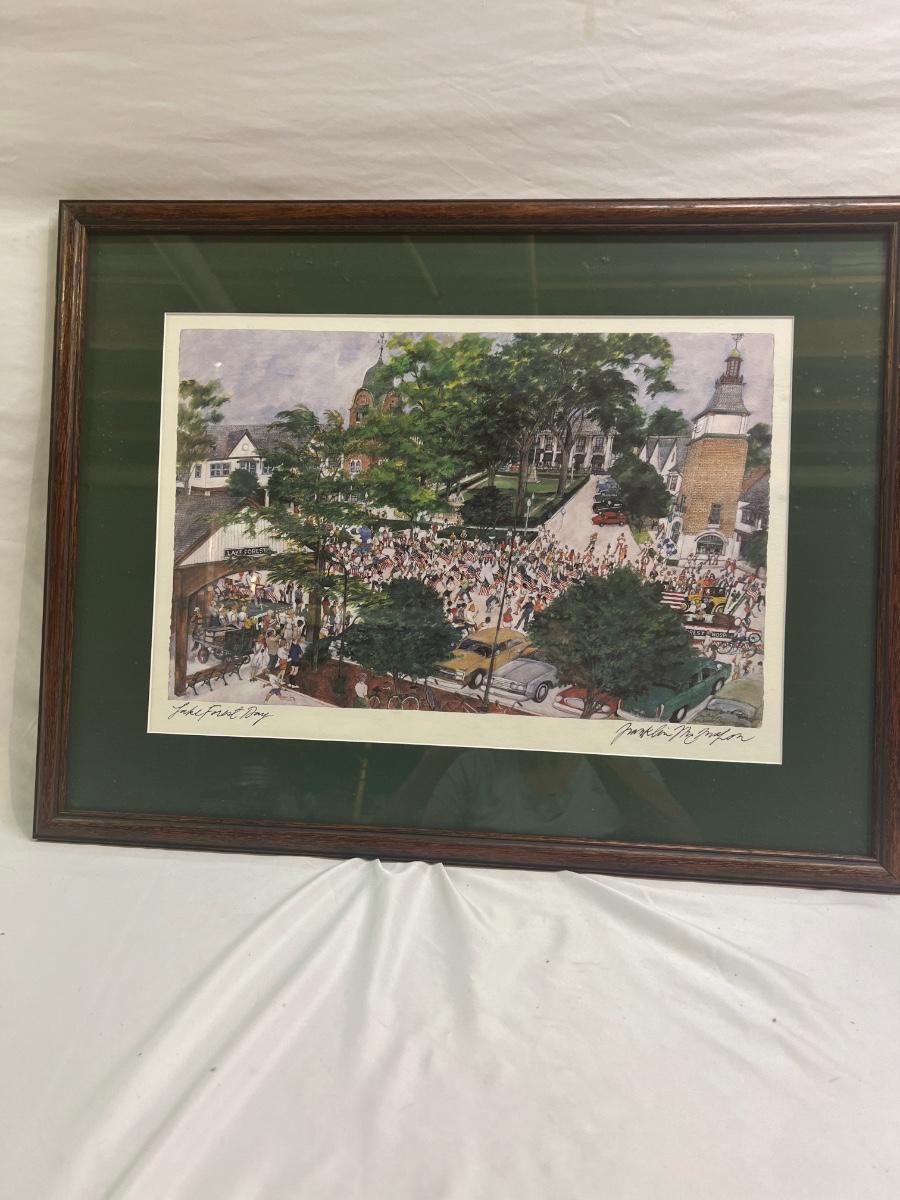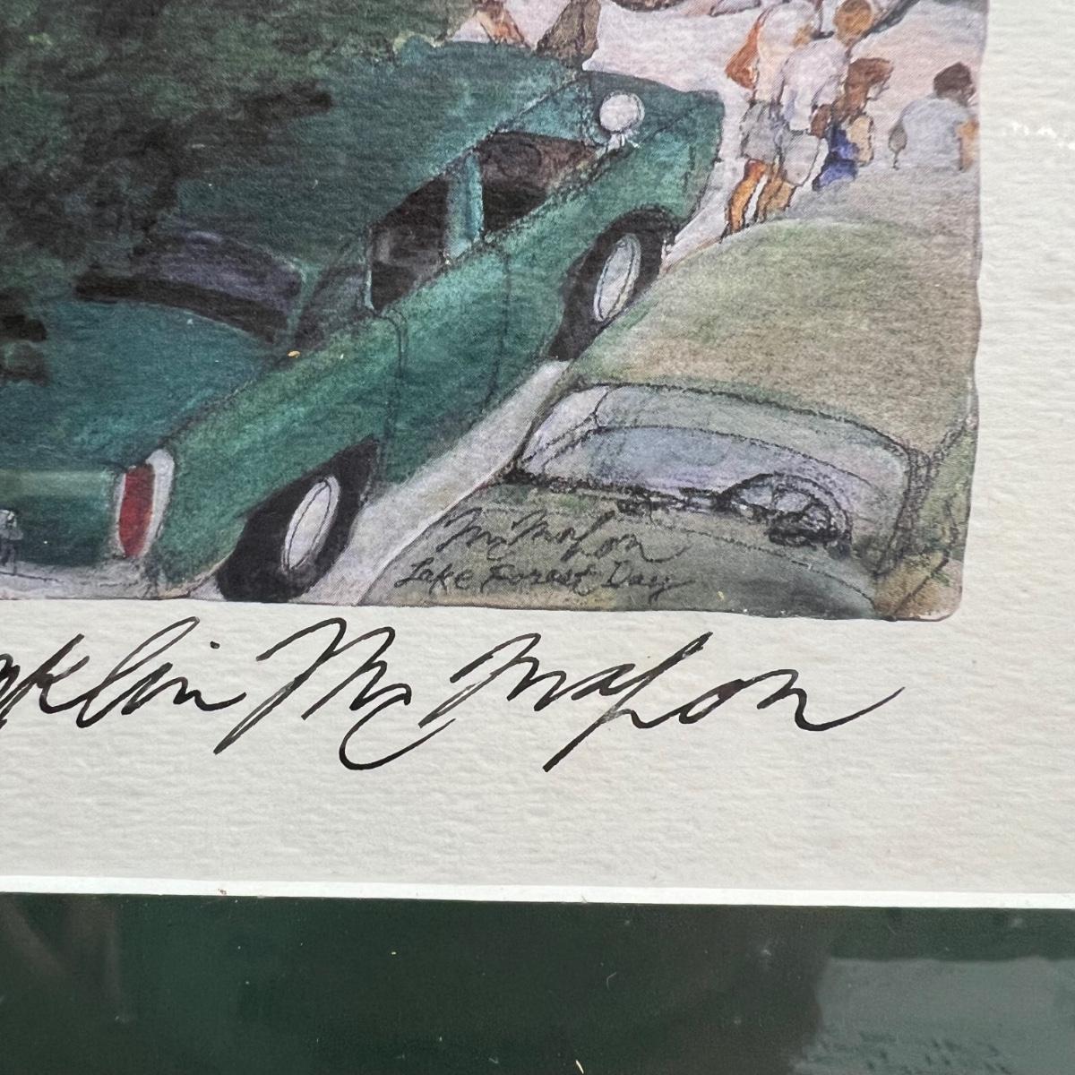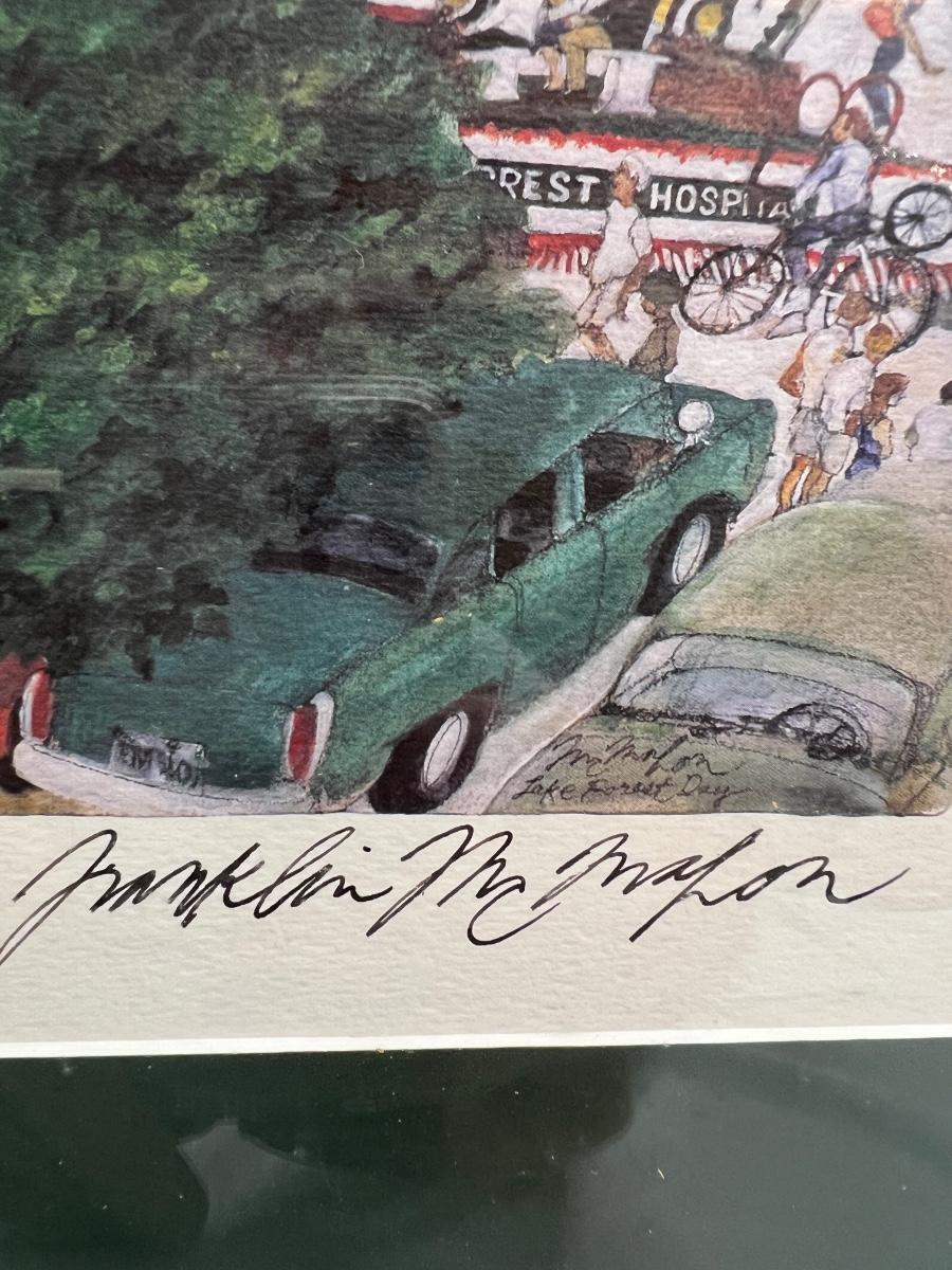 Signed, framed and matted watercolor print “Lake Forest Day” measures 26” x 20”H. The print is signed ‘Franklin McMahon’. The frame is to be wood and the print is behind glass. There is some residue on the glass that appears to be cleanable.