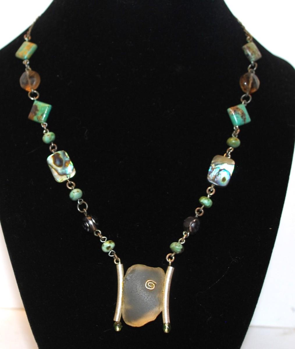 "LakeStone" (Lake Michigan) Necklace with Mother-of-Pearl & Jade-Style Accents 18" L