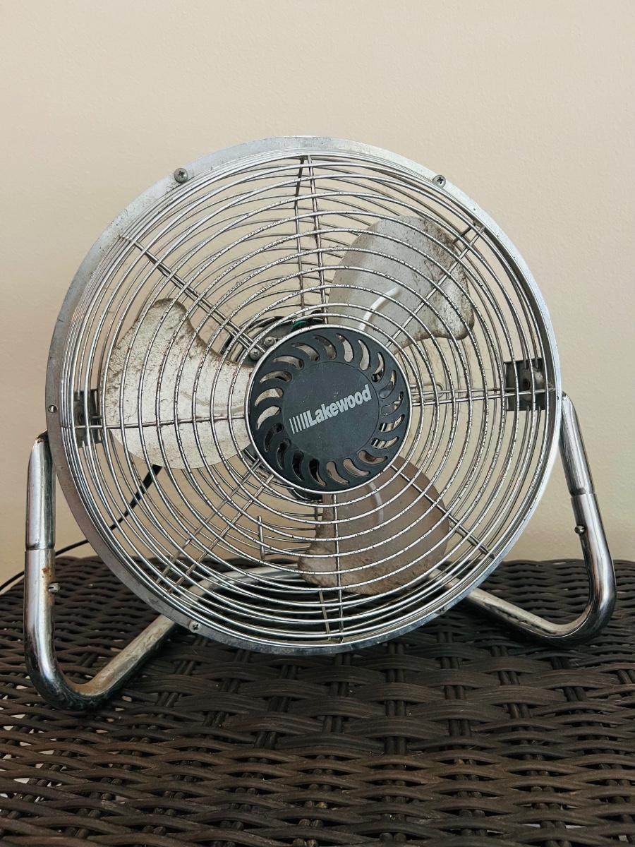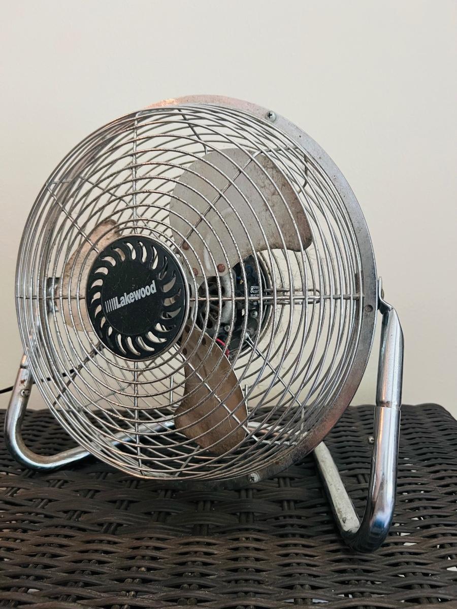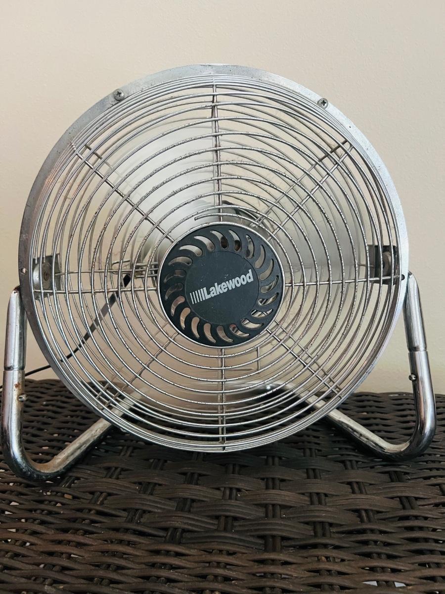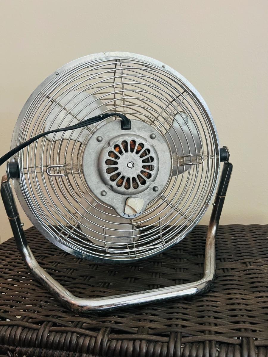 Liquid metal fan with three speeds. Tested and works as it should does have some surface rust and has dust on the blades. Measures 15/2 inches tall and 16 inches wide.