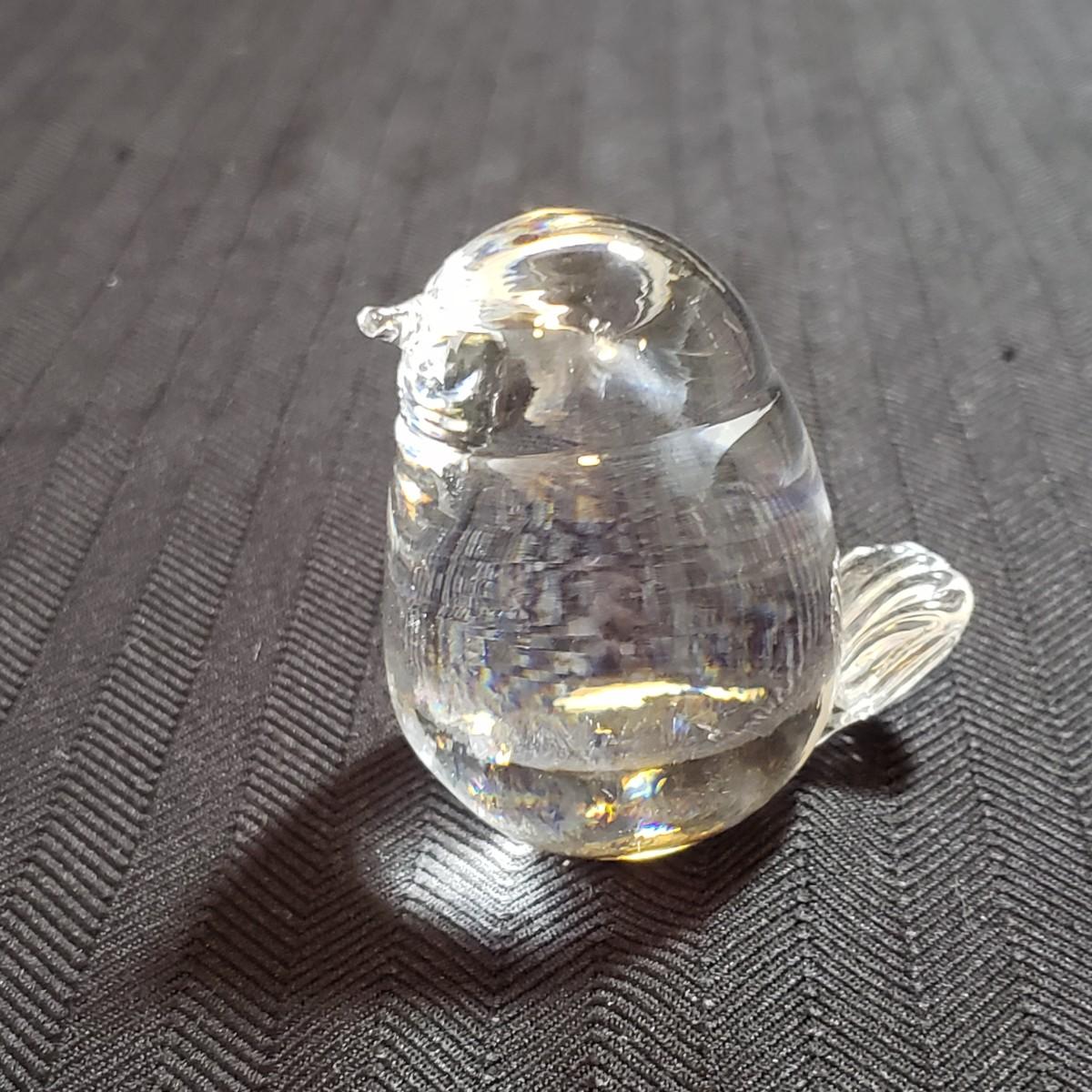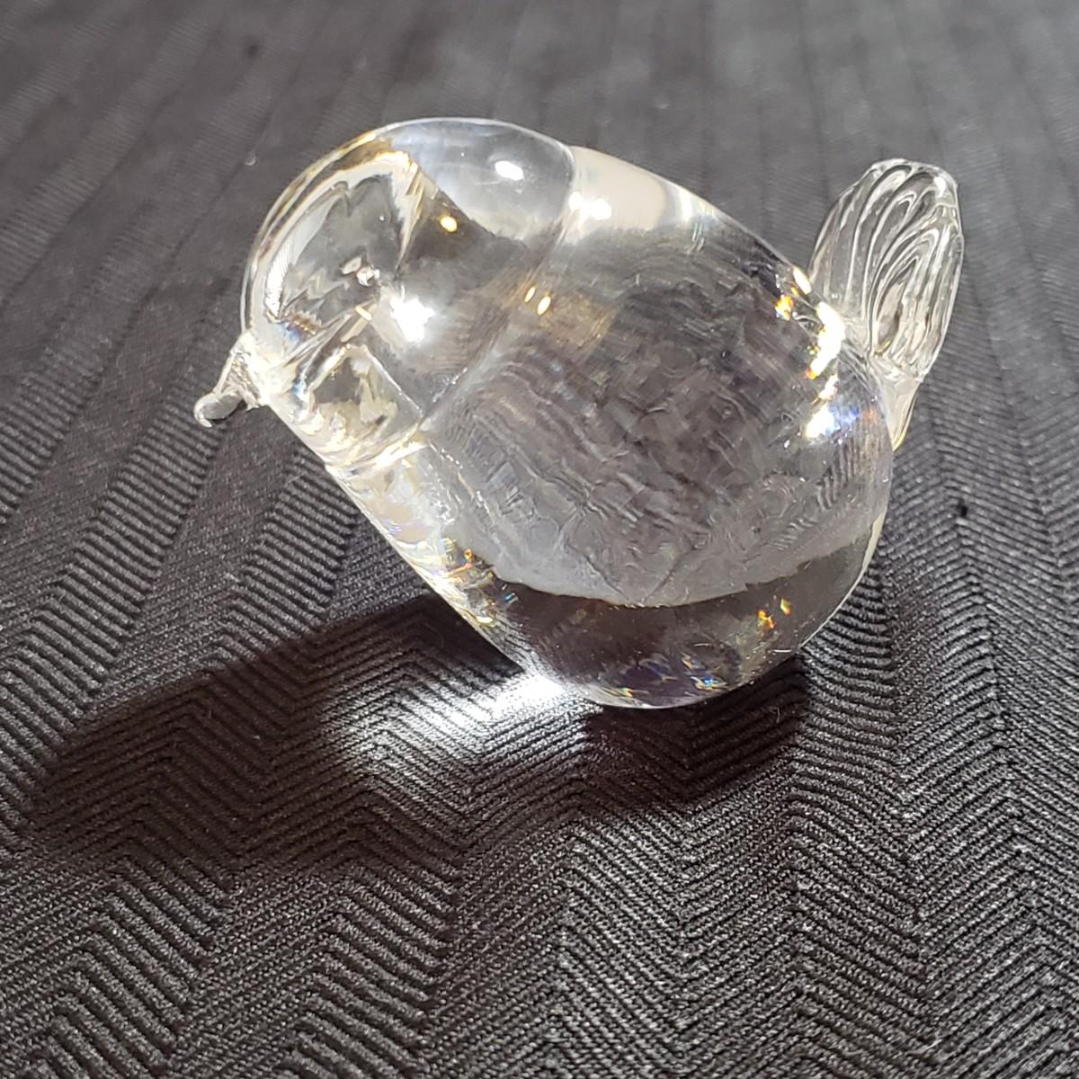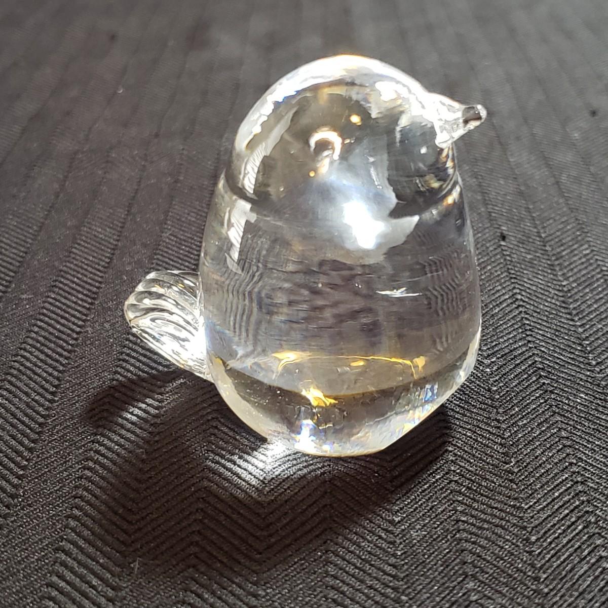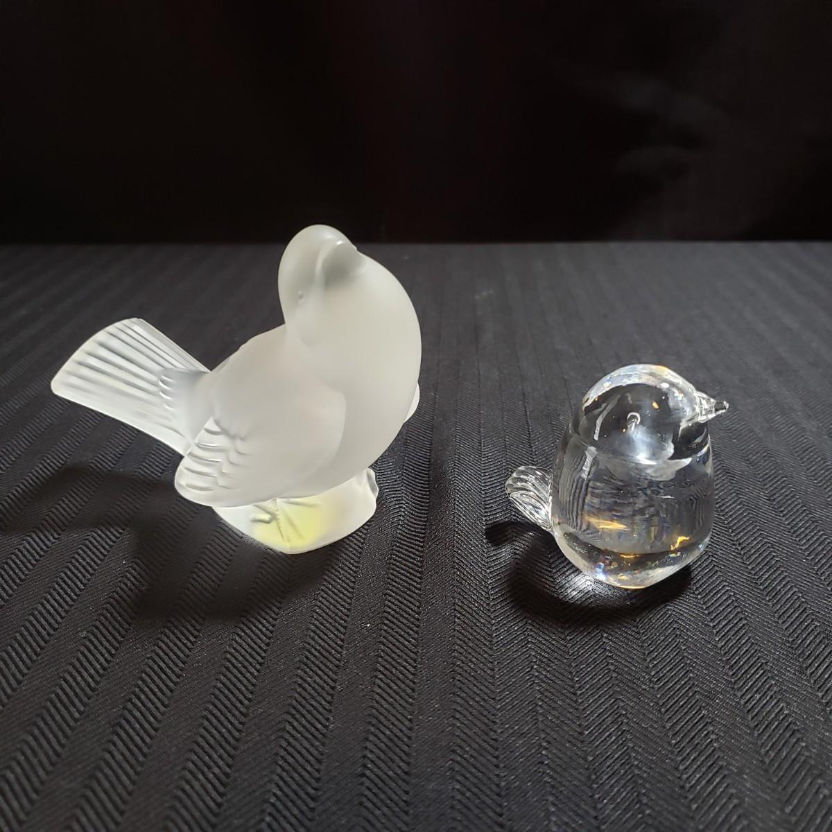 This sweet glass bird lot contains a Lalique frosted sparrow made in France. The bird measures approximately 4" x 2" x 4"H. Signature appears to read ‘Lalique. The smaller clear glass bird has two flattened areas so the bird can sit up or down, see last two pictures. Both pieces appear to be blemish free.