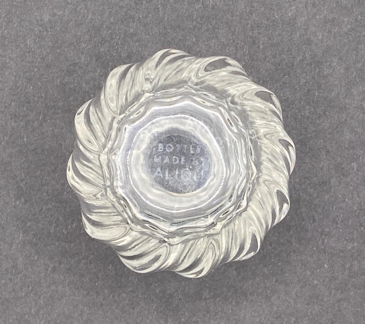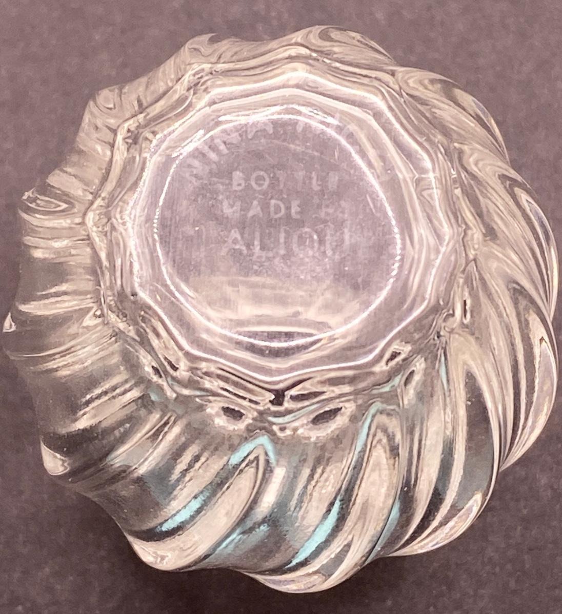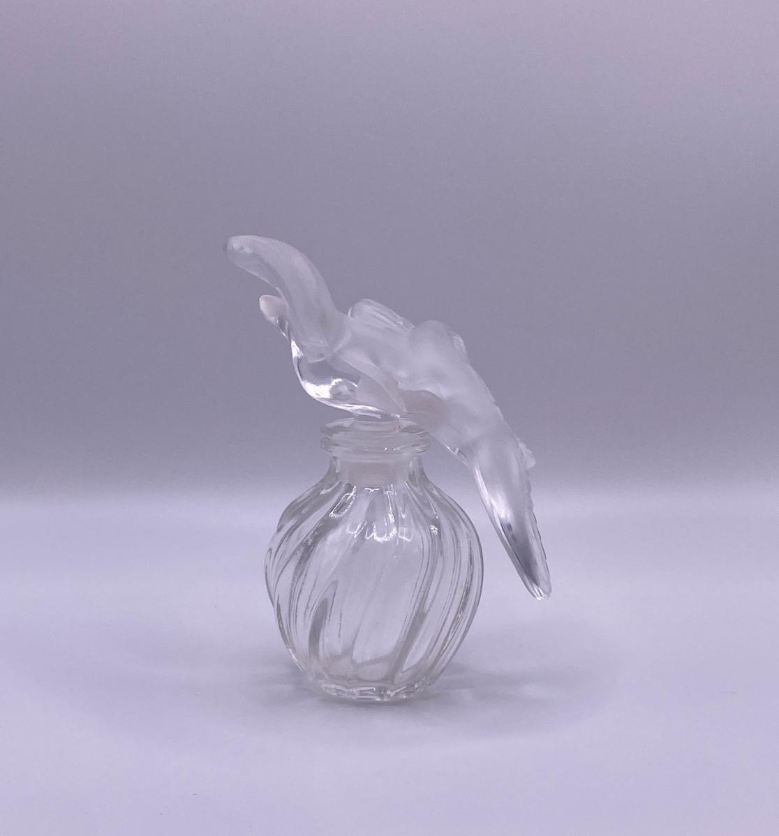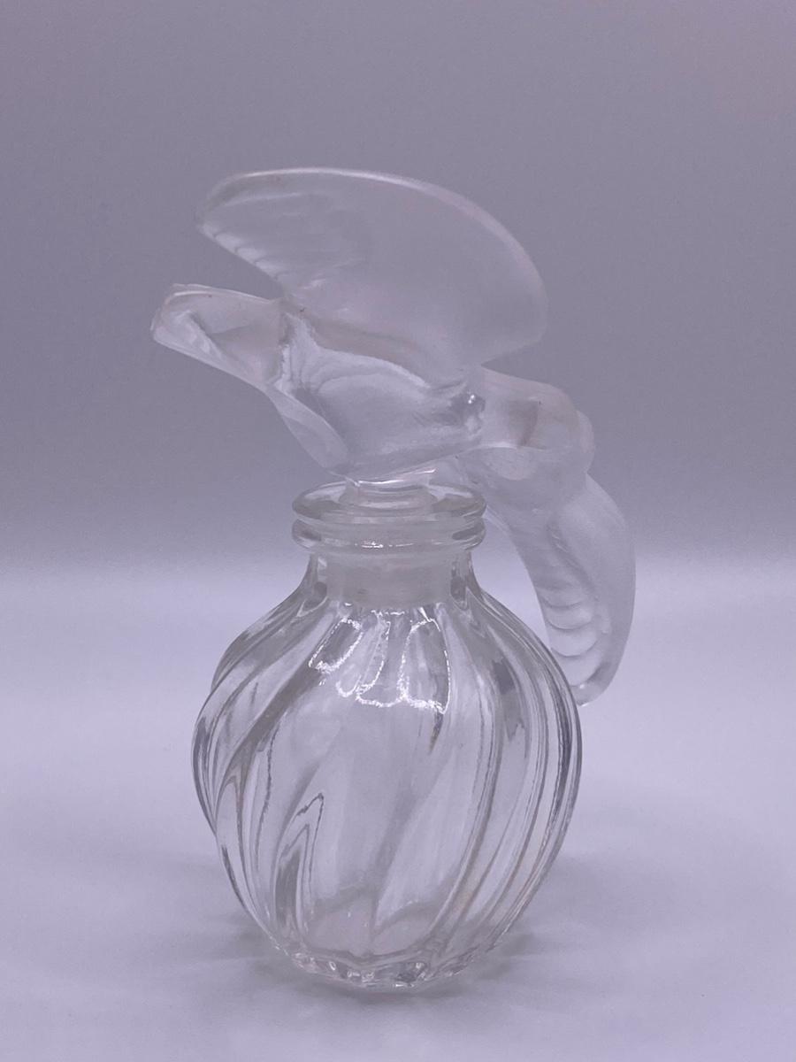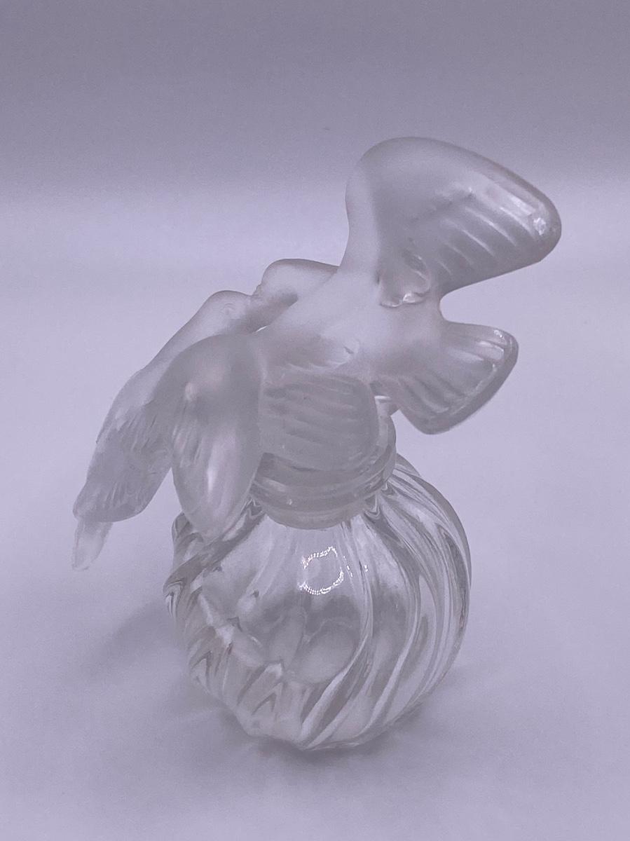 Lalique Perfume Bottle for “L’air du Temps” Perfume by Nina Ricci. The L'air du Temps design features a stopper of two frosted kissing doves on a twisted ridged bottle body.The original design for the "L'Air du Temps" perfume bottle was by the sculptor Jean Rebull, and was in the shape of a sun, but it was Marc Lalique who produced the iconic two doves atop a swirling ribbed body version, as presented here, for Nina Ricci. It was first produced in 1951 “🦆 Incidentally, Marc Lalique was friends with Nina Ricci's son Robert.