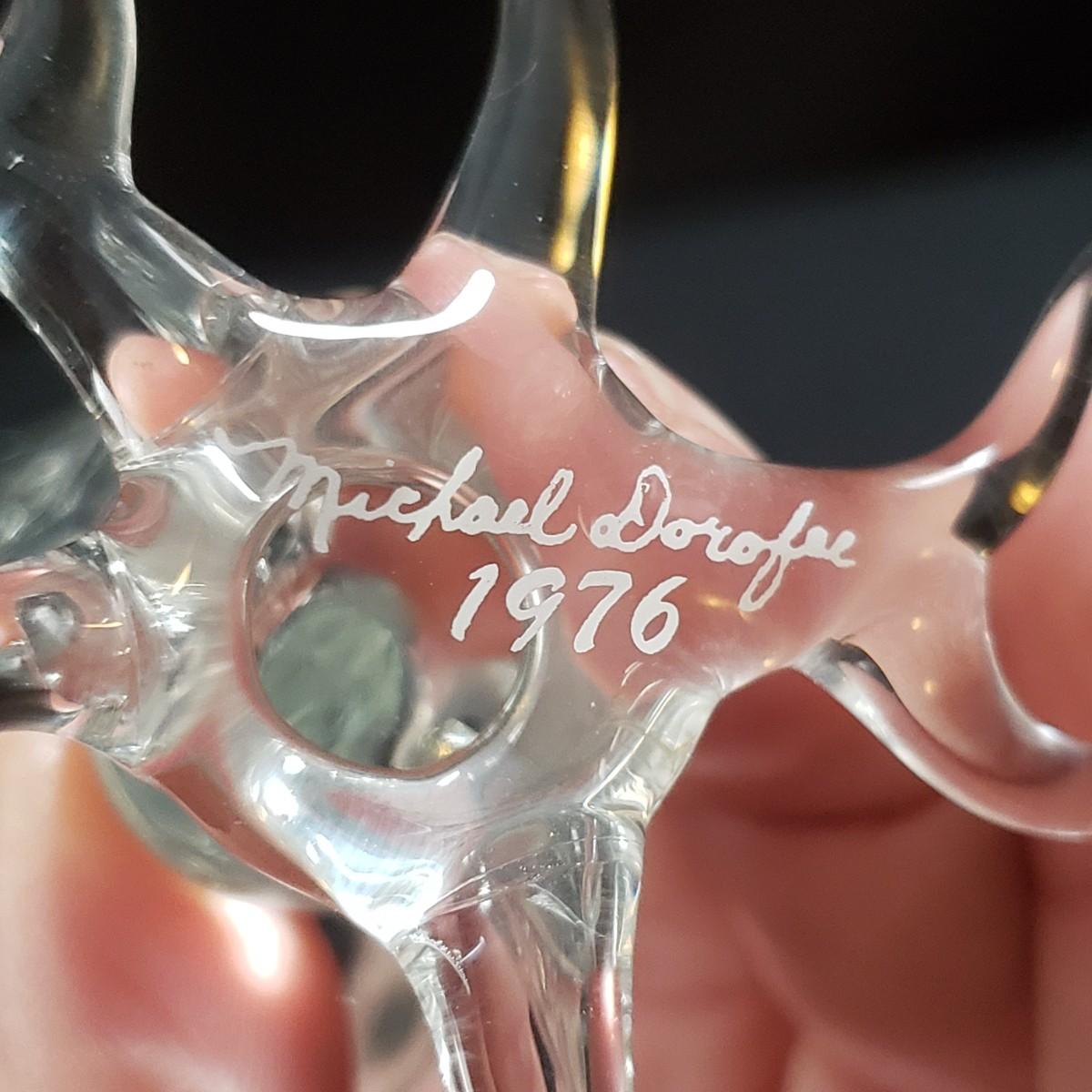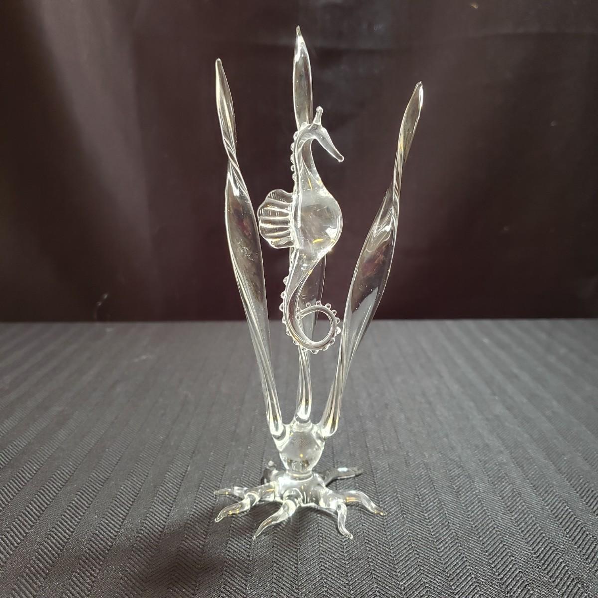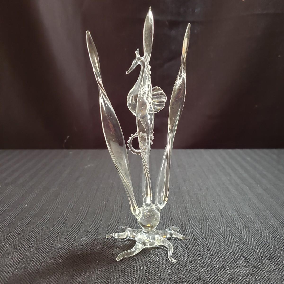 This gorgeous sealife lot features two pieces that appear to be signed/marked. A crystal Lalique fish made in France. The fish measures approximately 6" x 3" x 4"H. The scales and fins have a frosted look. There are three felted pads on the bottom. The delicate seahorse in seaweed is signed by Michael Dorofee in 1976. It looks delicate, but is solid to the touch. There is such detail on the seahorse. Both pieces appear to be blemish free.