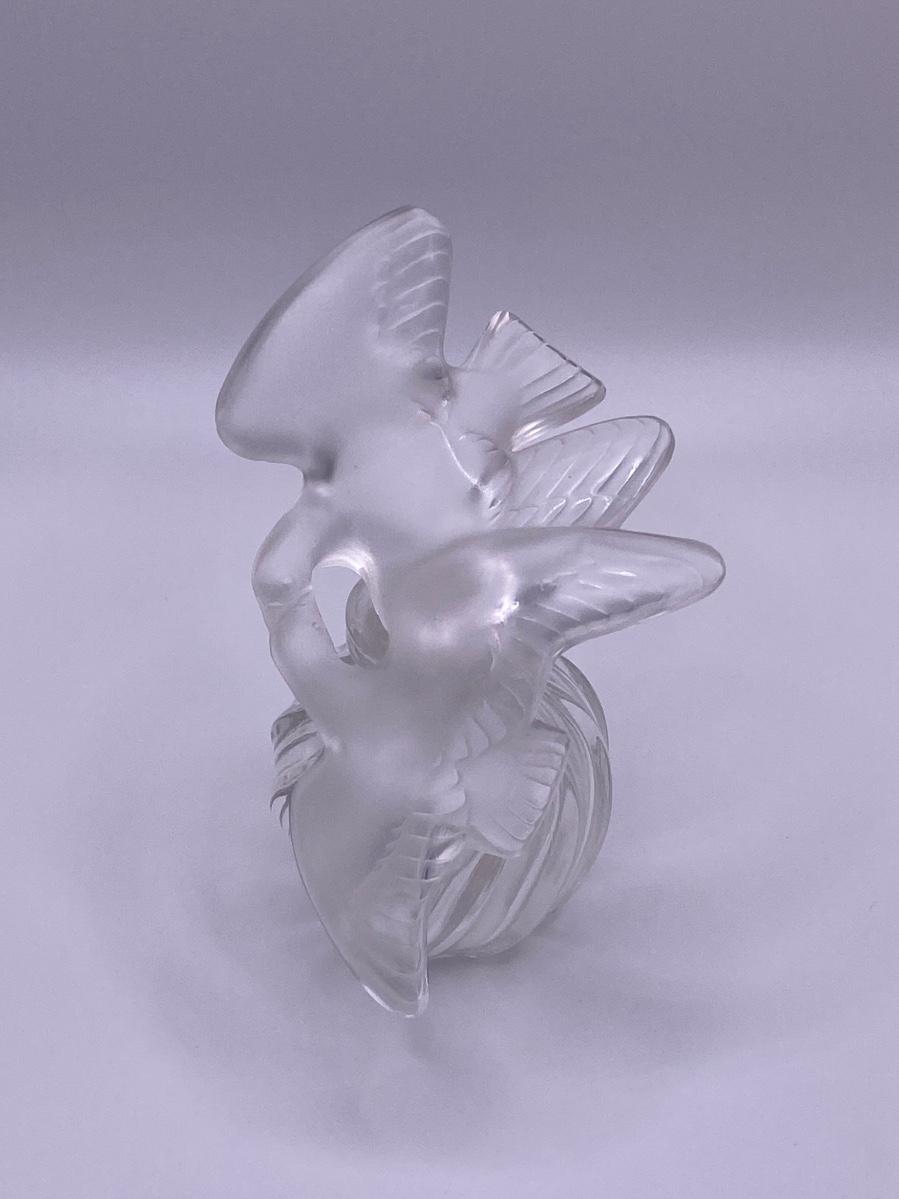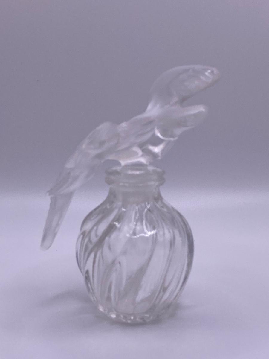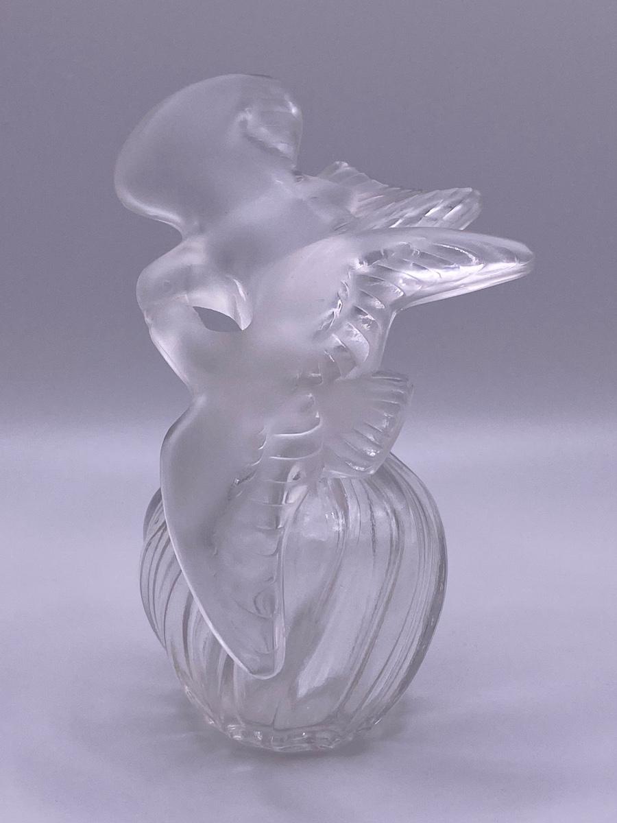 Lalique Perfume Bottle for “L’air du Temps” Perfume by Nina Ricci. The L'air du Temps design features a stopper of two frosted kissing doves on a twisted ridged bottle body.The original design for the "L'Air du Temps" perfume bottle was by the sculptor Jean Rebull, and was in the shape of a sun, but it was Marc Lalique who produced the iconic two doves atop a swirling ribbed body version, as presented here, for Nina Ricci. It was first produced in 1951 “🦆 Incidentally, Marc Lalique was friends with Nina Ricci's son Robert.