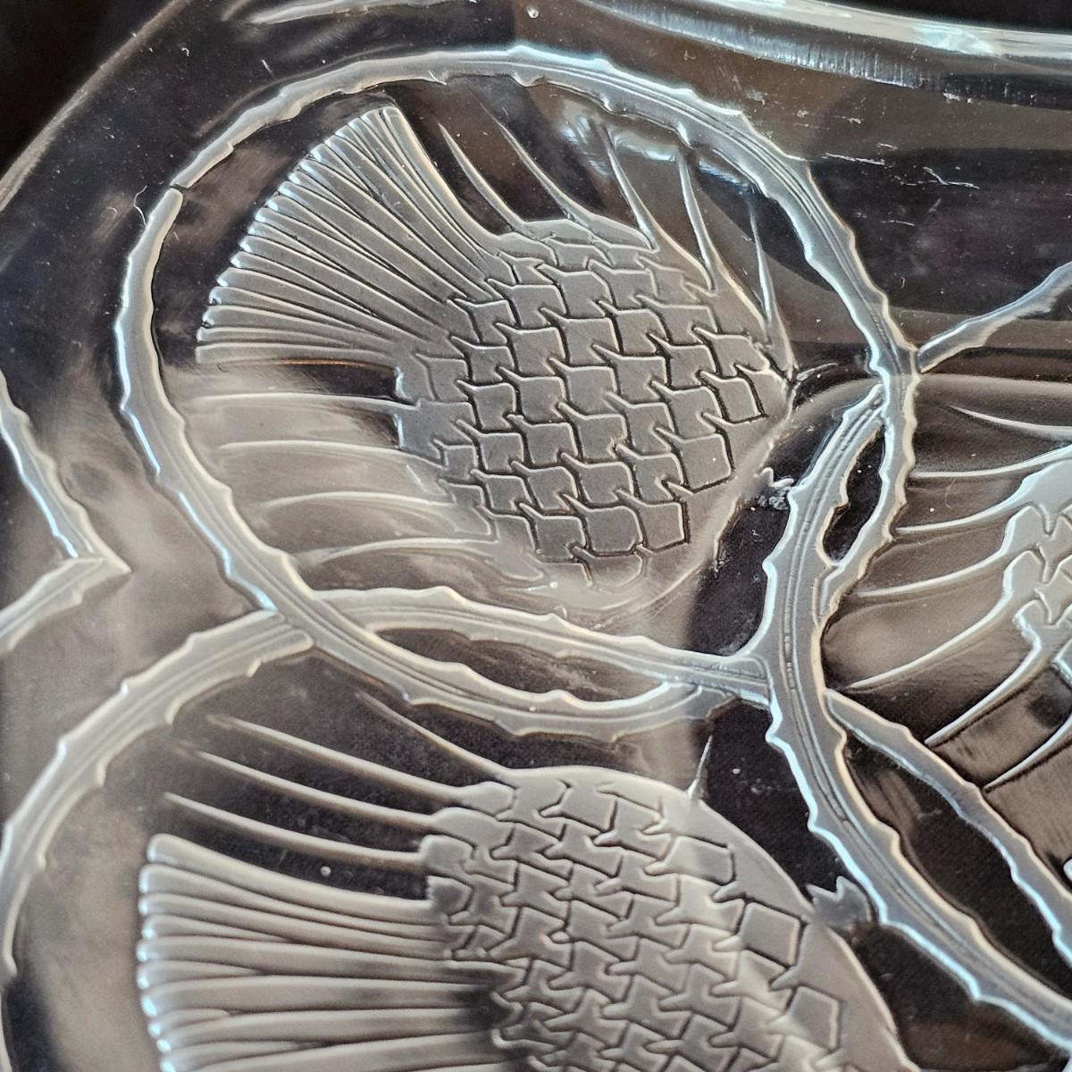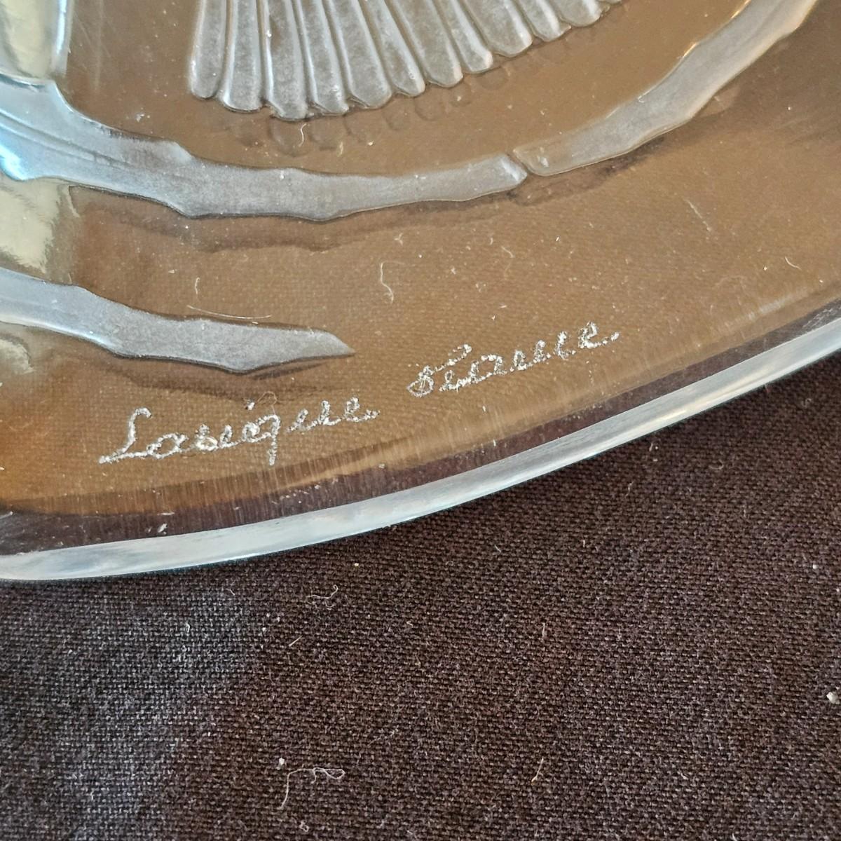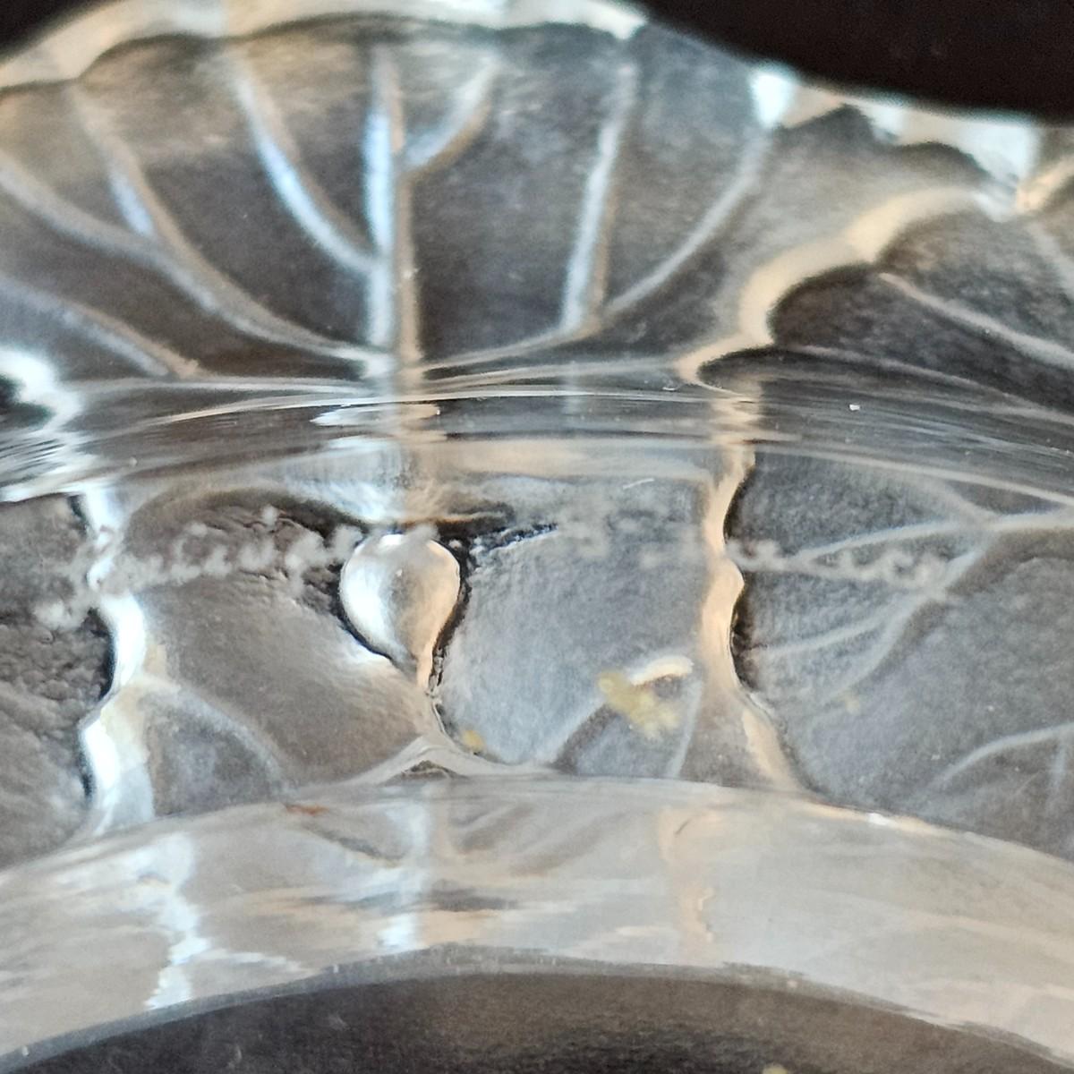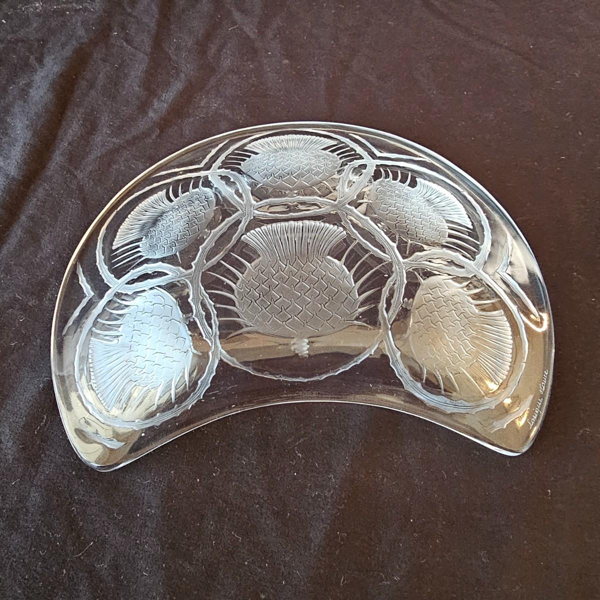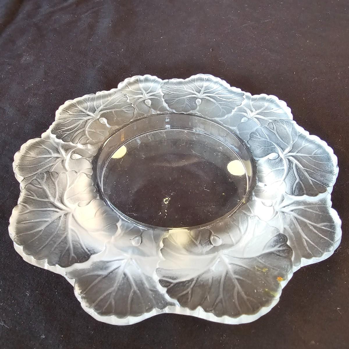 Collection of Lalique items includes a delicate frosted glass flowers and a small stopper on this perfume bottle. Flowers overlap to form the body of the item. Measures 3.5" x 1" x 3.5"H, has distinctive etched company brand. Also includes one round 5 75"D ‘Honfleur’ geranium leaf dish with frosted edges and company logo. Third piece has a scooped edge top and decorative images in the body. Measures 8" x 6.5". Also signed. See photos for details. Shipping available.