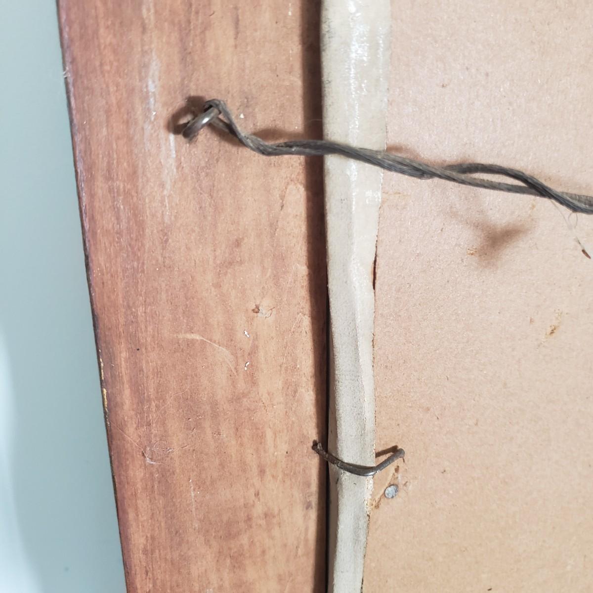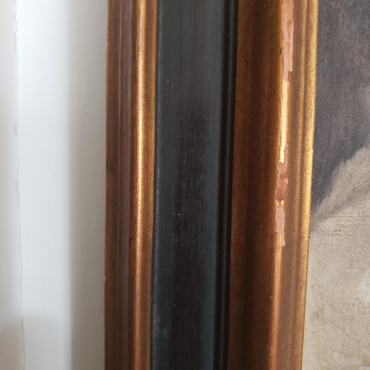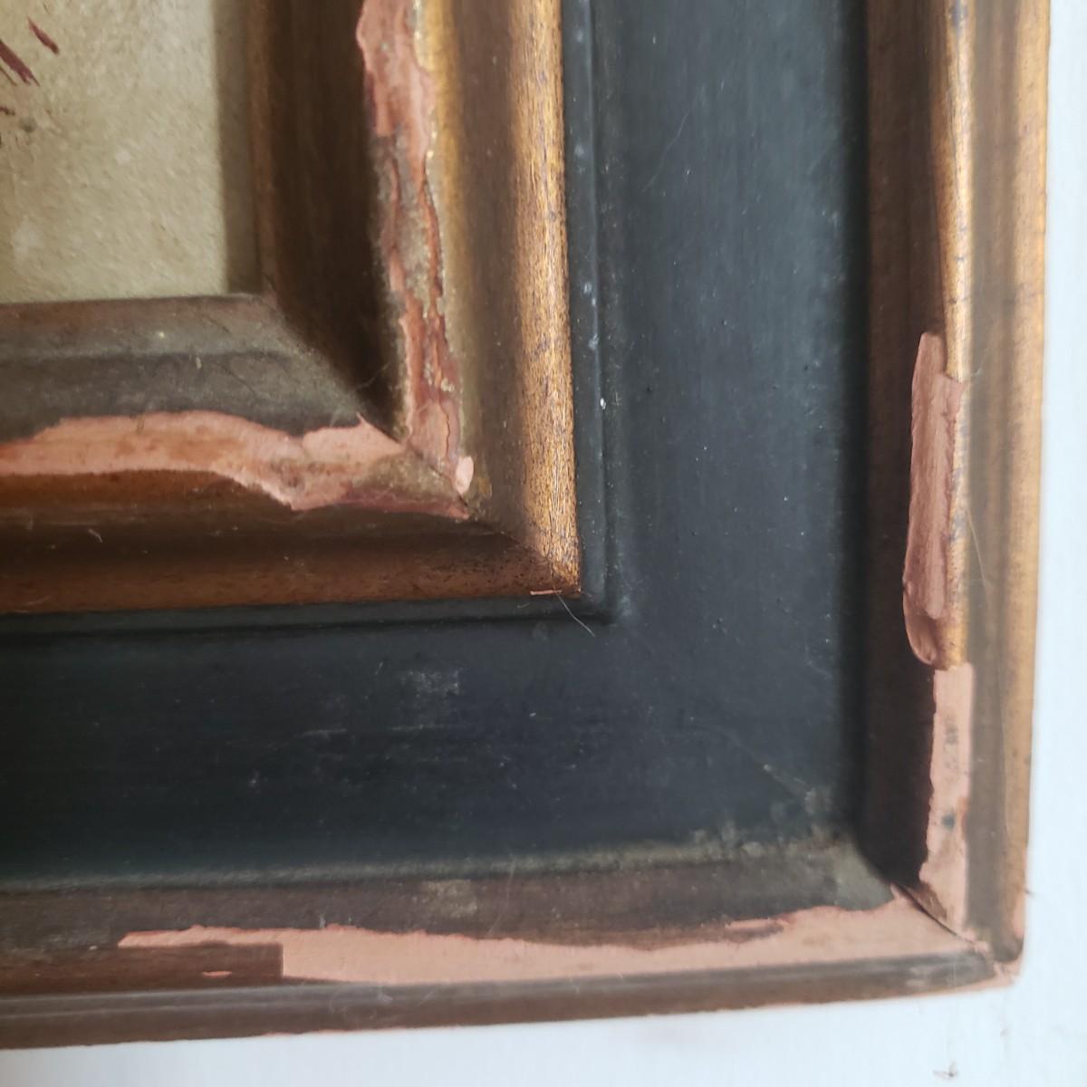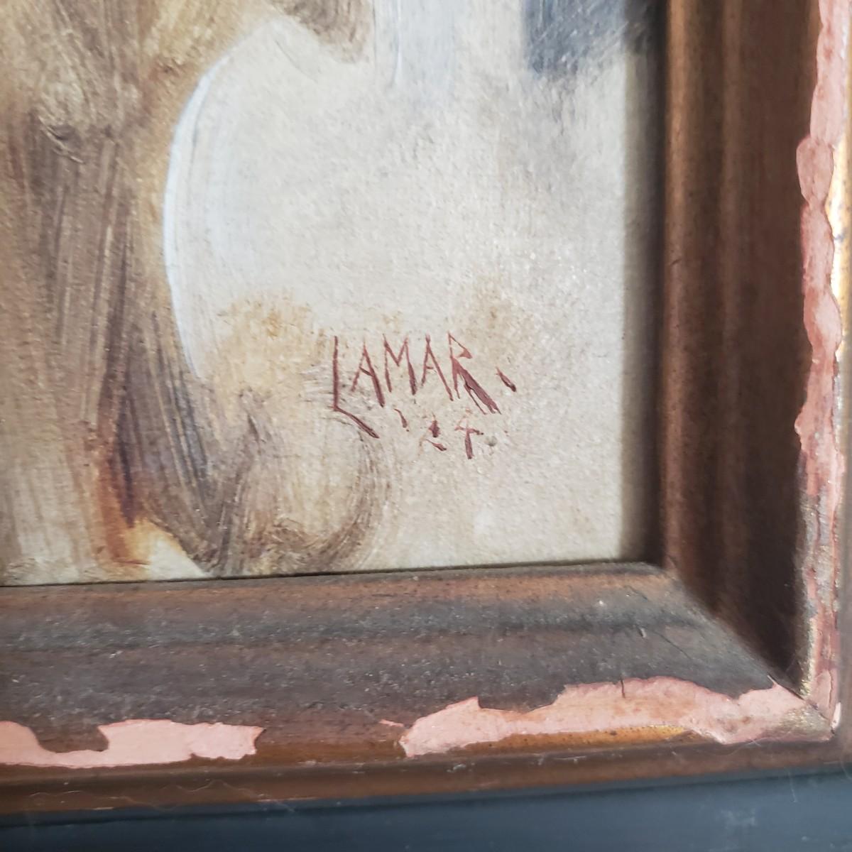 This signed oil painting by Lamar features a young girl. The wooden frame painted black on the inside rim does not come with glass. The frame measures 17" x 20"H. There are paint chips on the front of the frame, see pictures.