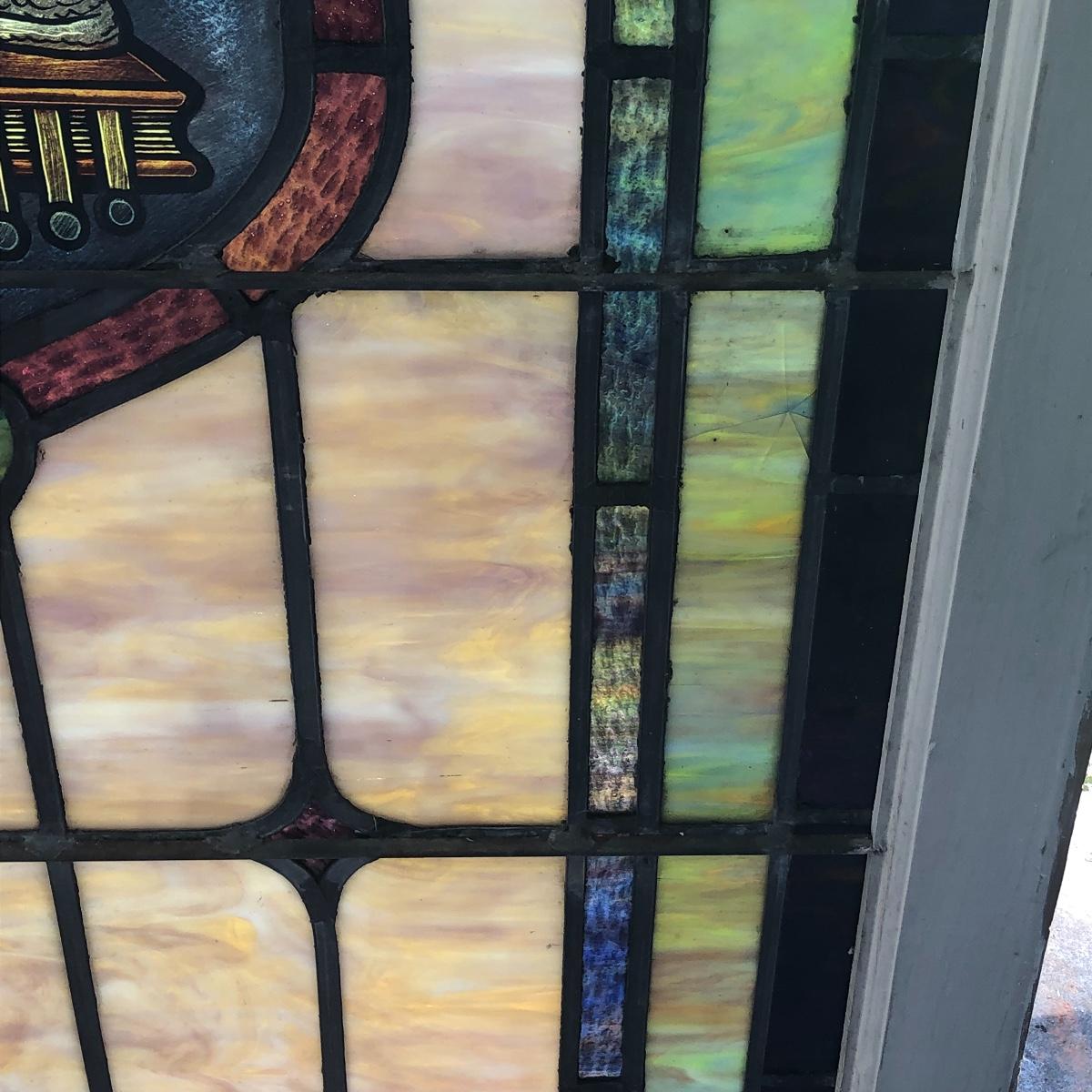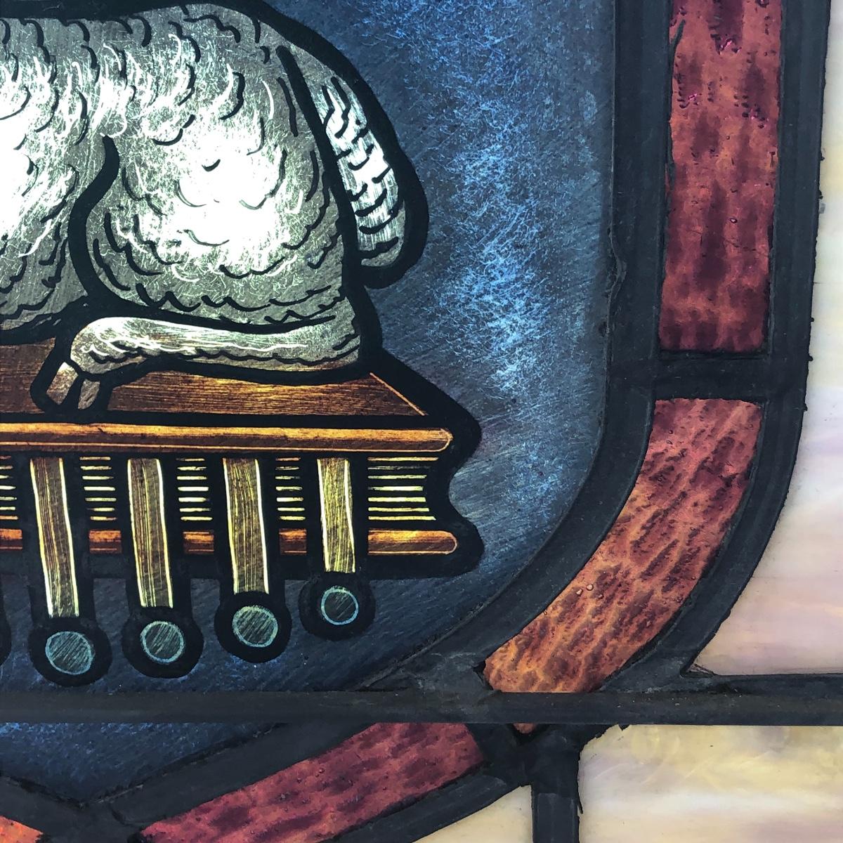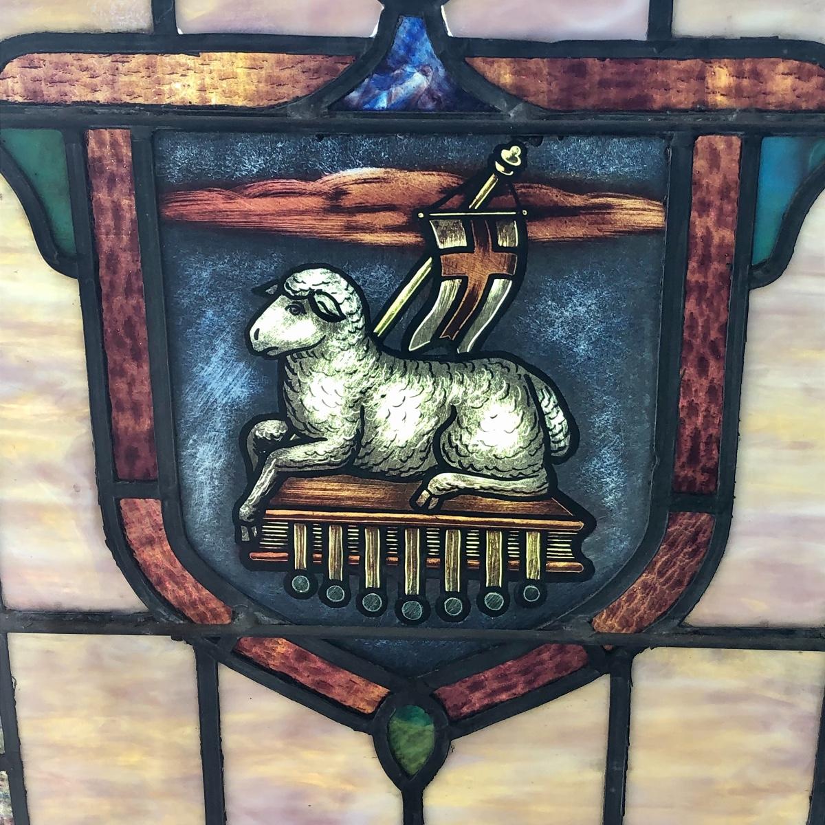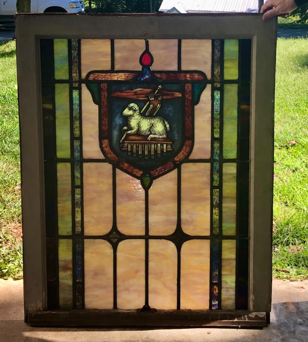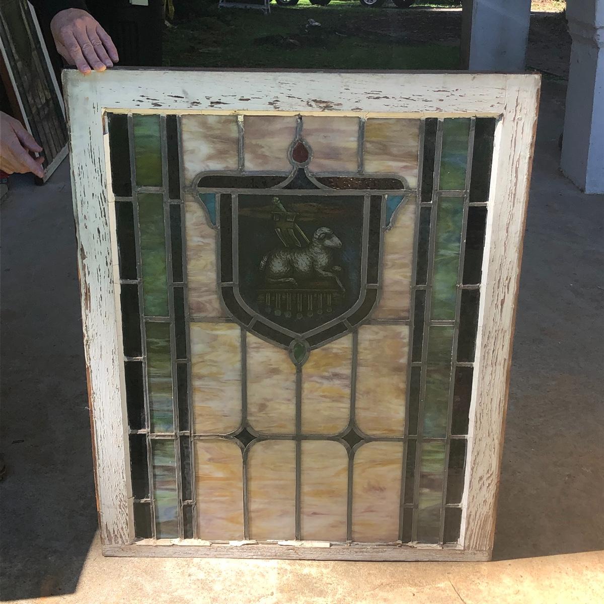 Lot 2 of 10, this stained glass has the Lamb of God. Some of the glazing is missing but otherwise it’s in good condition.