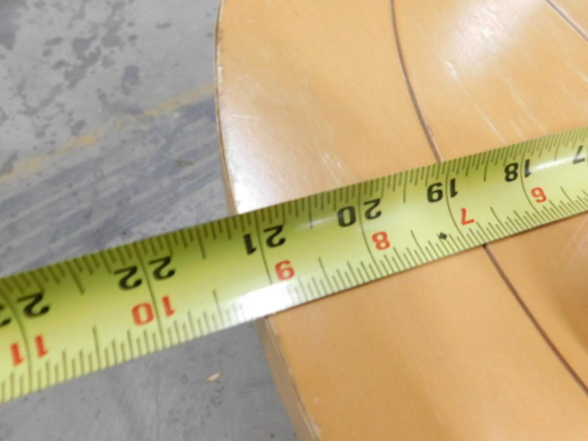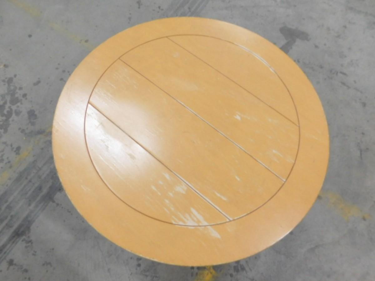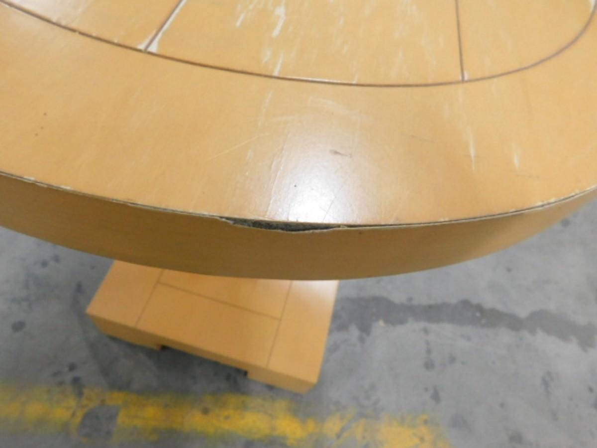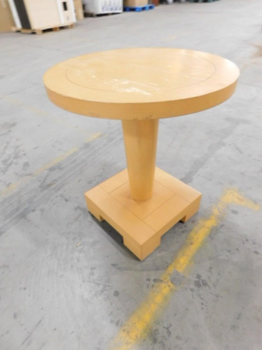 Laminate Wood Finish Pedestal Accent Table. Has some finish missing on surface as pictured. Shipping option available via freight or local mover at Buyer's expense. Buyer must have all shipping scheduled within the stated dates and times of pickup. Recommended local mover is Beaty Bros. Moving 828-201-2982
