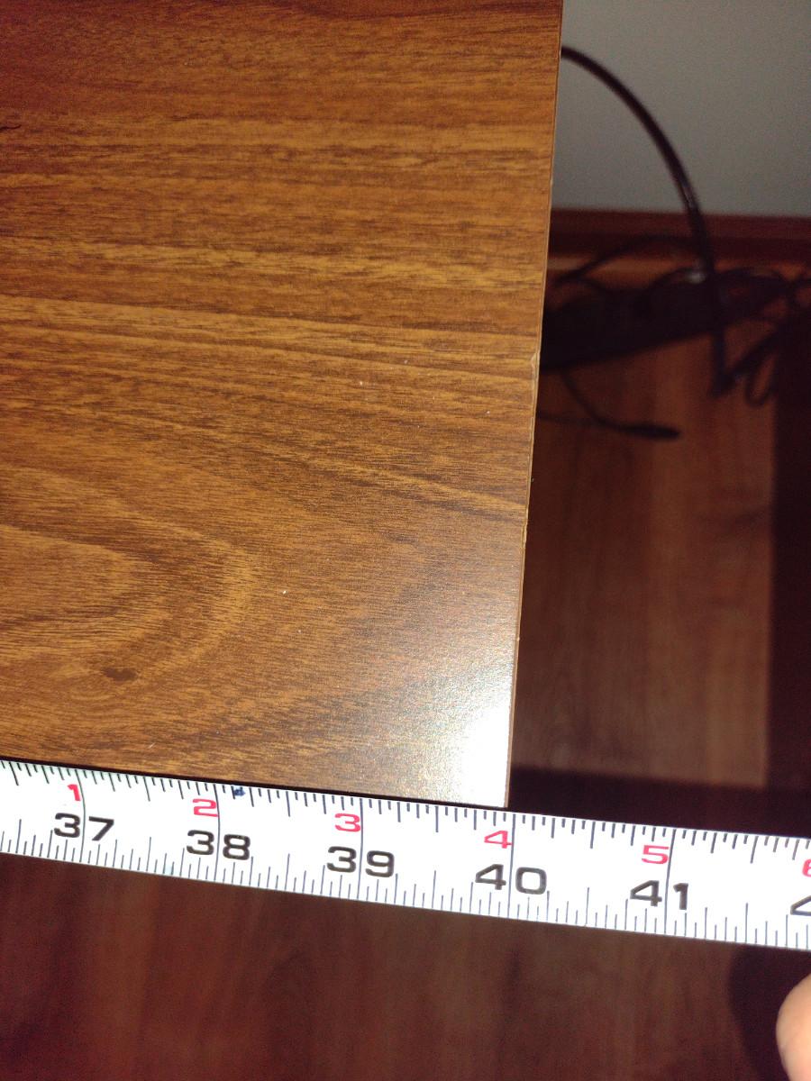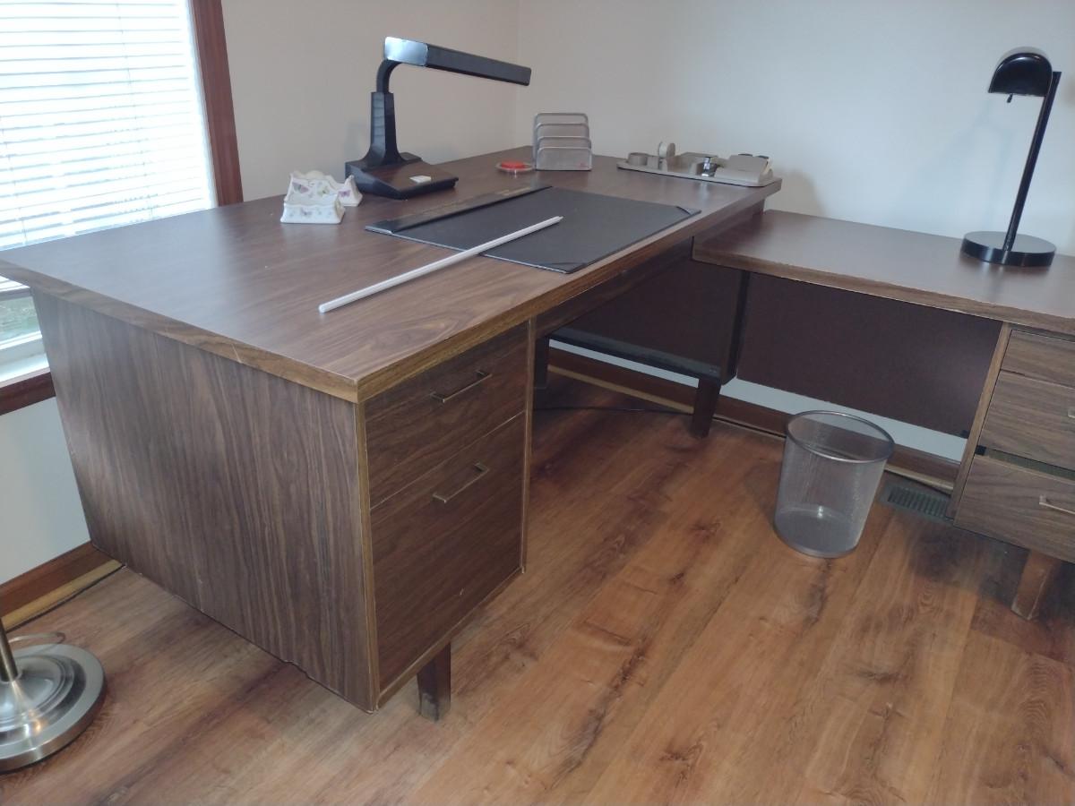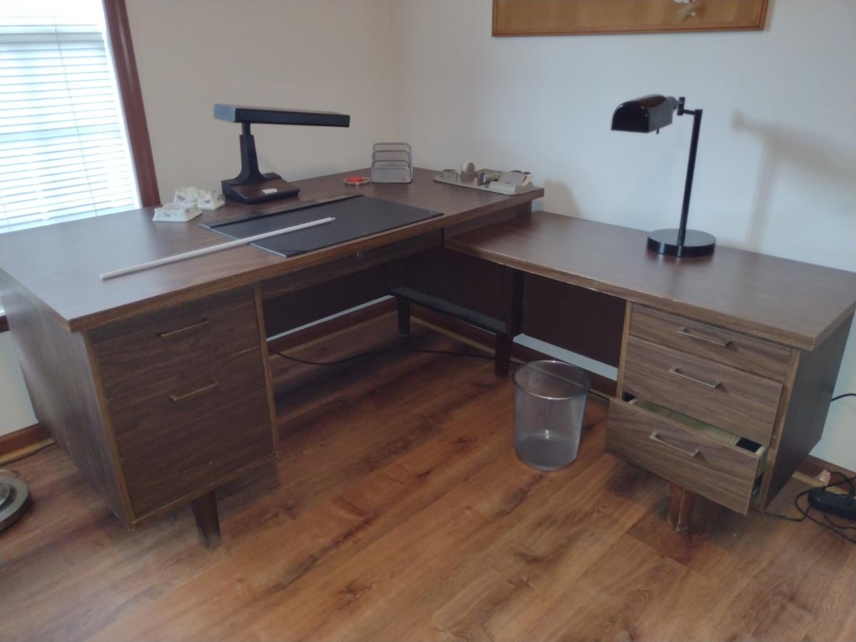 Laminate Wood Grain Finish 'L' Shaped Office Desk. No contents. Please bring tools to take apart.