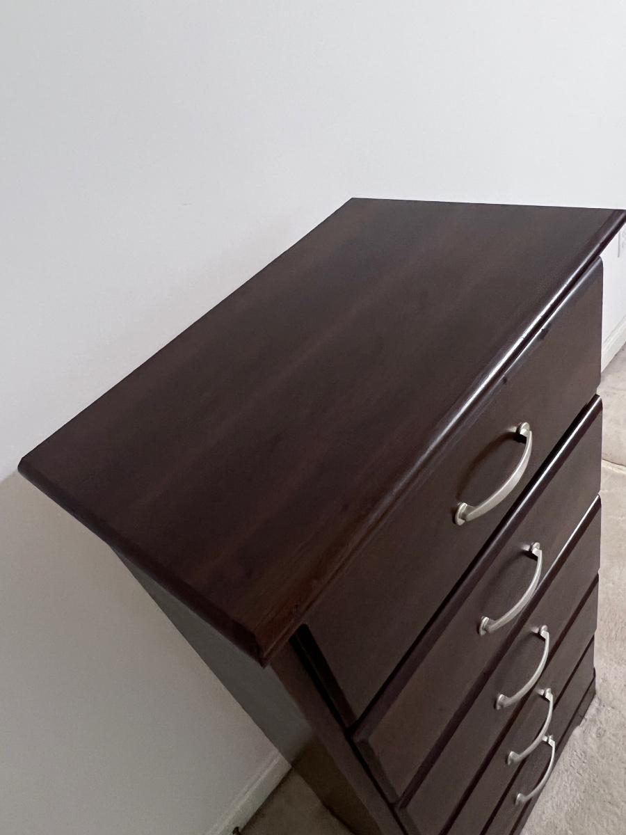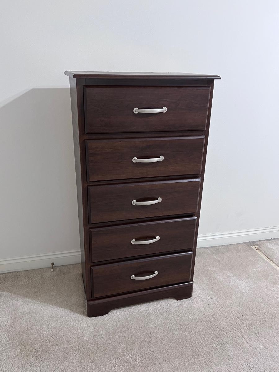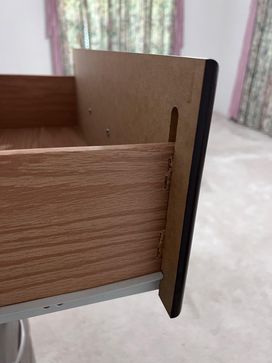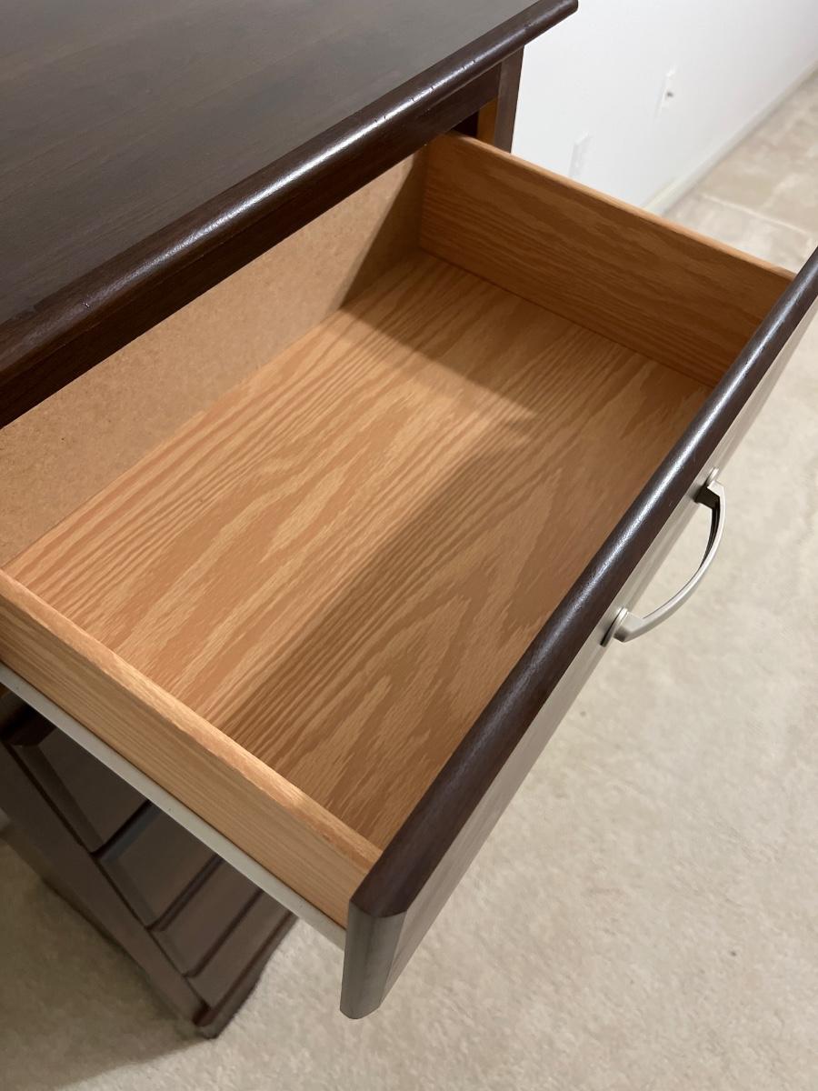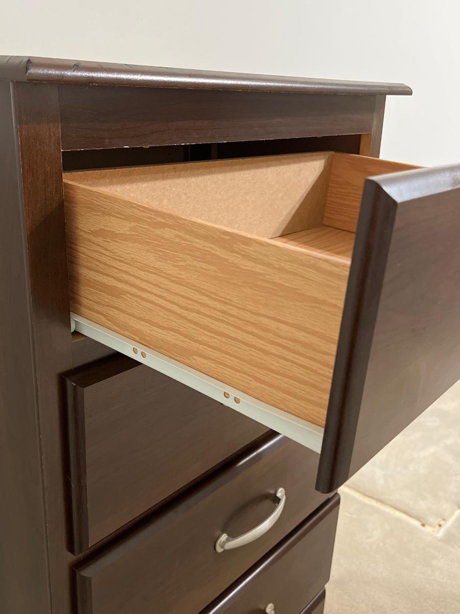 Drawers slide in & out easily. Made of a MDF material. No name brand found. 48” H x 25.25” W x 16.5” D.