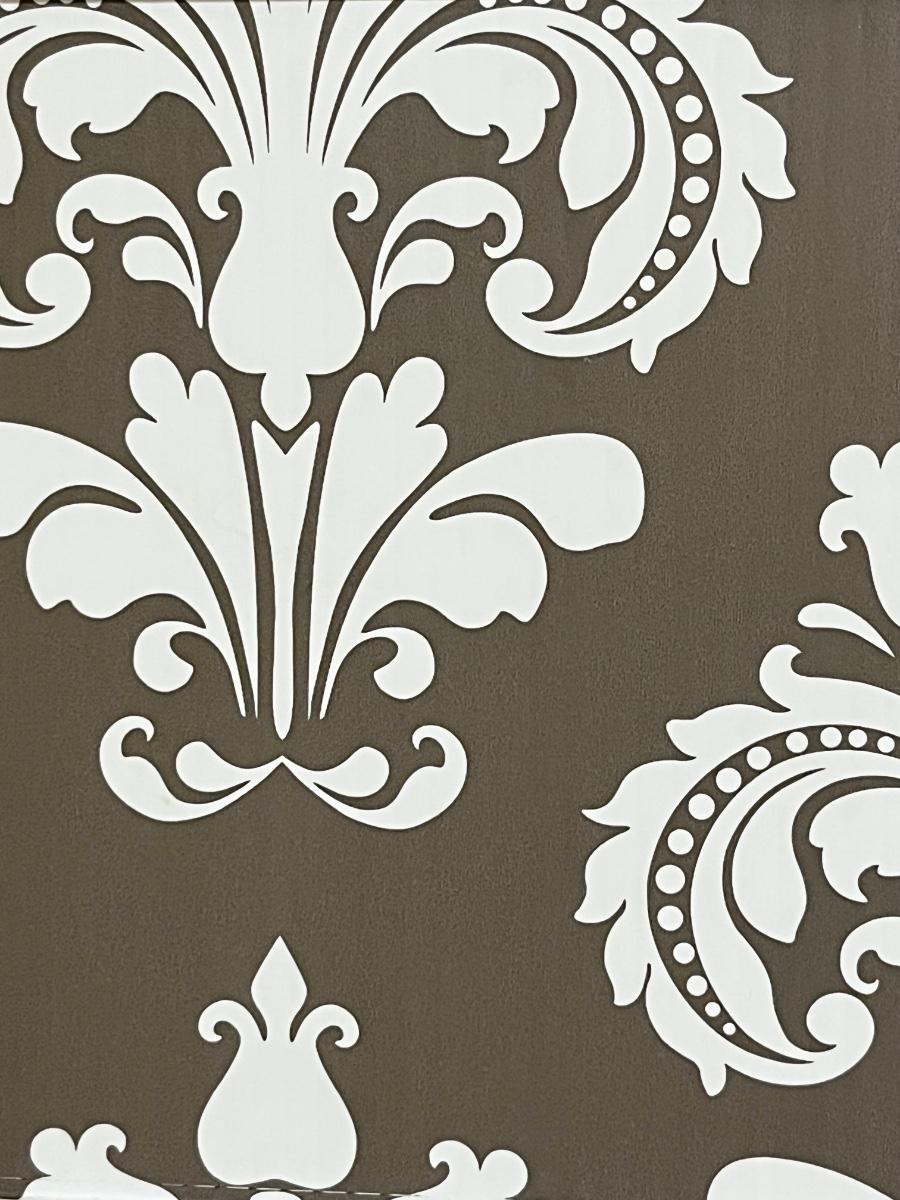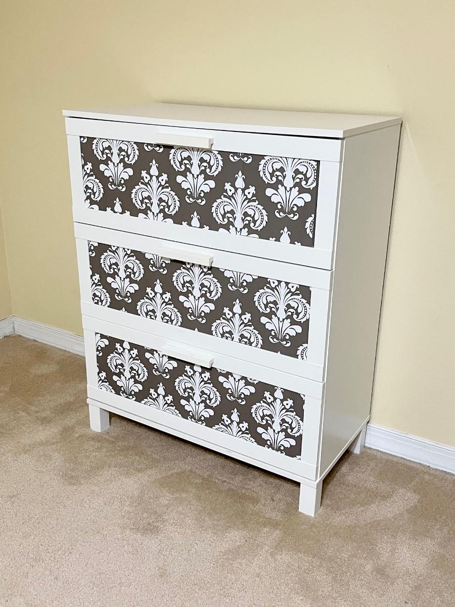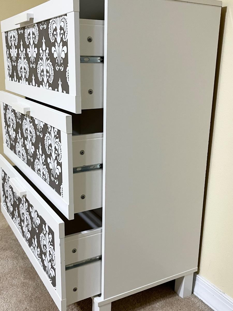 No brand name found ~ Drawers slide very easily ~ Front of drawers are made of ribbed plastic that has been covered in a stylish wallpaper pattern ~ 39” H x 31.5” W x 16” D