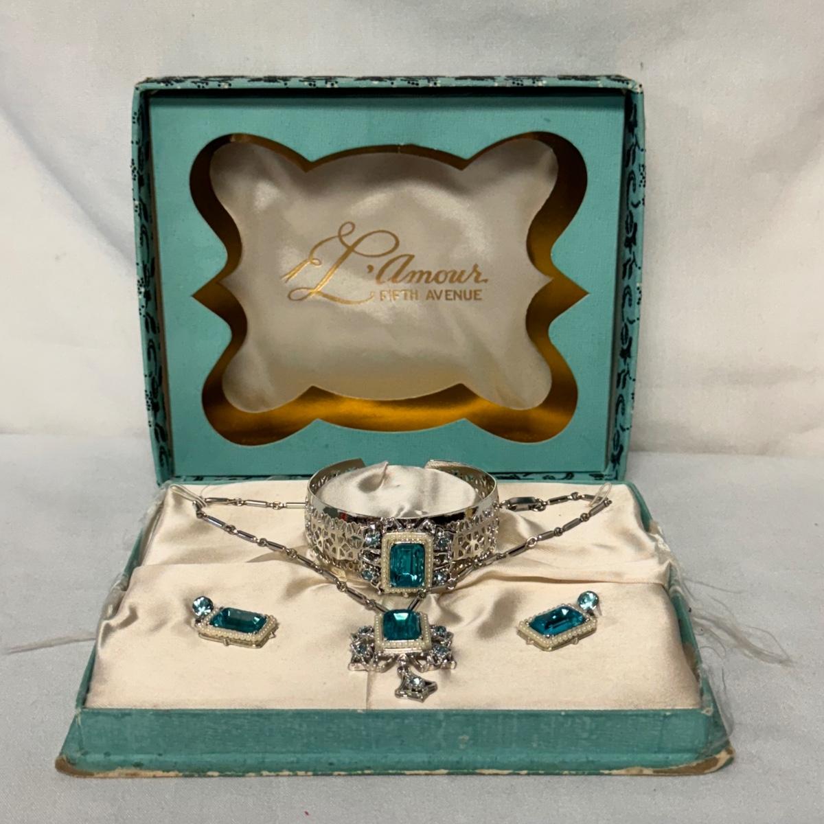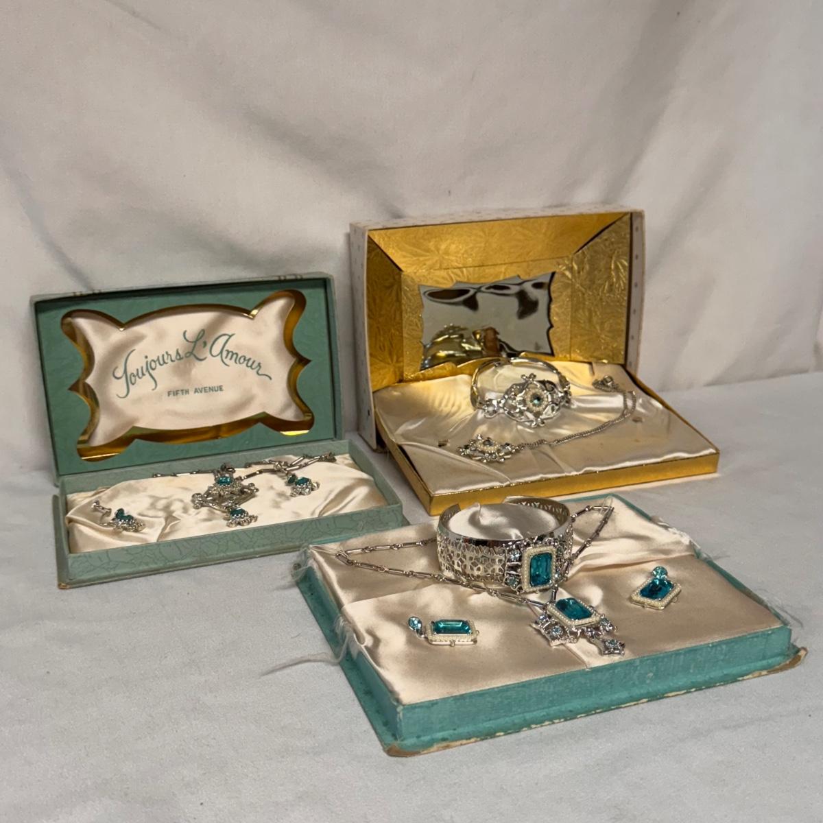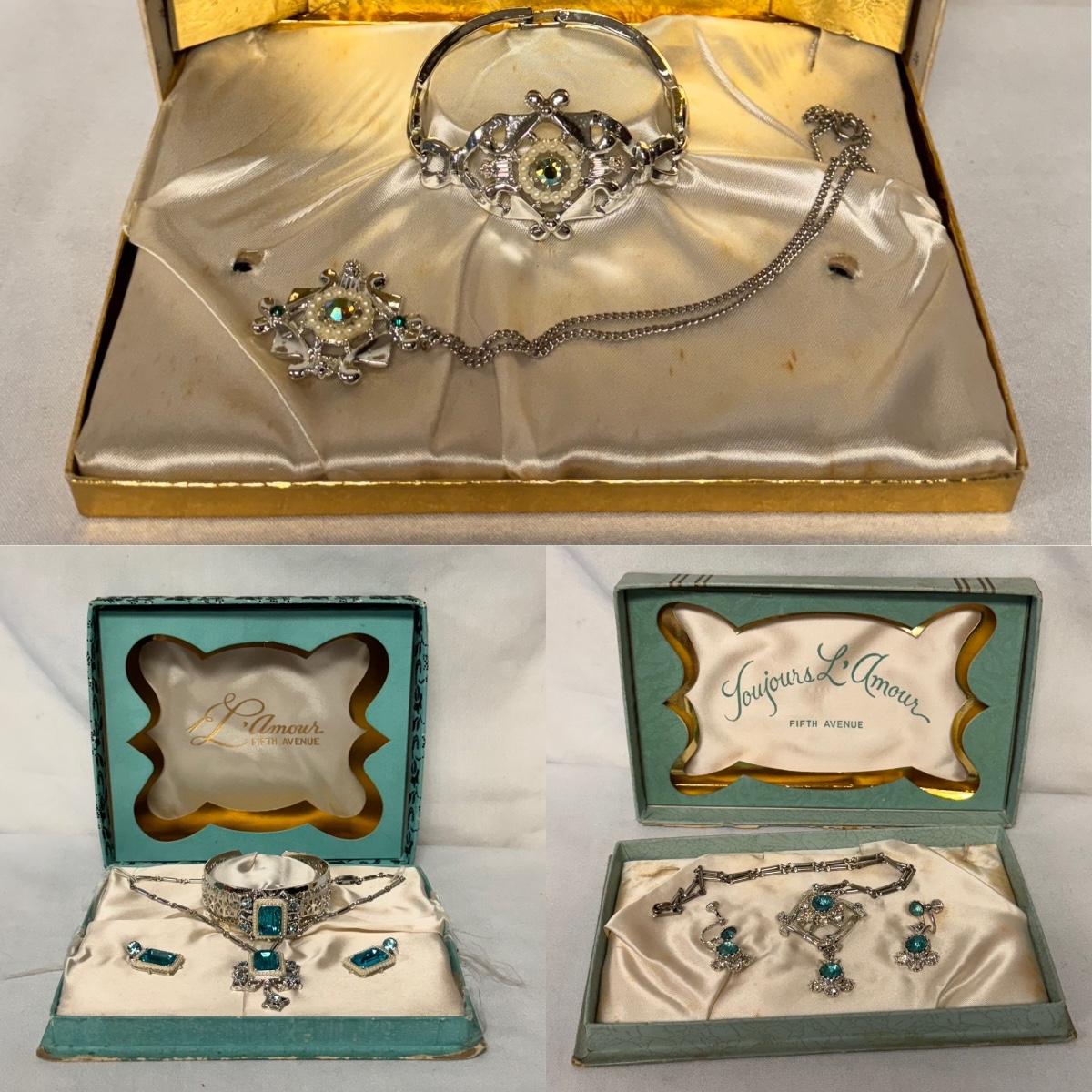 This lot includes two jewelry sets in their original boxes from L’Amour Fifth Avenue and one jewelry set with no tag or label. The first Fifth Avenue jewelry set pictured individually contains a necklace that can be used as a pin and two clip on earrings. The second Fifth Avenue box contains a bracelet, clip-on earrings and a necklace. Neither jewelry piece is marked but appears to be stored in its original box. The third, unlabeled box contains a bracelet and a necklace. The bracelet is 6.5” fully opened. Shipping available. Shipping available. All sales final. Nor returns or refunds. Please bid accordingly.