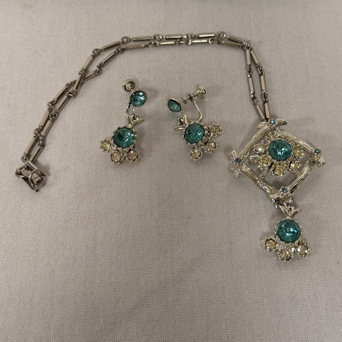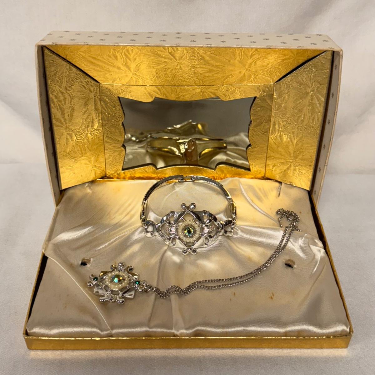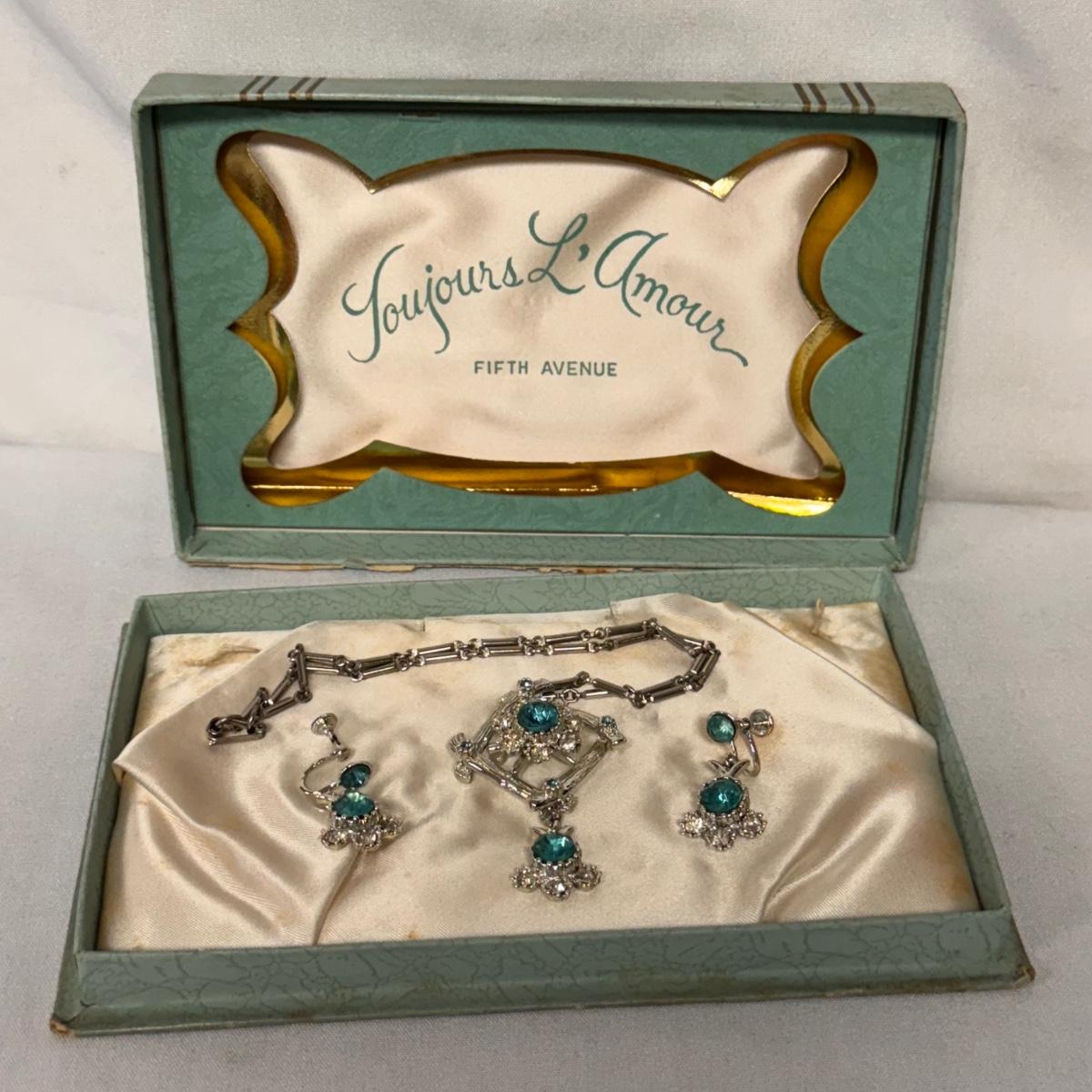 This lot includes two jewelry sets in their original boxes from L’Amour Fifth Avenue and one jewelry set with no tag or label. The first Fifth Avenue jewelry set pictured individually contains a necklace that can be used as a pin and two clip on earrings. The second Fifth Avenue box contains a bracelet, clip-on earrings and a necklace. Neither jewelry piece is marked but appears to be stored in its original box. The third, unlabeled box contains a bracelet and a necklace. The bracelet is 6.5” fully opened. Shipping available. Shipping available. All sales final. Nor returns or refunds. Please bid accordingly.