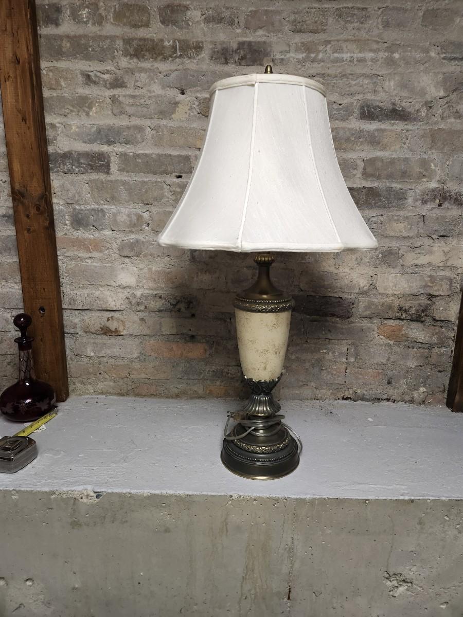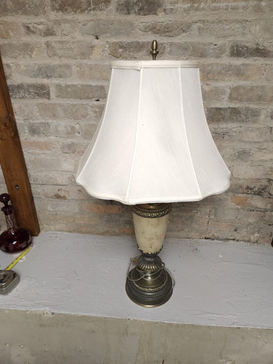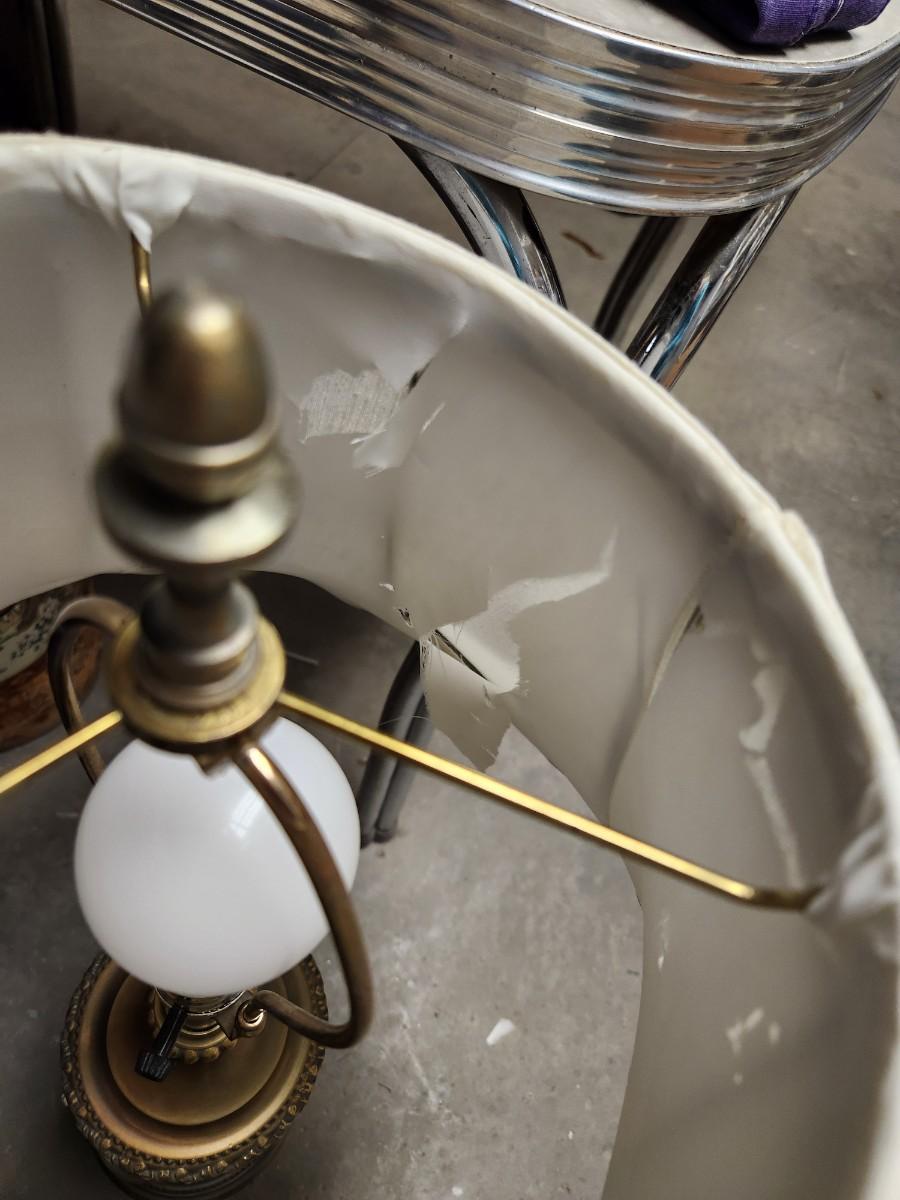 Very heavy lamp. Brass and ceramic. Shade has seen better days