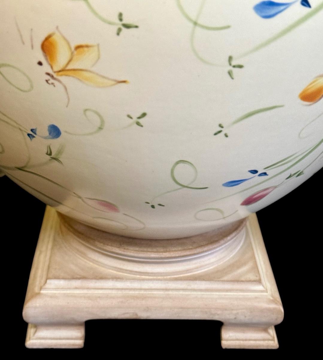 This floral painted decorative lamp has a wooden base.