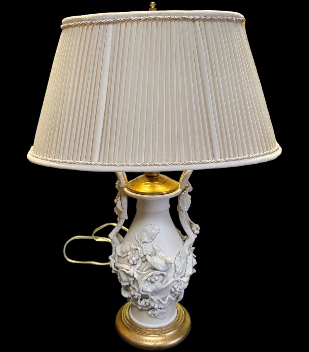 This lamp's base ( possibly porcelain ) has intricate application of leaves and birds. It sits on a wooded gilded base